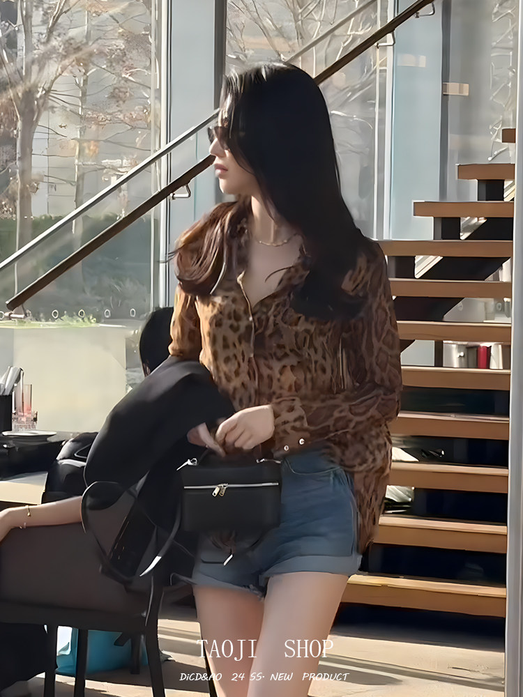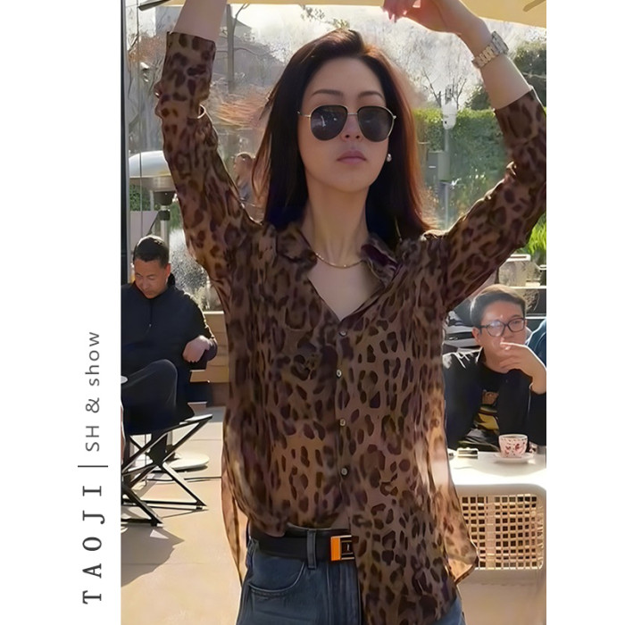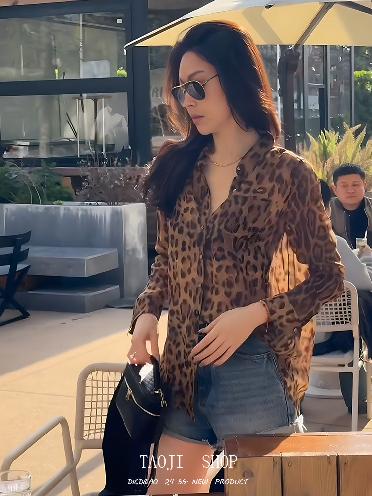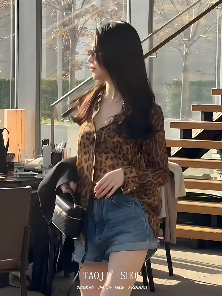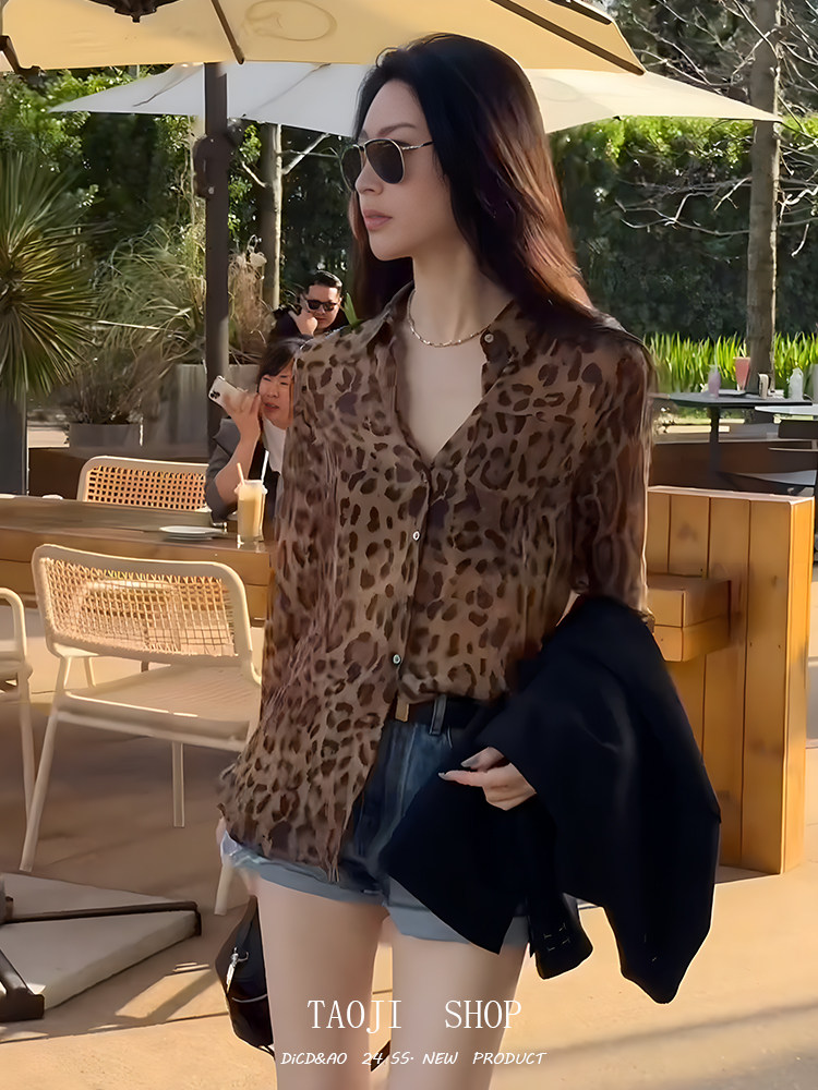 歐貨復古氣質豹紋長袖防曬襯衫女春夏薄款雪紡衫設計感寬鬆小上衣