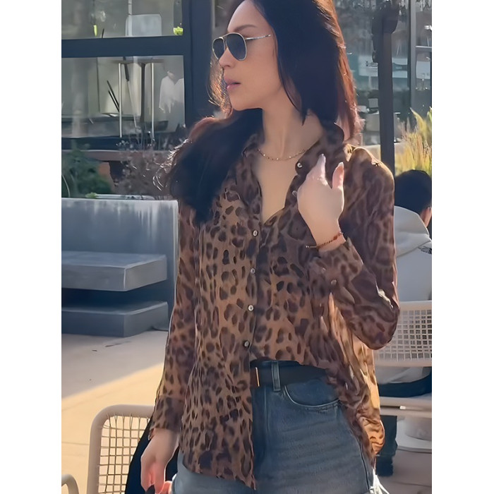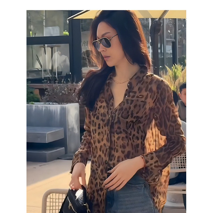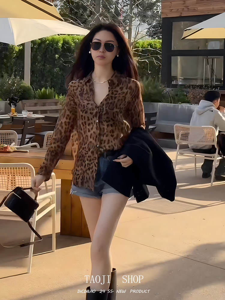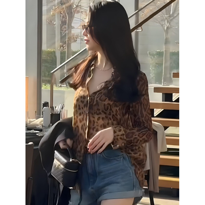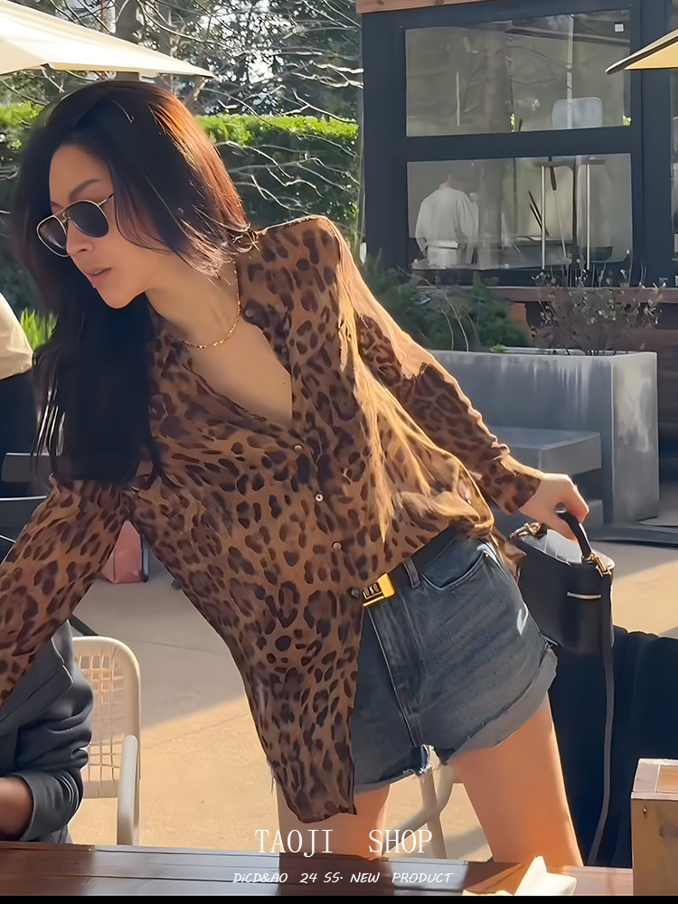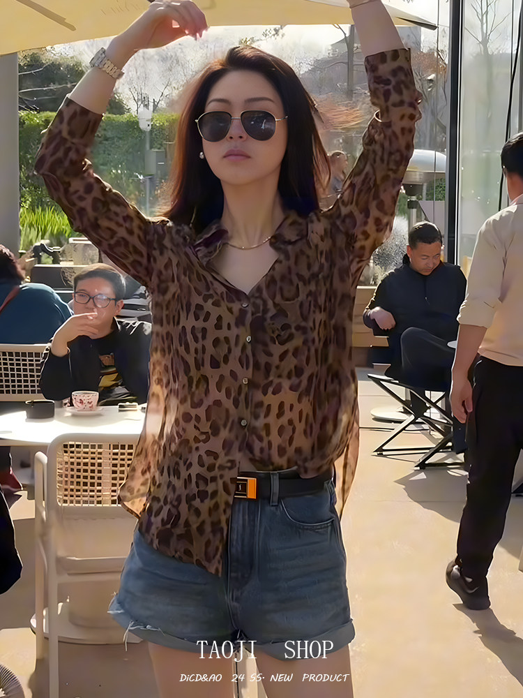 歐貨復古氣質豹紋長袖防曬襯衫女春夏薄款雪紡衫設計感寬鬆小上衣