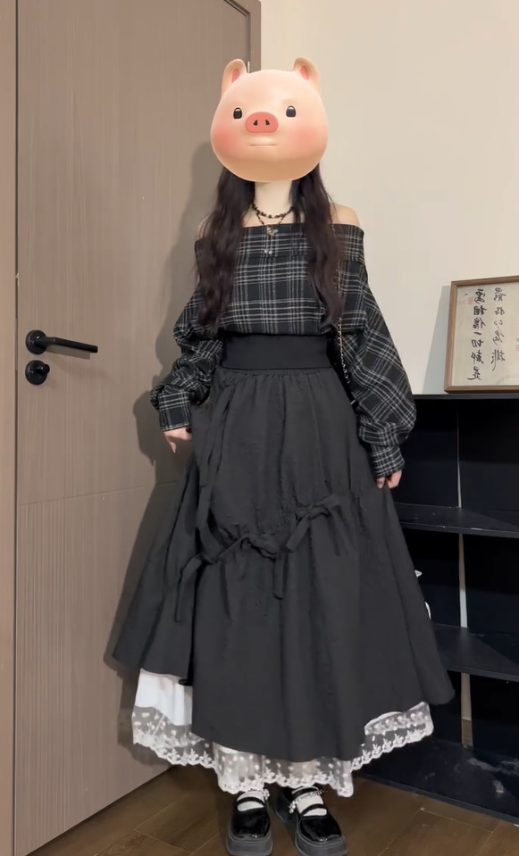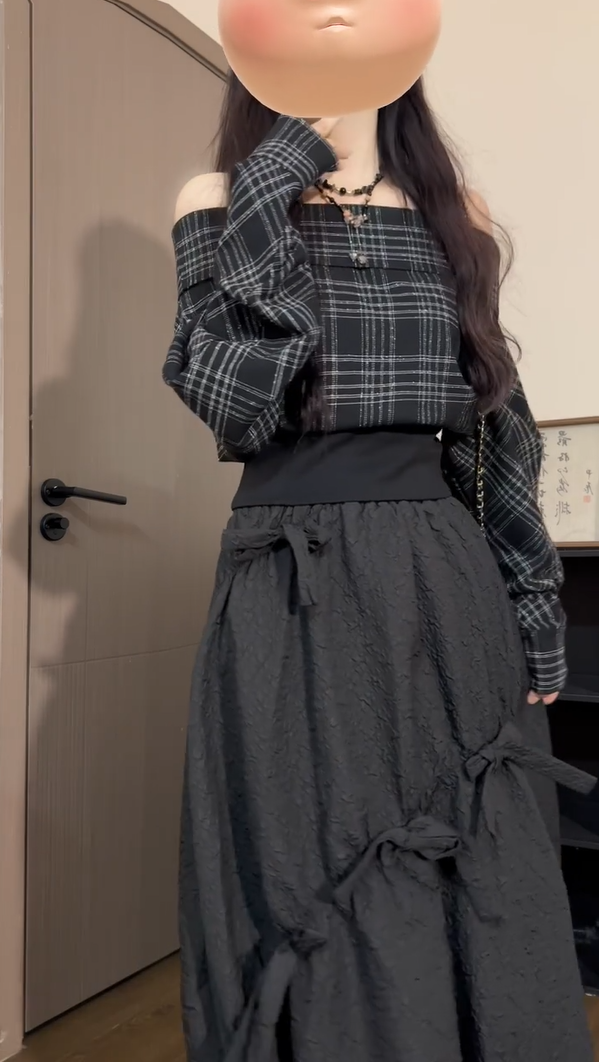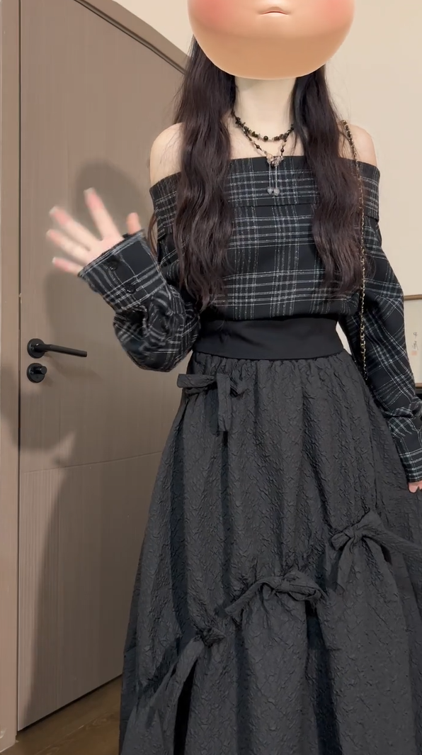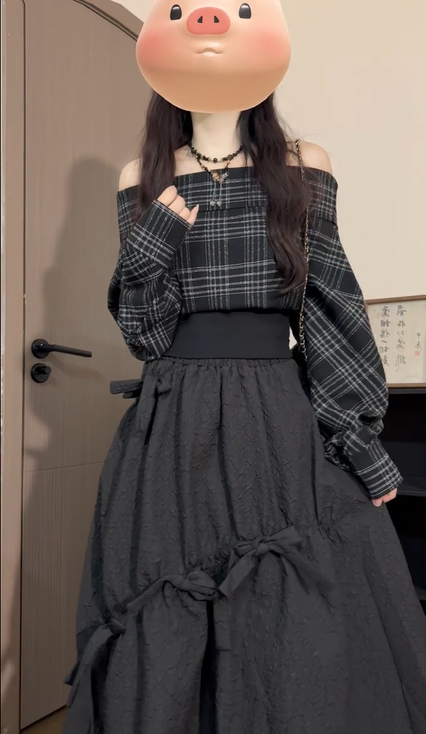 辣妹黑色格紋一字肩襯衫女秋季慵懶風簡約設計感氣質收腰長袖上衣