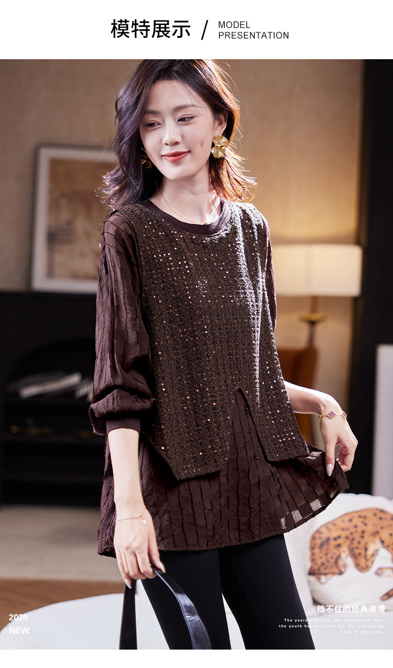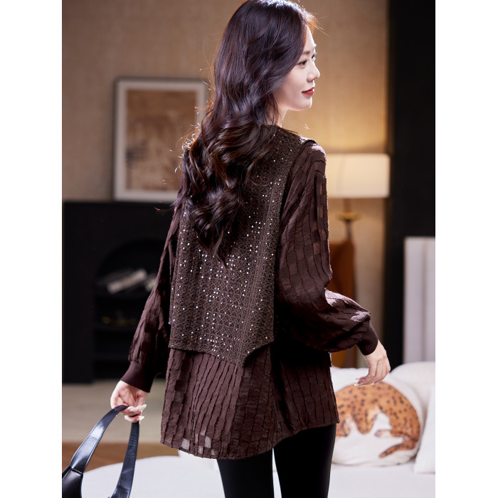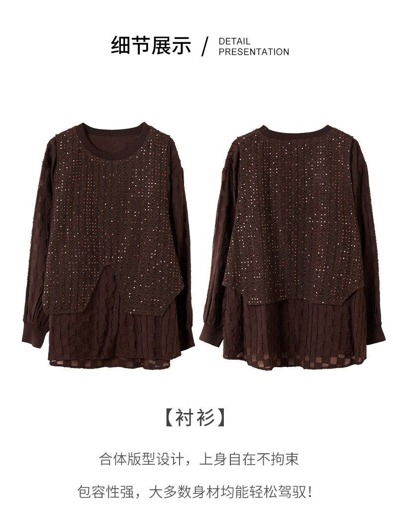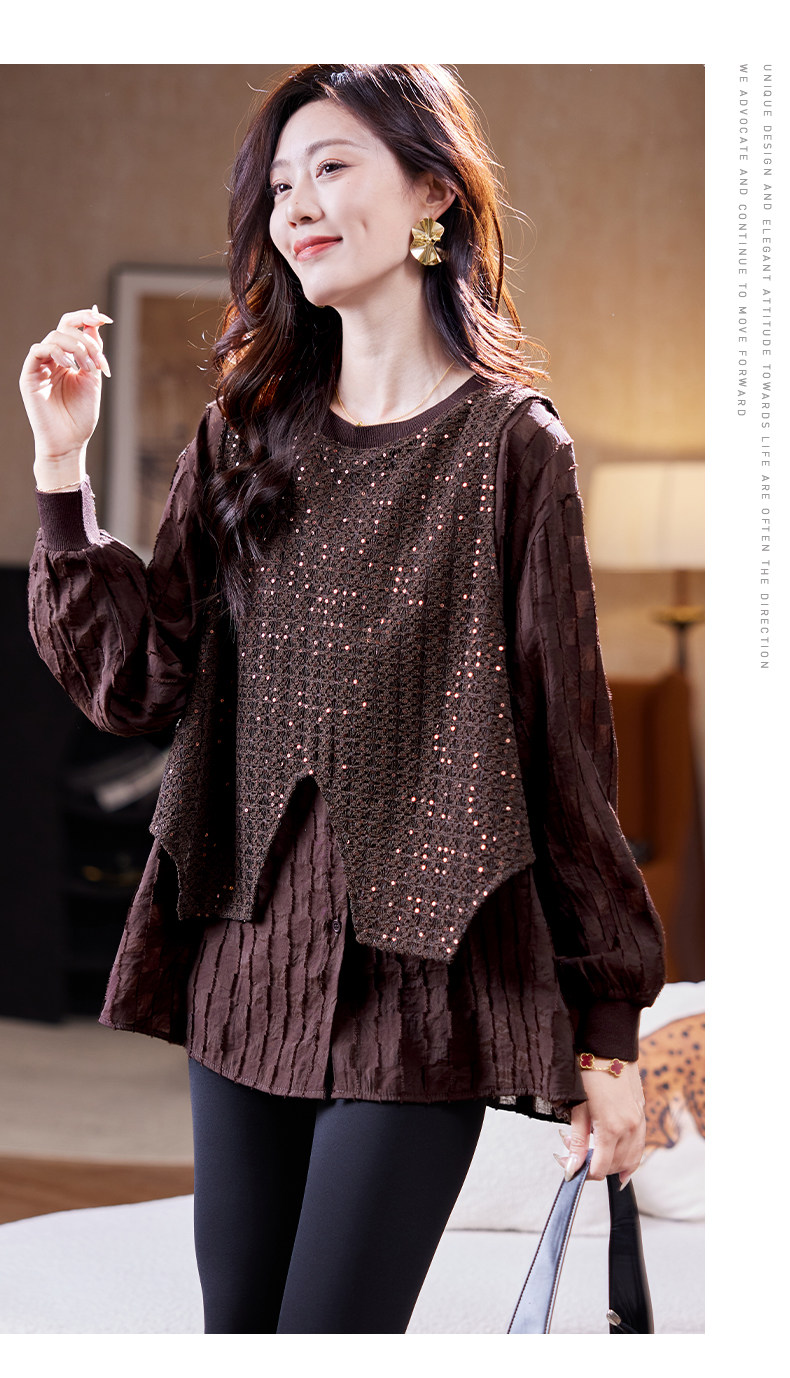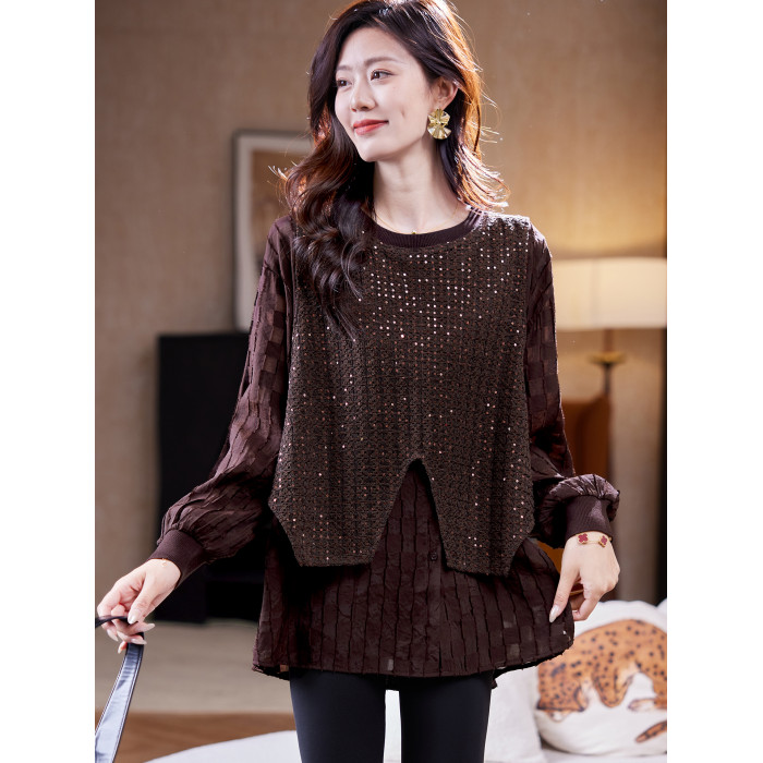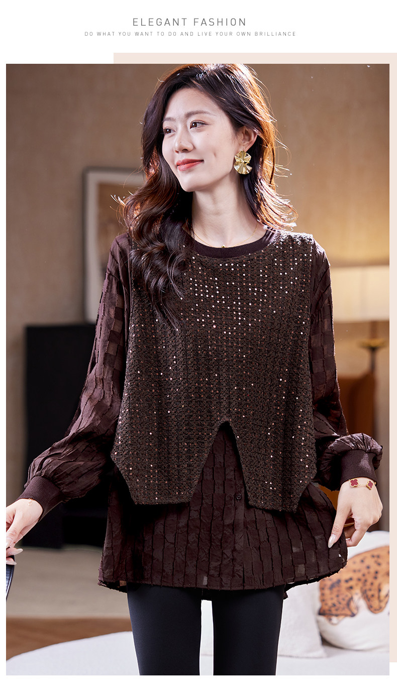 寶詩黎假兩件亮片拼接襯衫2026春季洋氣休閒寬鬆大碼長袖襯衣女