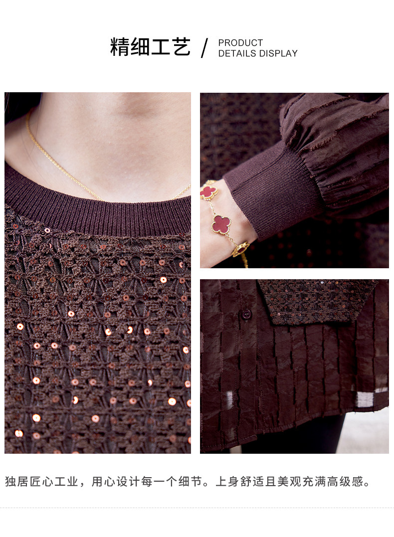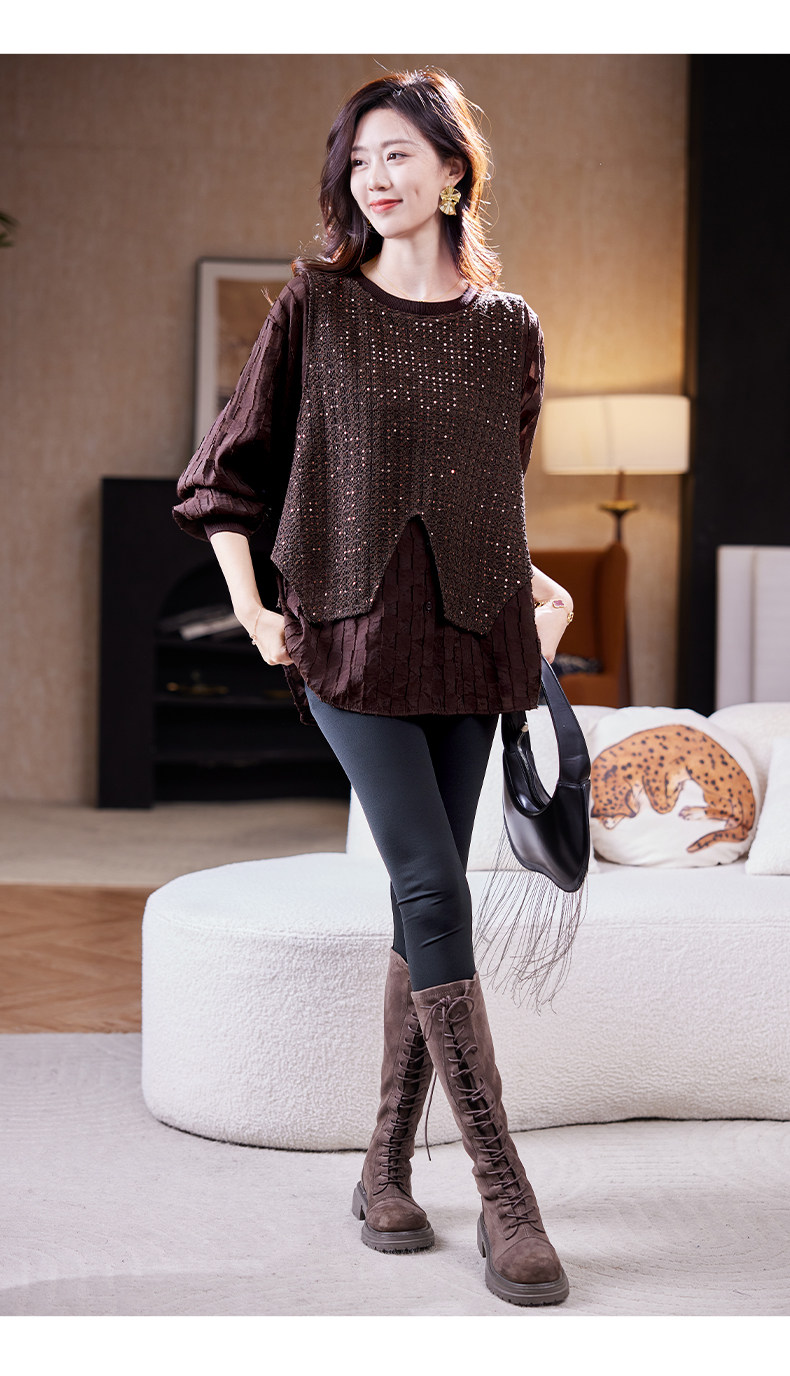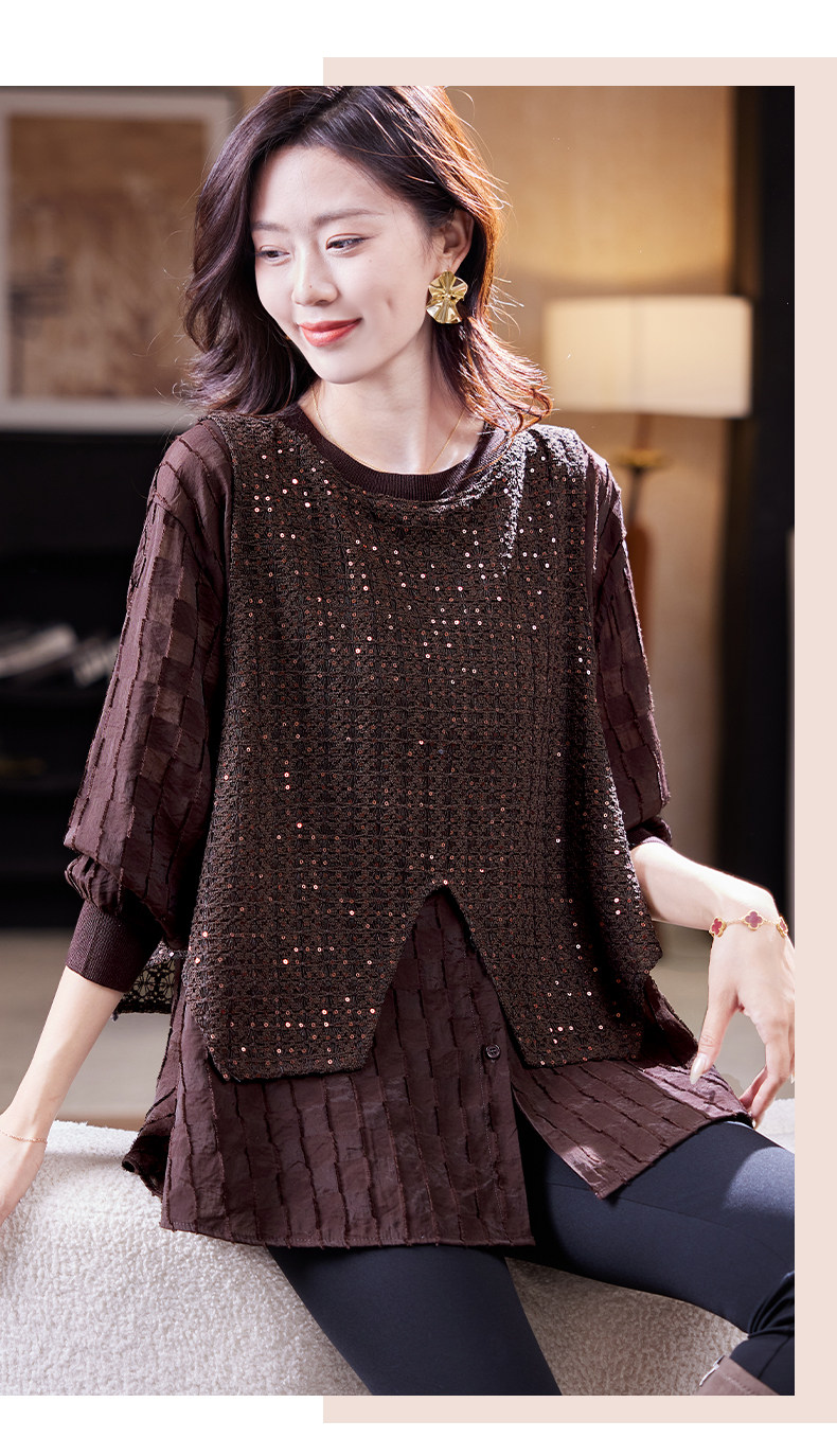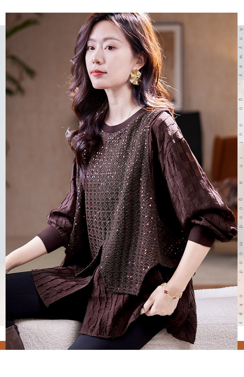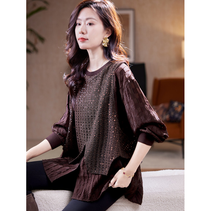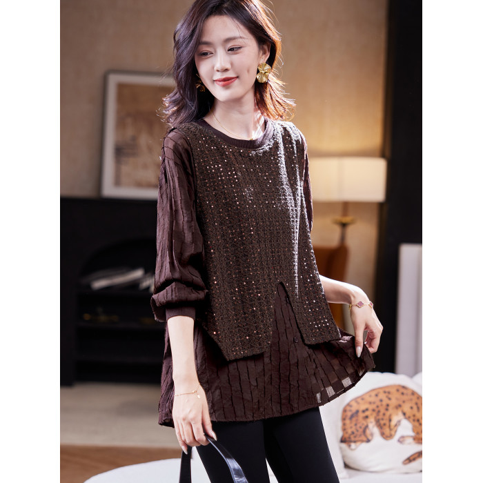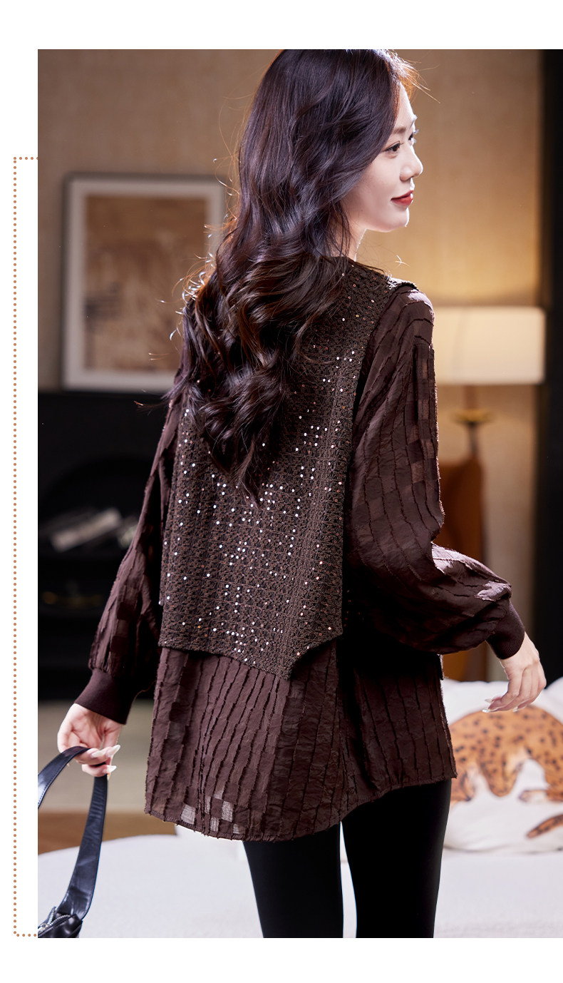 寶詩黎假兩件亮片拼接襯衫2026春季洋氣休閒寬鬆大碼長袖襯衣女