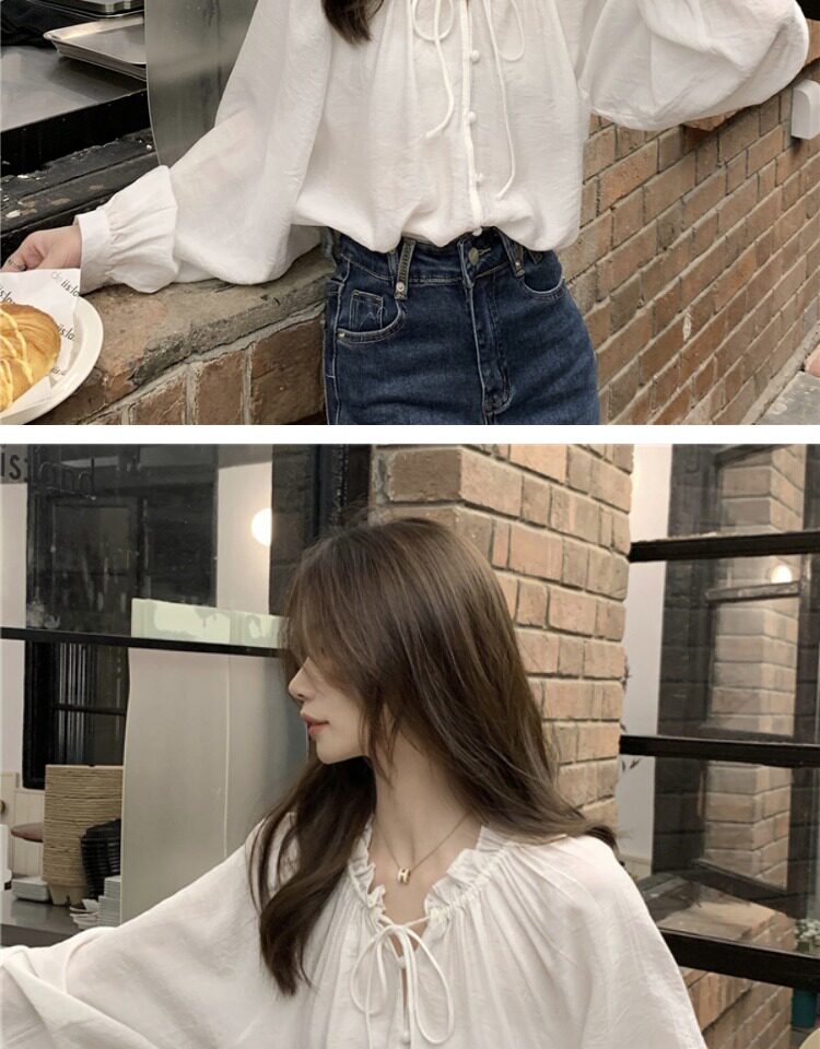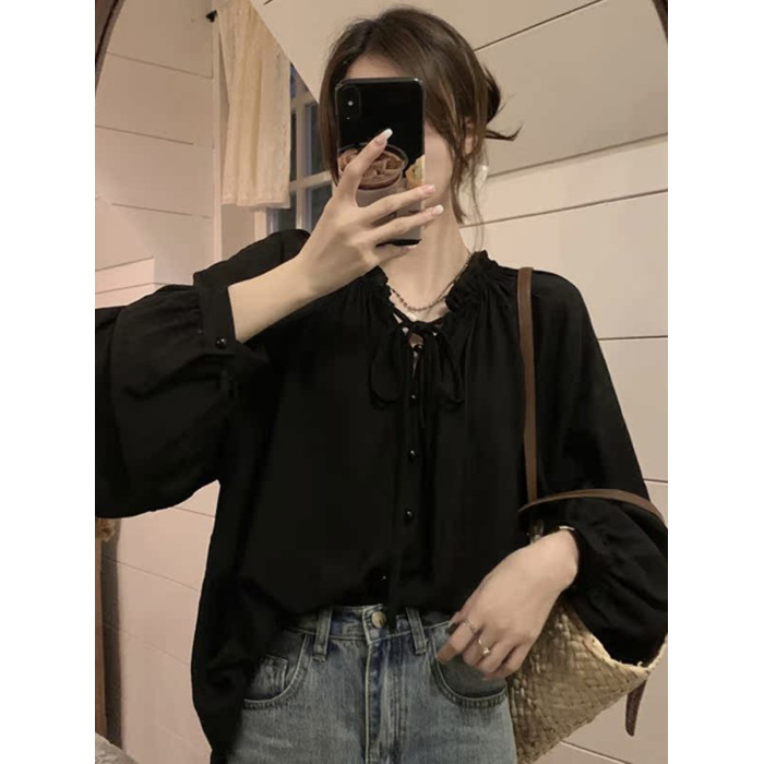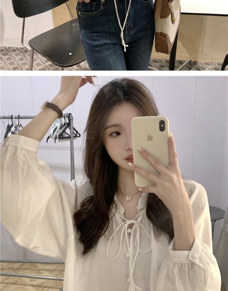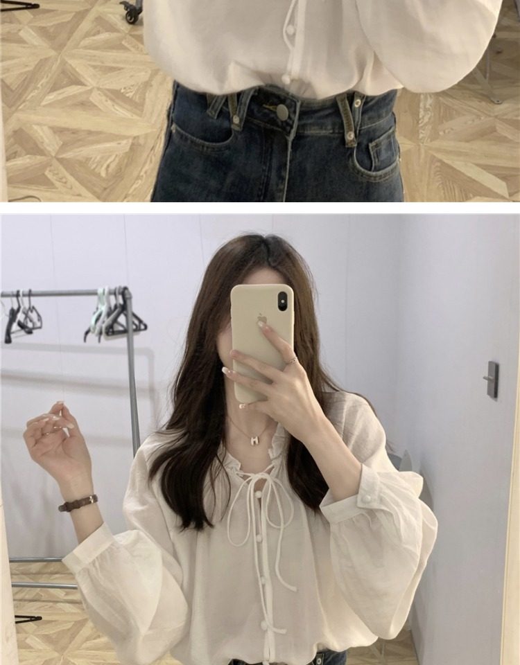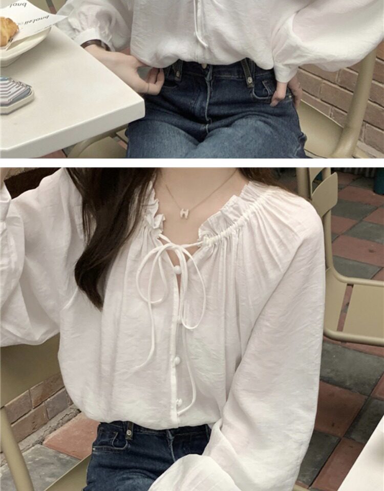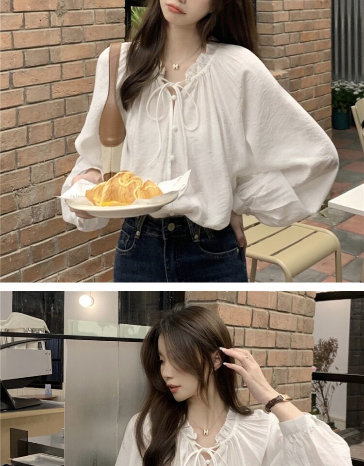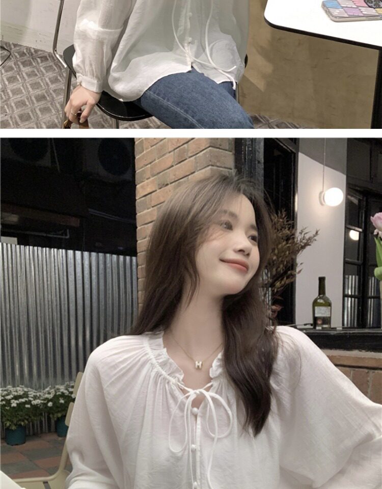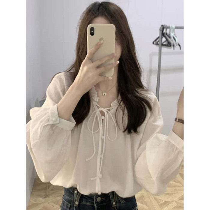 系帶長袖襯衫女夏季新款別致設計感小衆上衣法式燈籠袖白色襯衣薄
