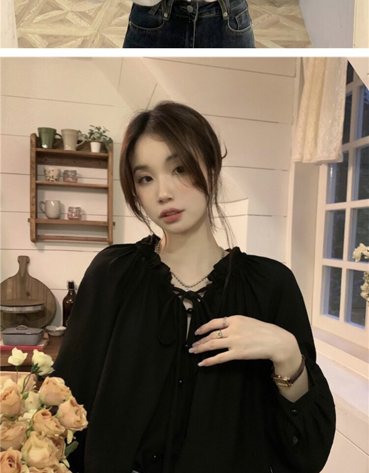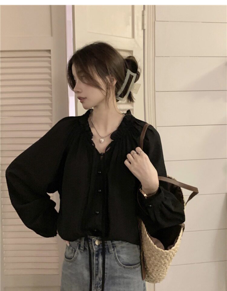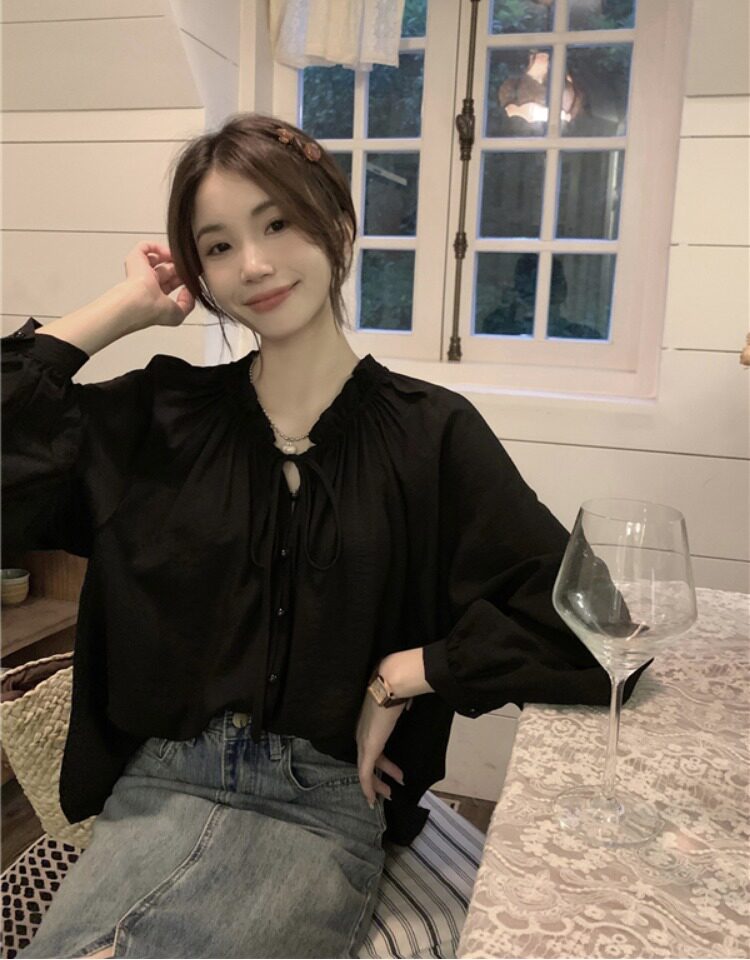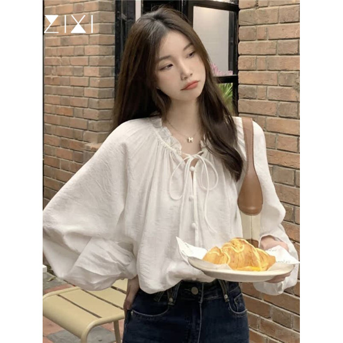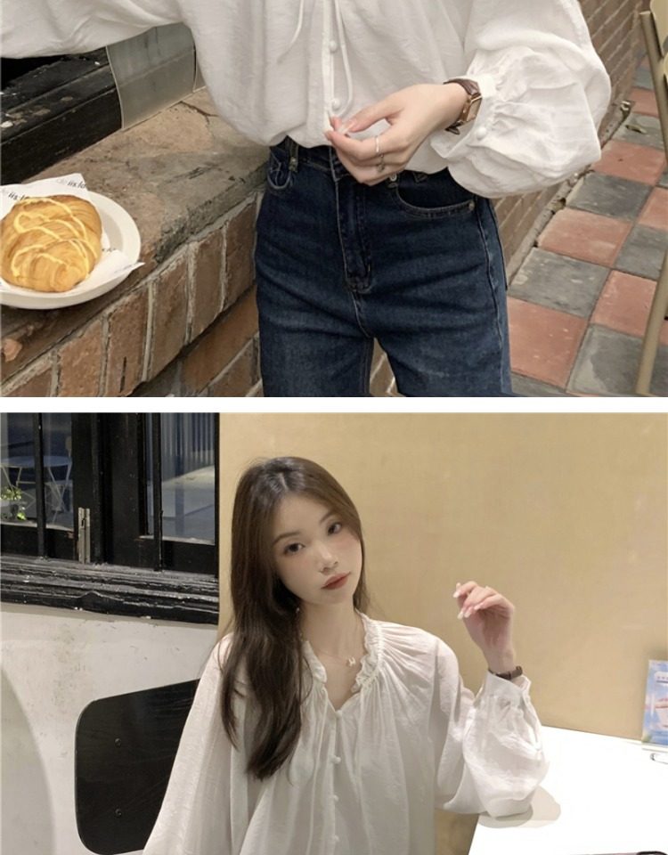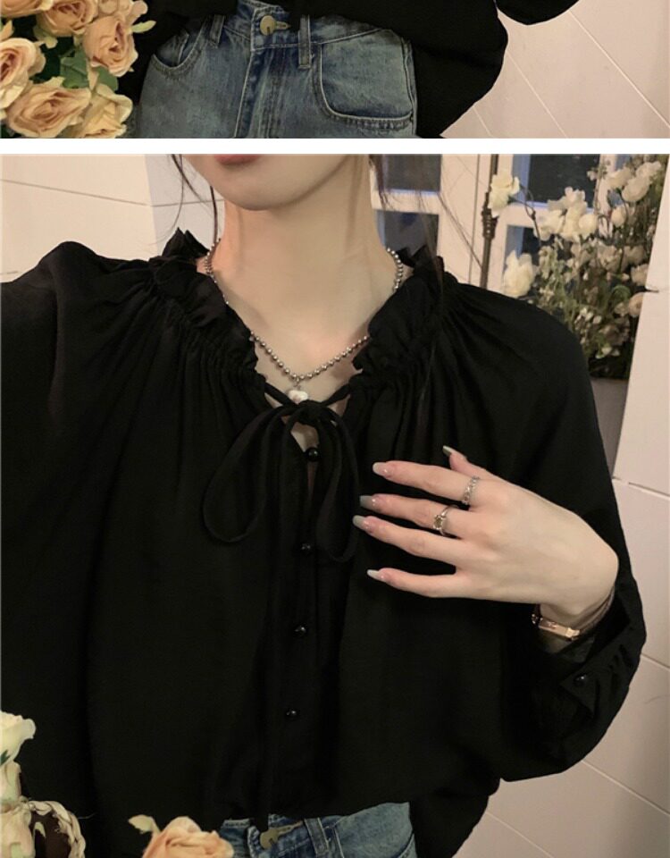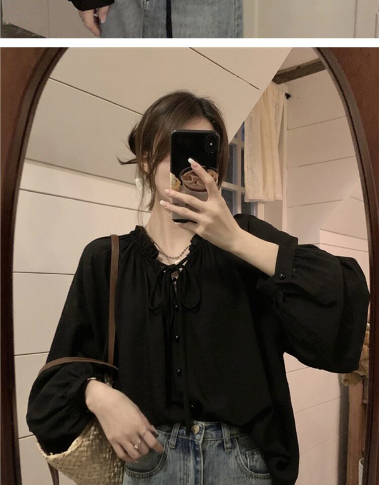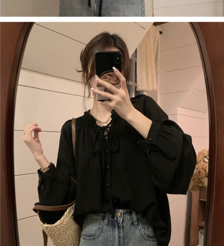 系帶長袖襯衫女夏季新款別致設計感小衆上衣法式燈籠袖白色襯衣薄