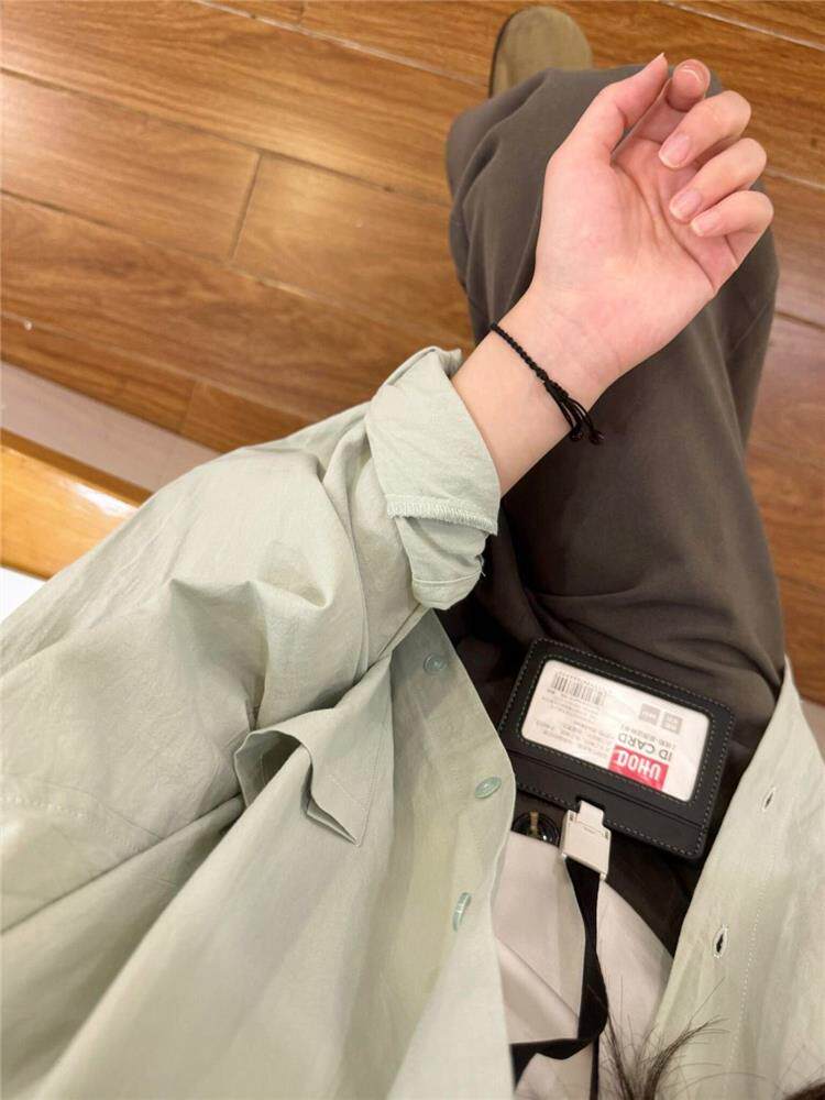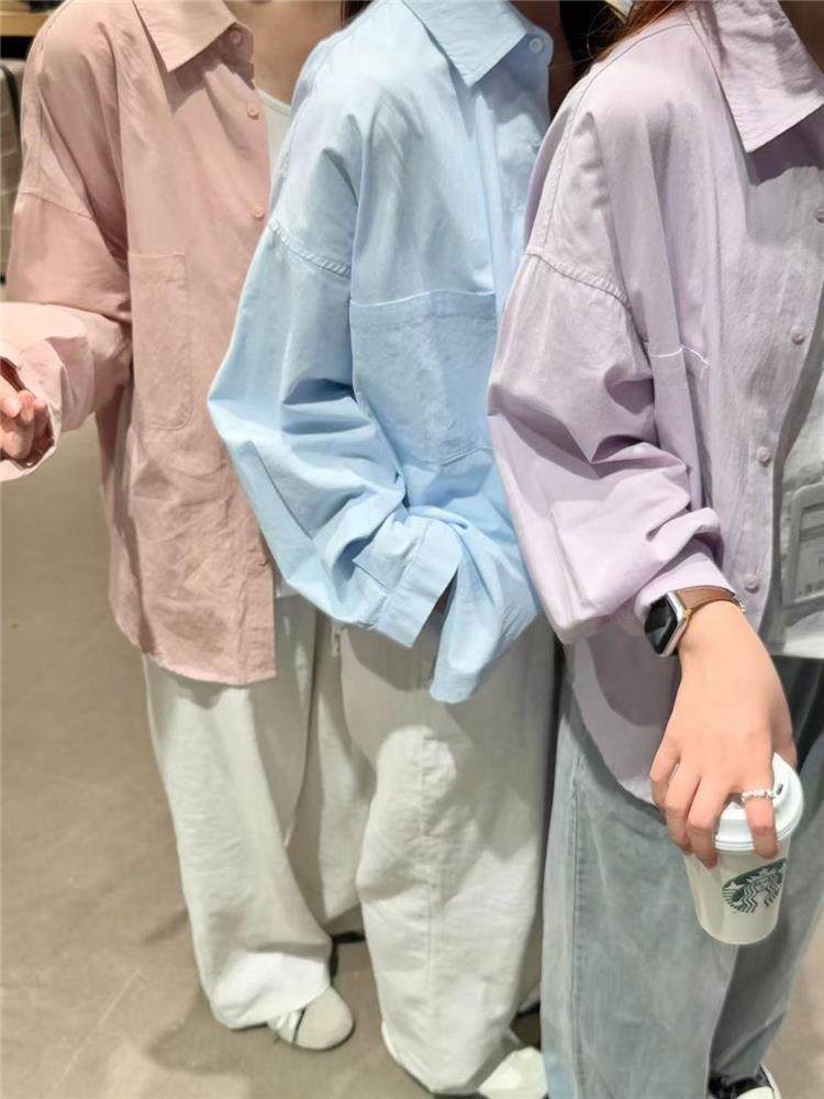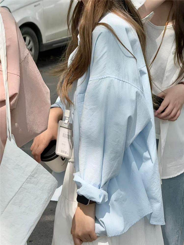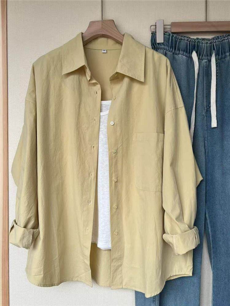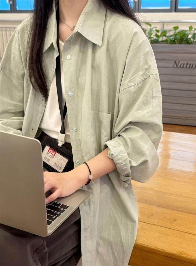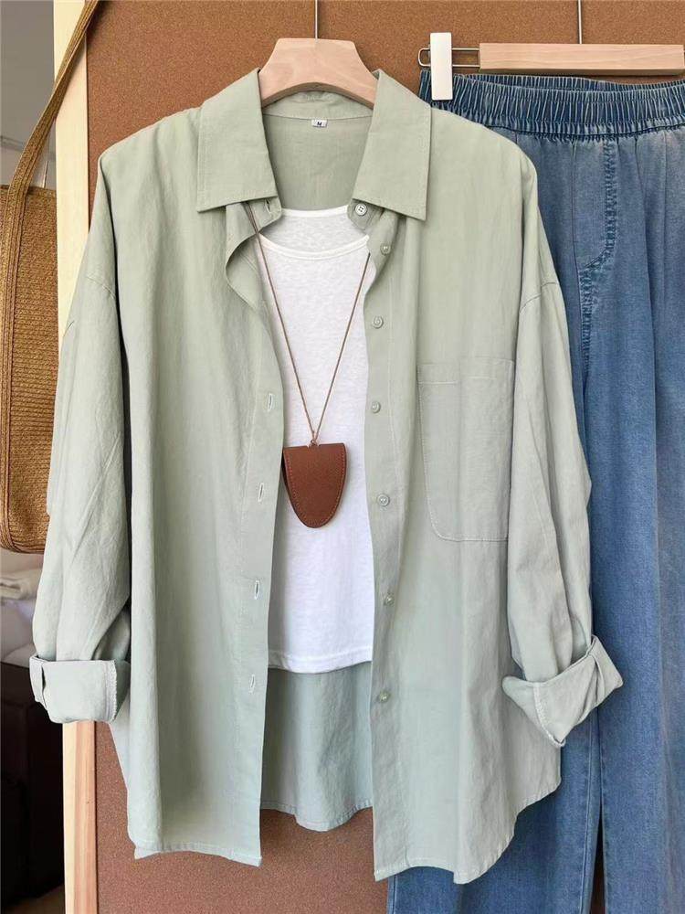 韓系復古曡穿豆綠色純棉襯衫女內搭寬鬆百搭顯瘦防曬長袖開衫襯衣