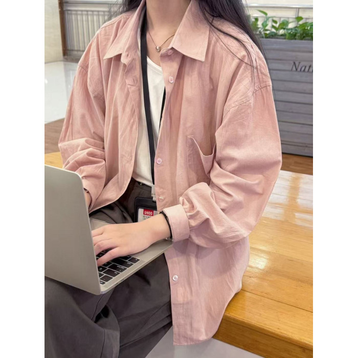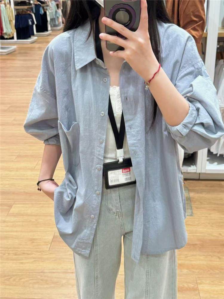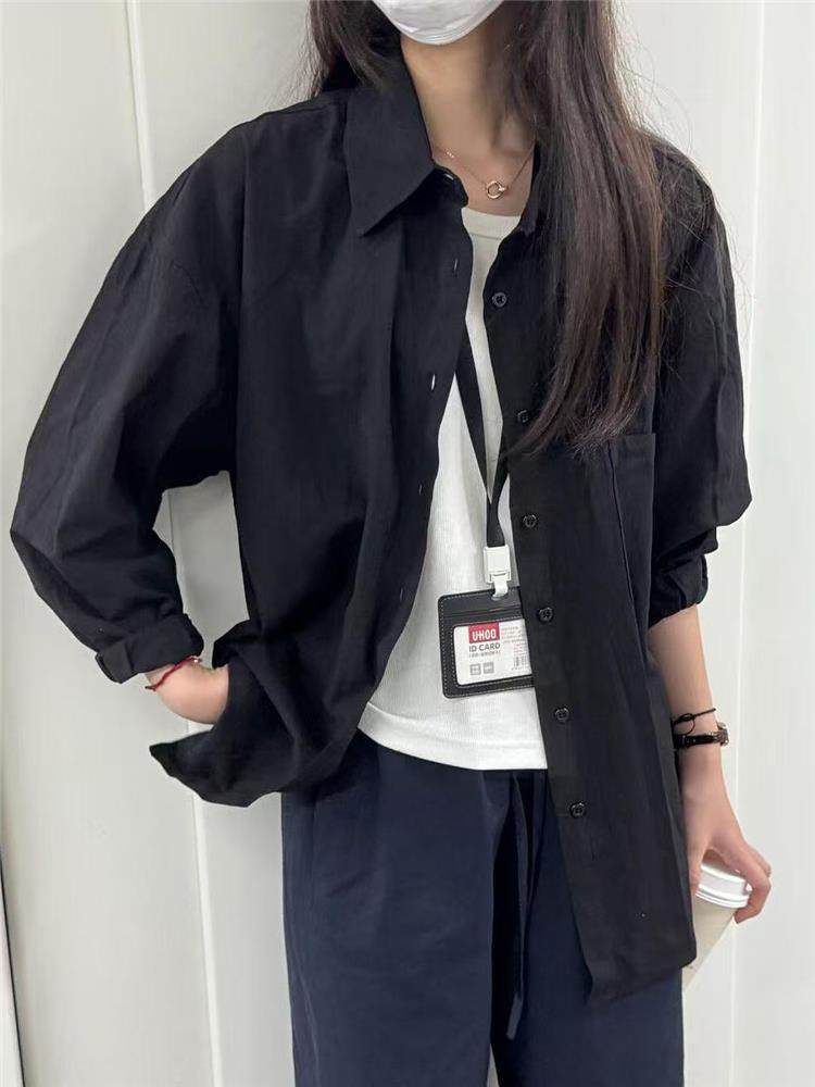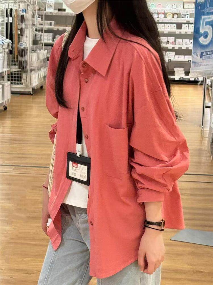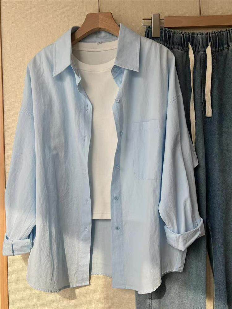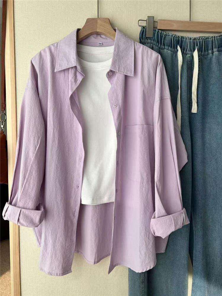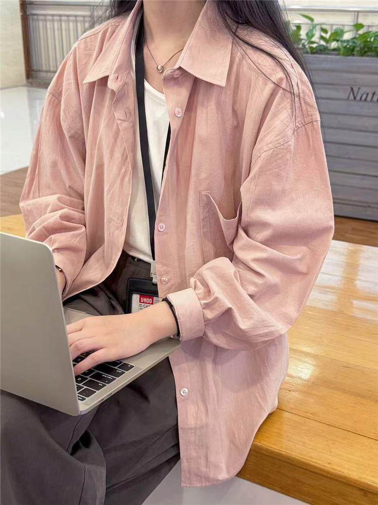 韓系復古曡穿豆綠色純棉襯衫女內搭寬鬆百搭顯瘦防曬長袖開衫襯衣