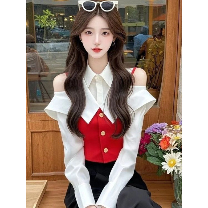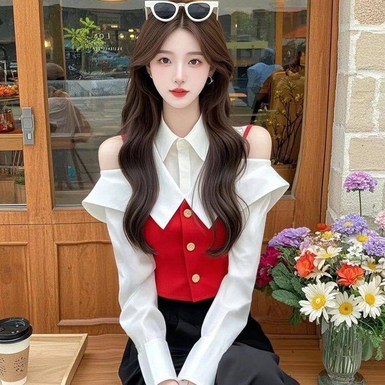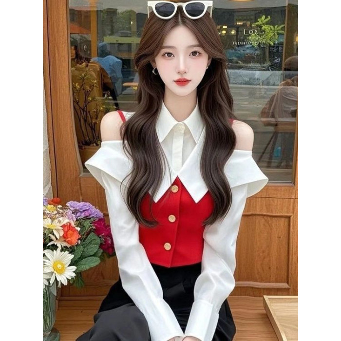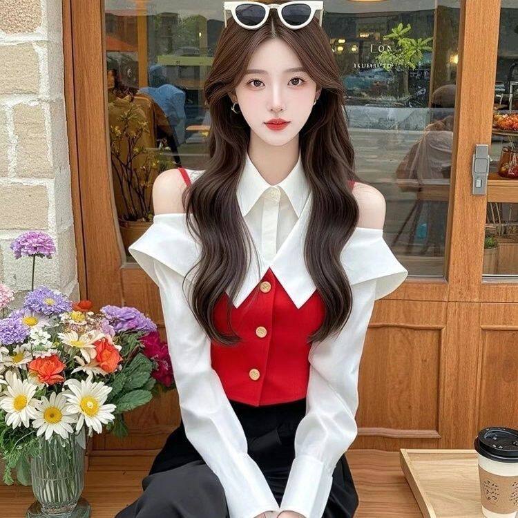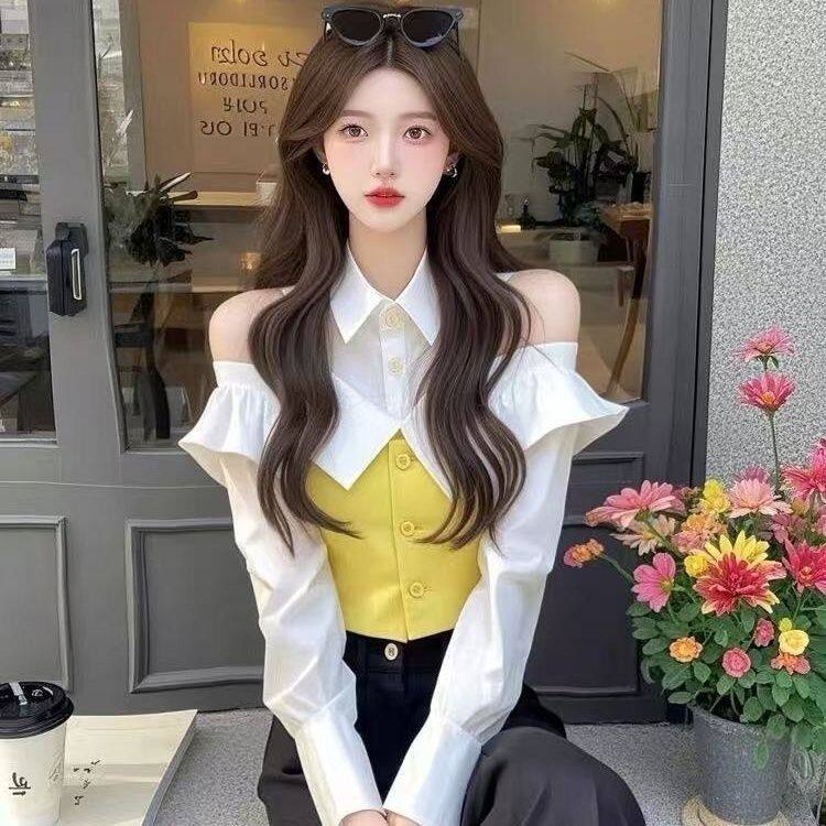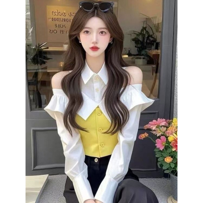 小香風黃色假兩件襯衫2025年早春獨特漂亮收腰打底上衣爆款超好看