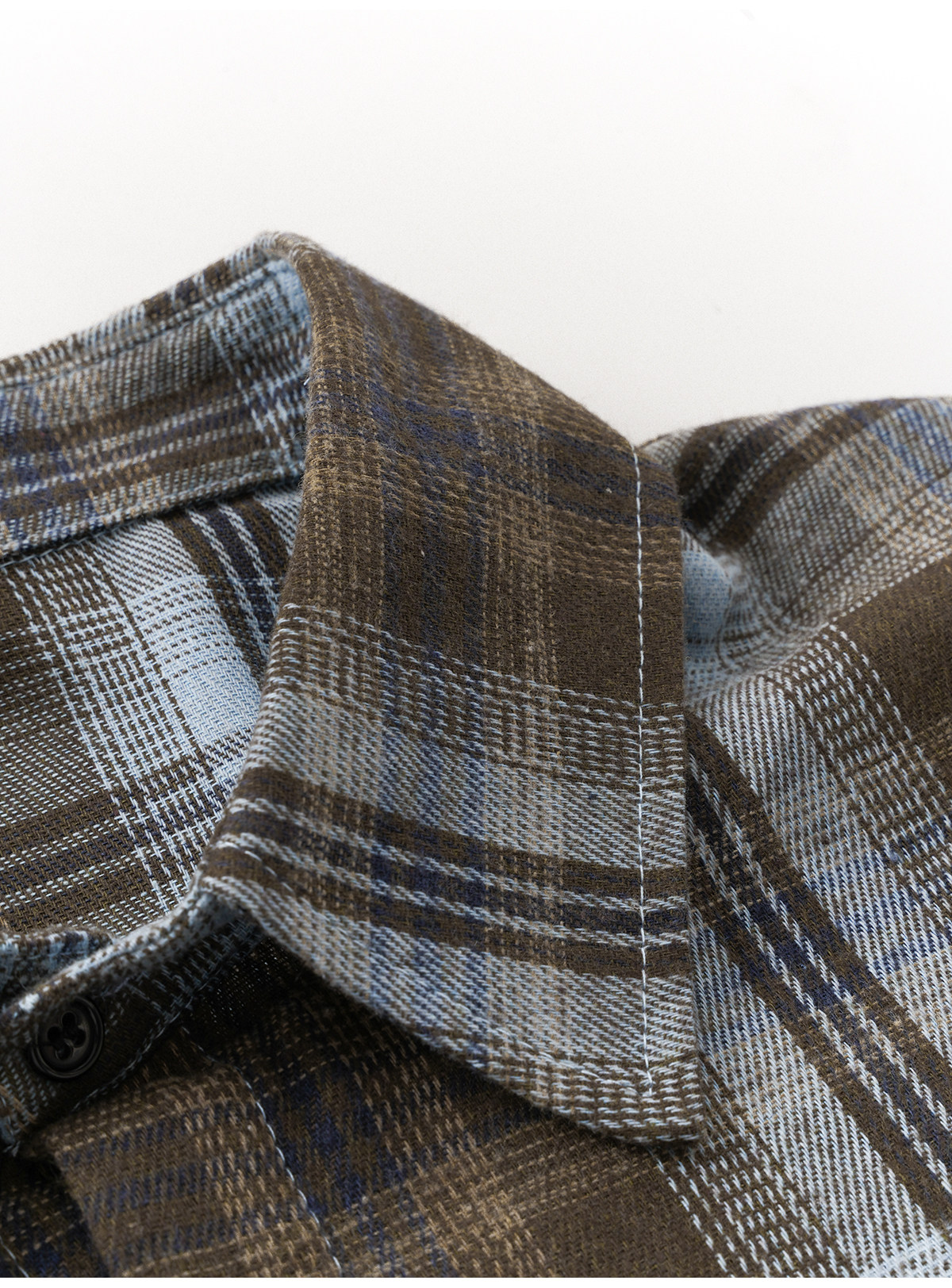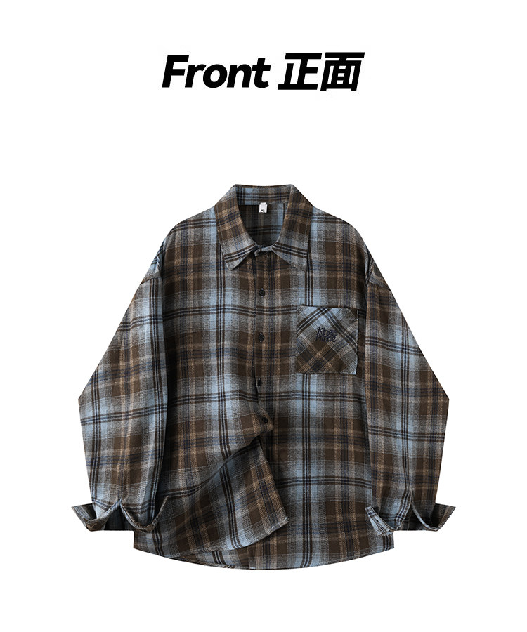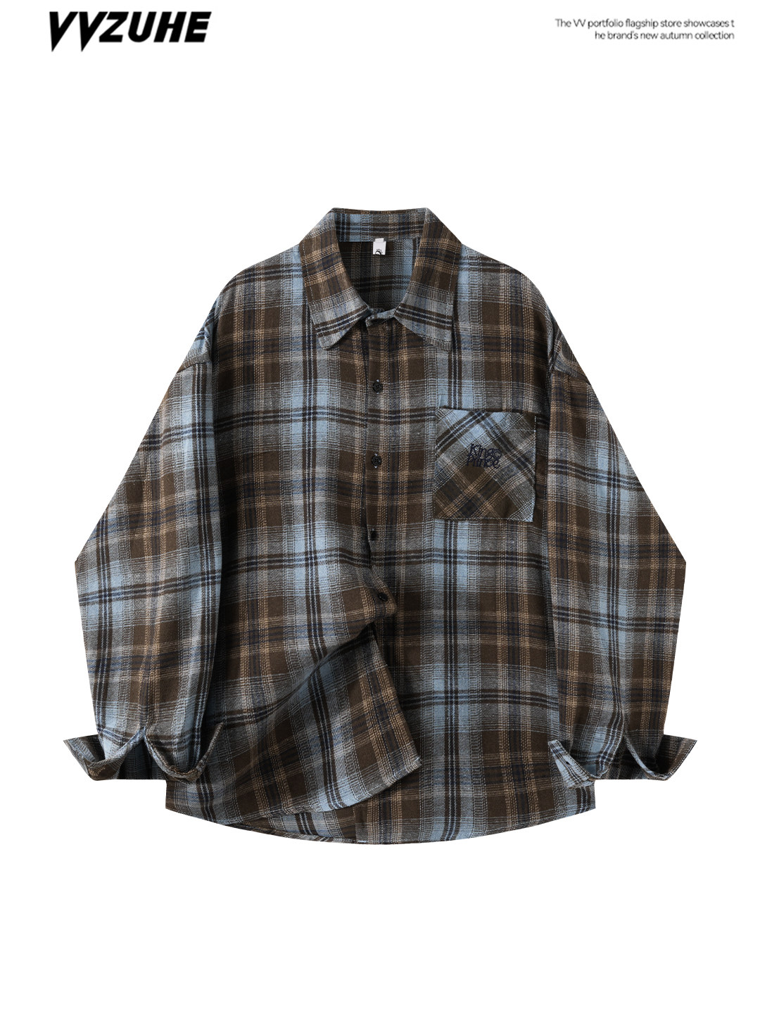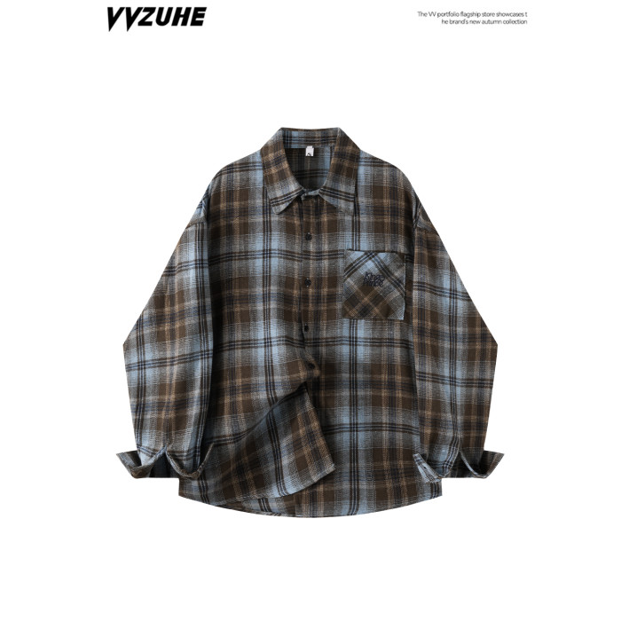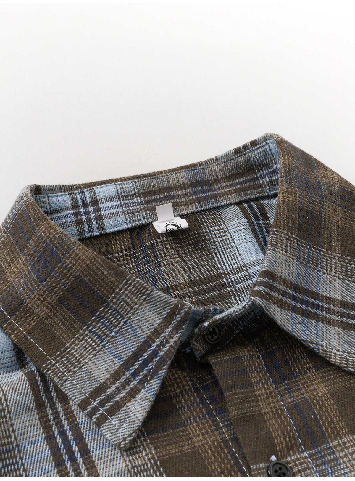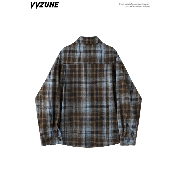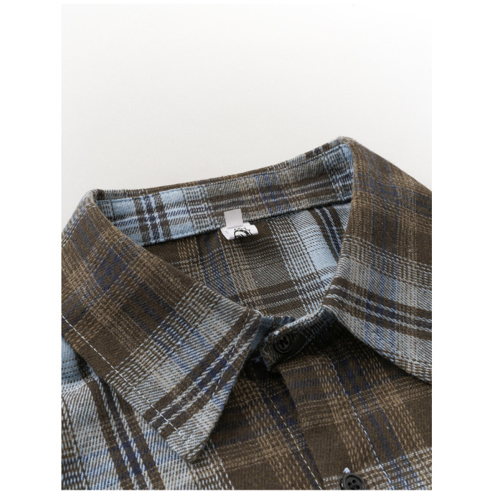 美式復古風雙色磨毛格紋Polo領長袖襯衫女裝秋季寬鬆百搭上衣外套