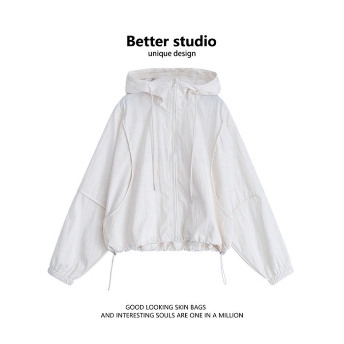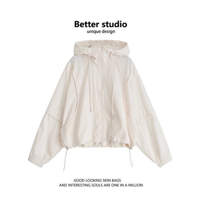 連帽短款原紗防曬衣女夏季薄款透氣沖鋒衣外套休閒防曬服寬鬆上衣