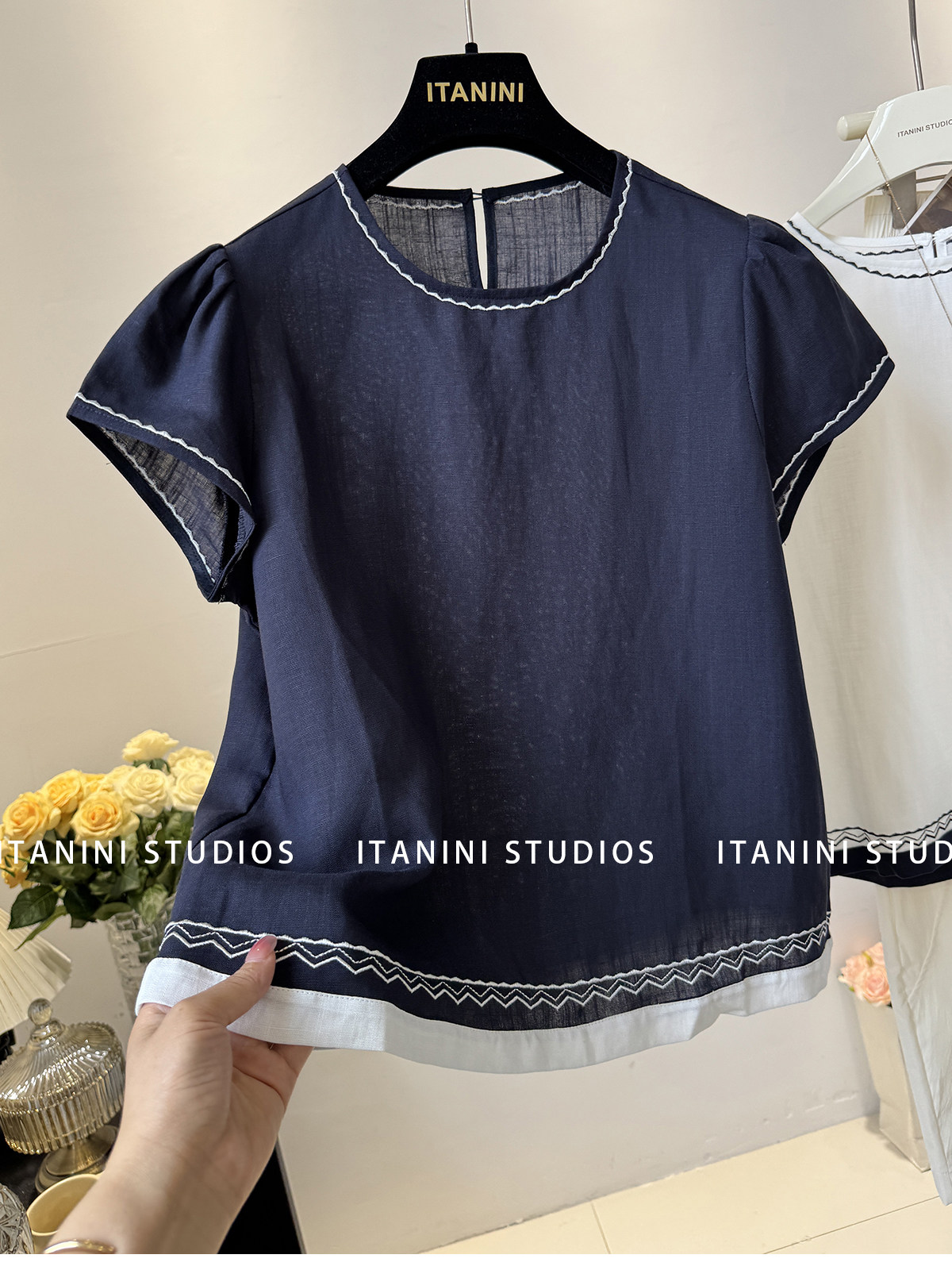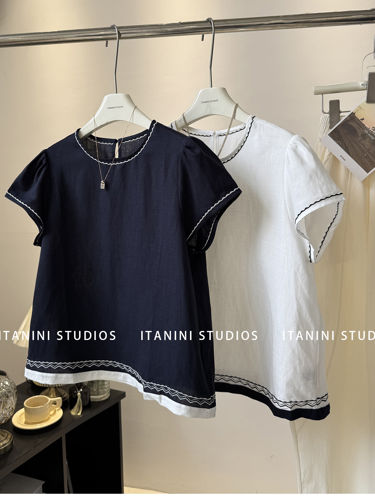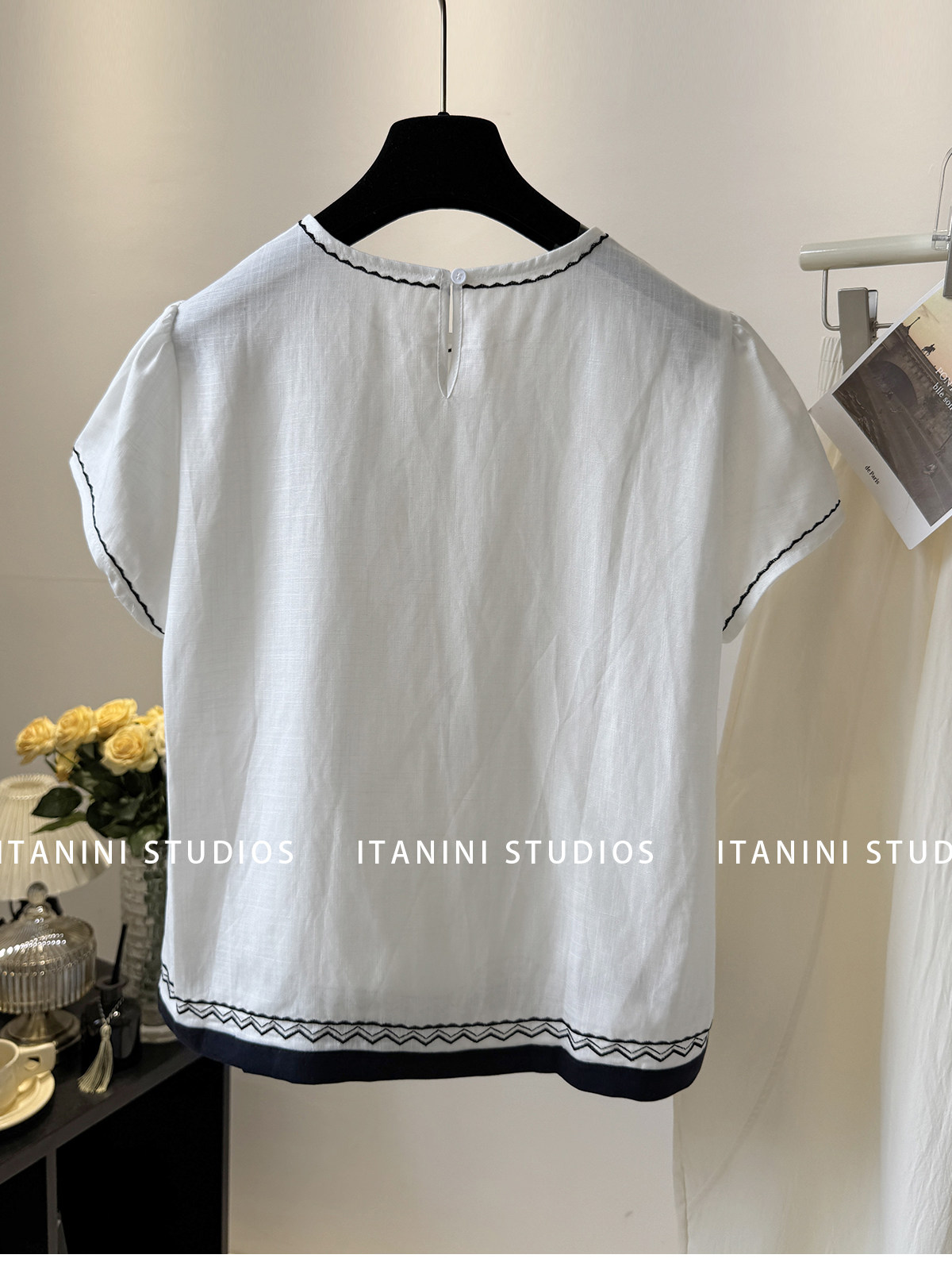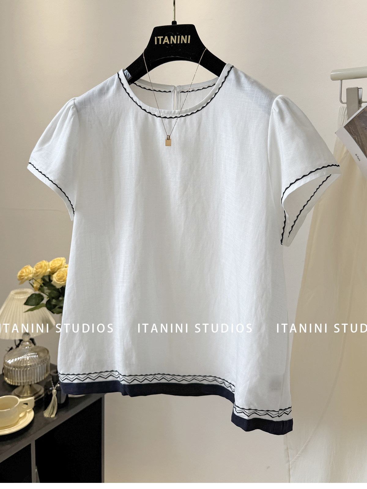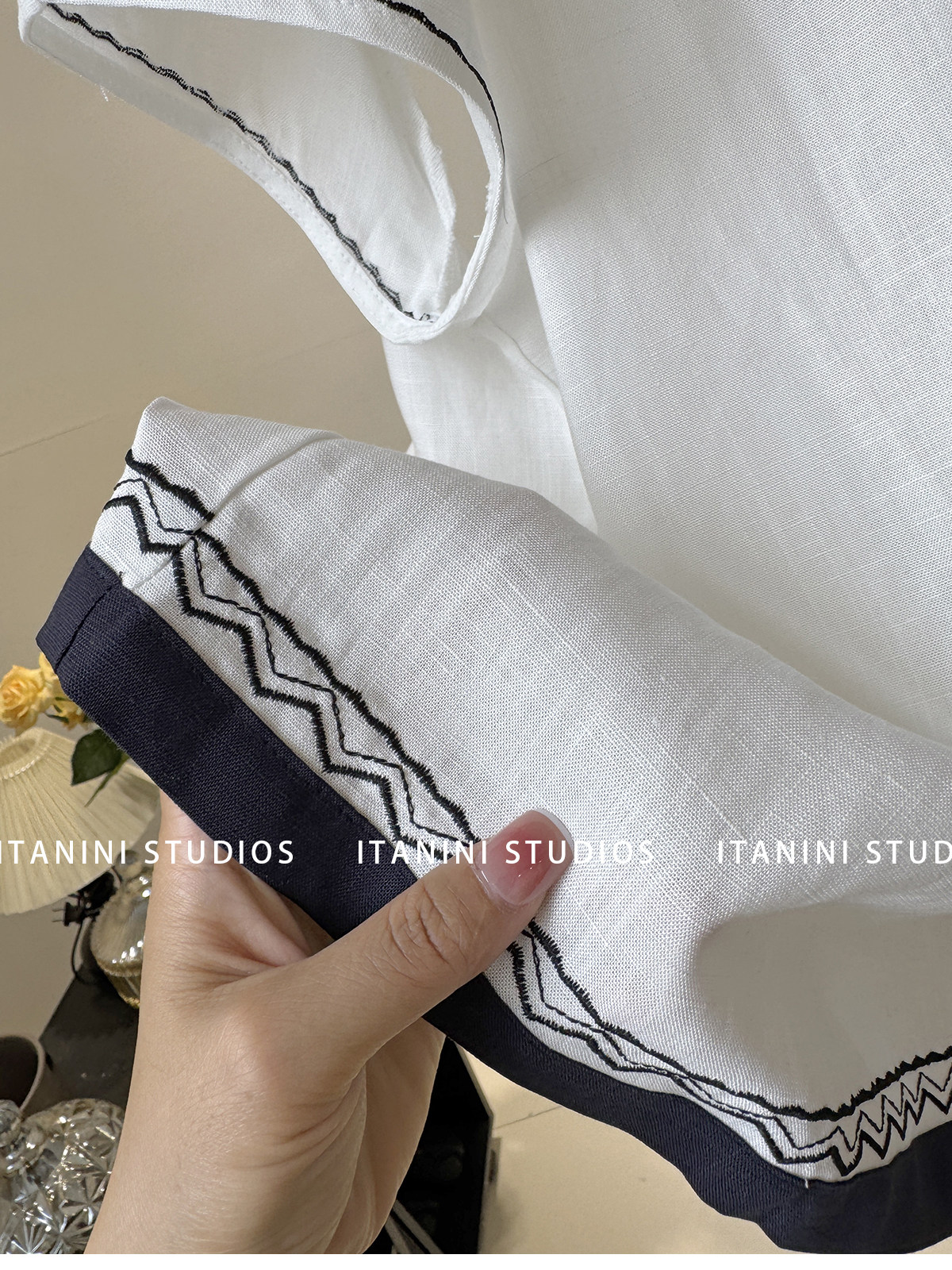 高級感襯衫女裝短袖2026夏季新款刺綉圓領寬鬆顯瘦韓系棉麻上衣薄