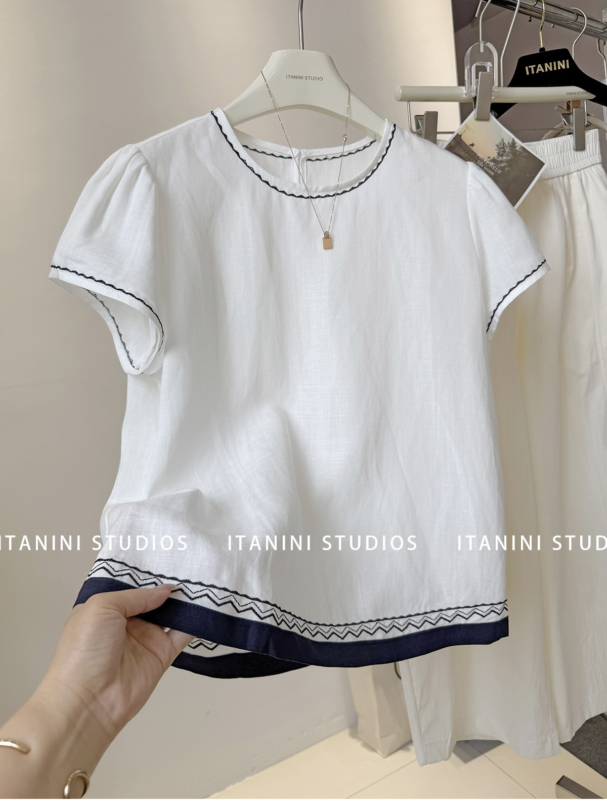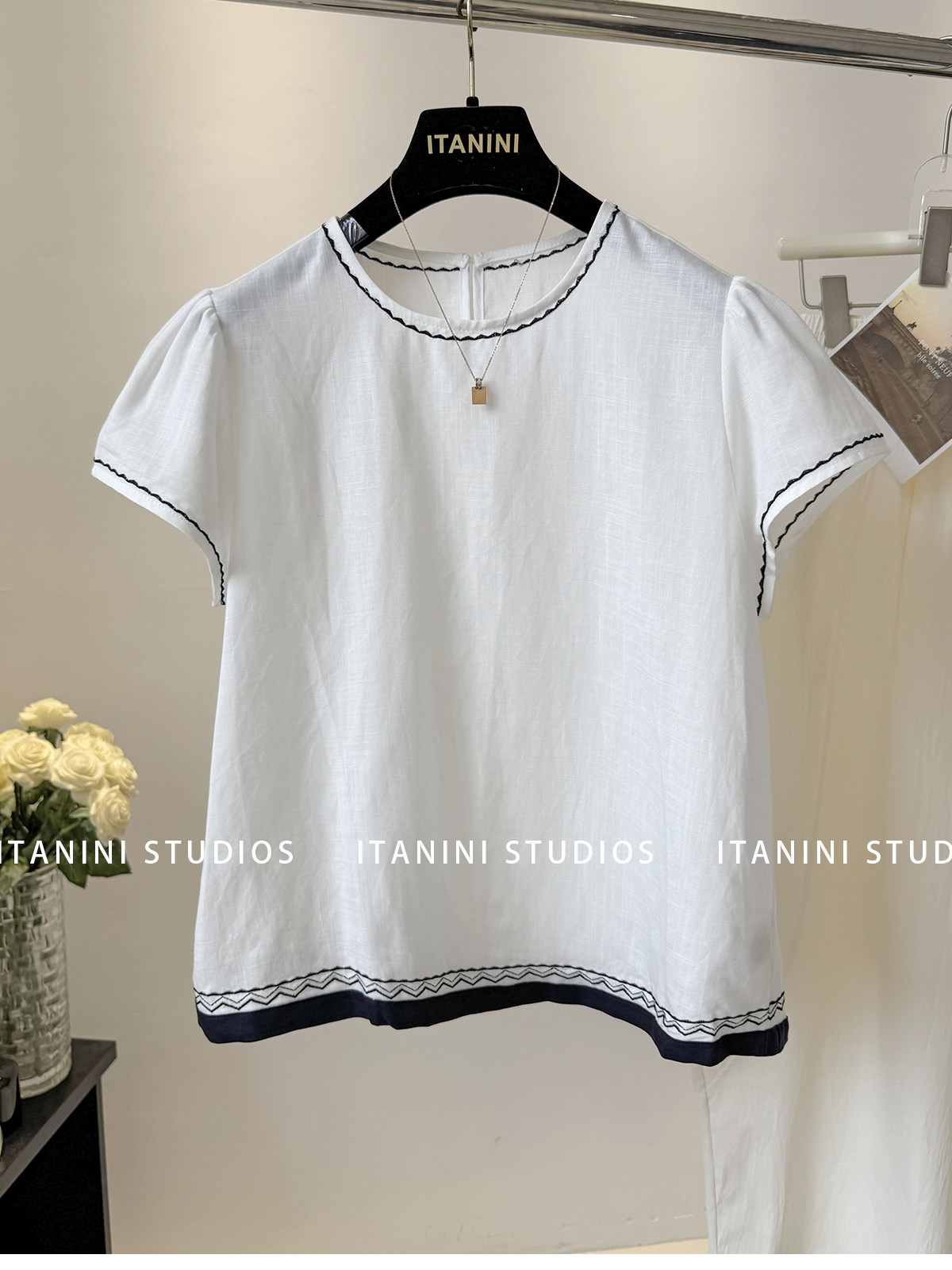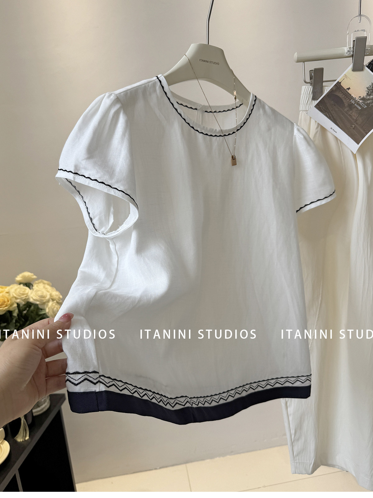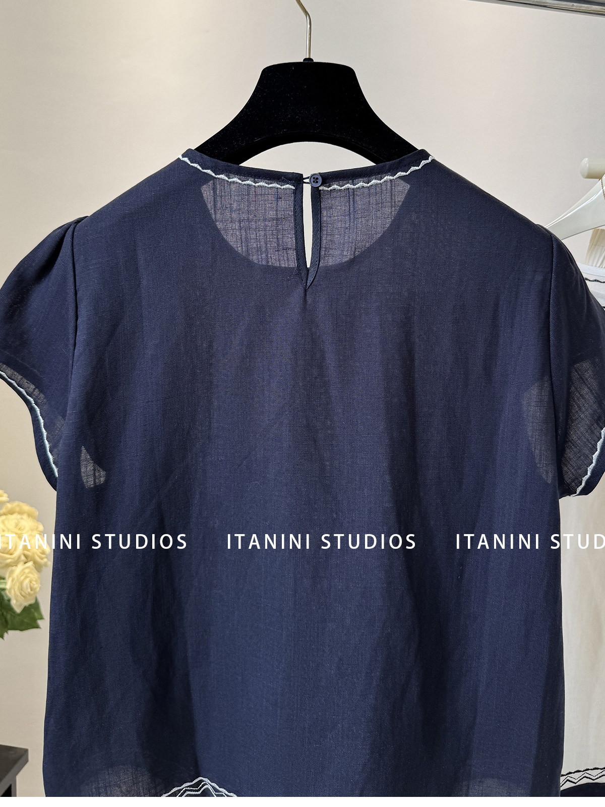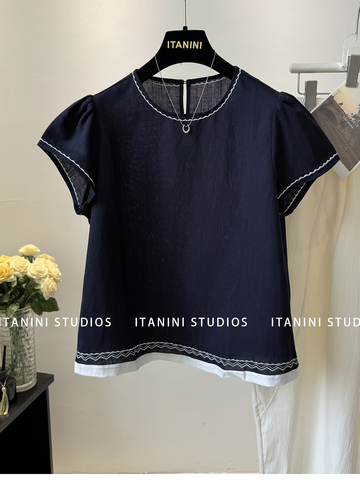 高級感襯衫女裝短袖2026夏季新款刺綉圓領寬鬆顯瘦韓系棉麻上衣薄