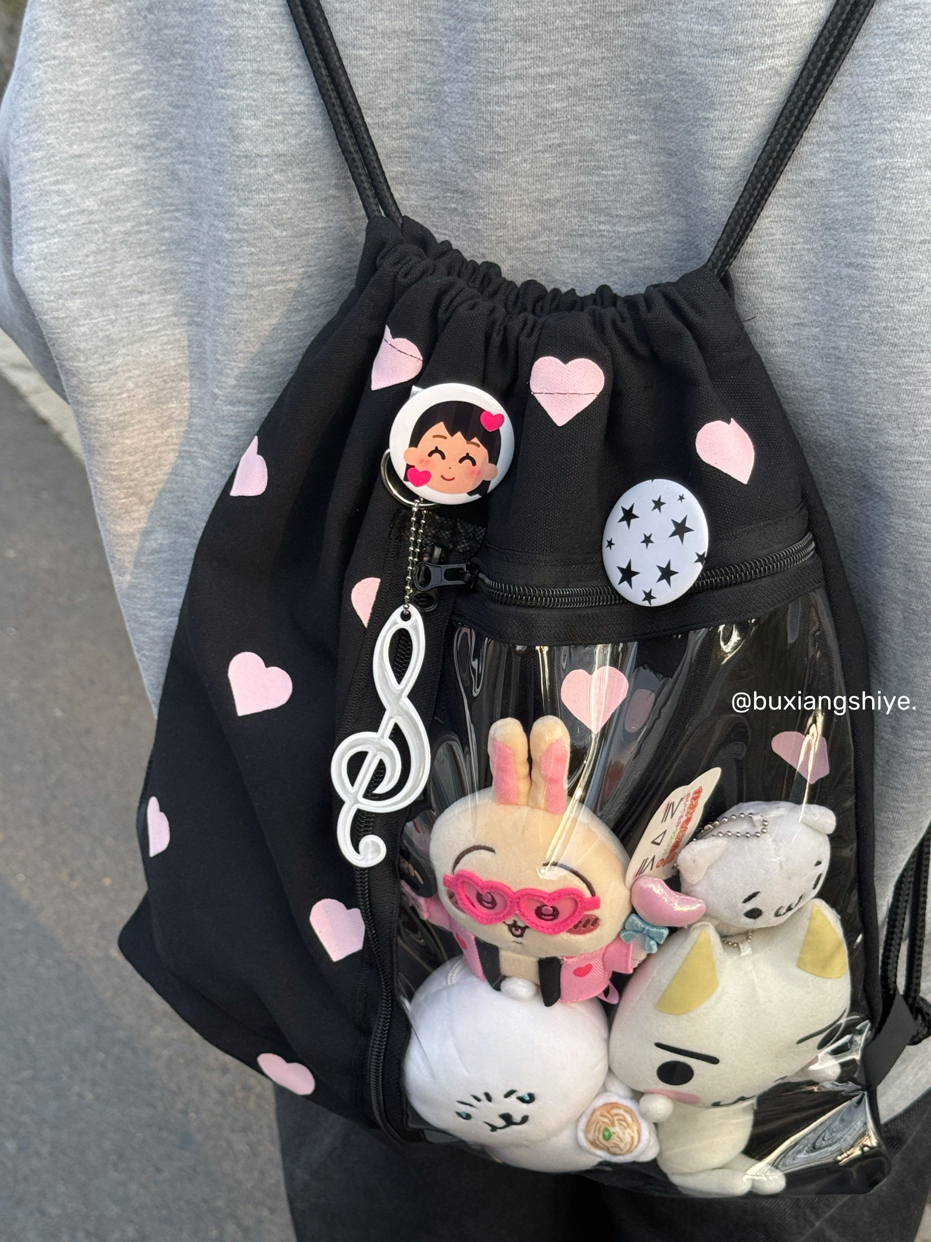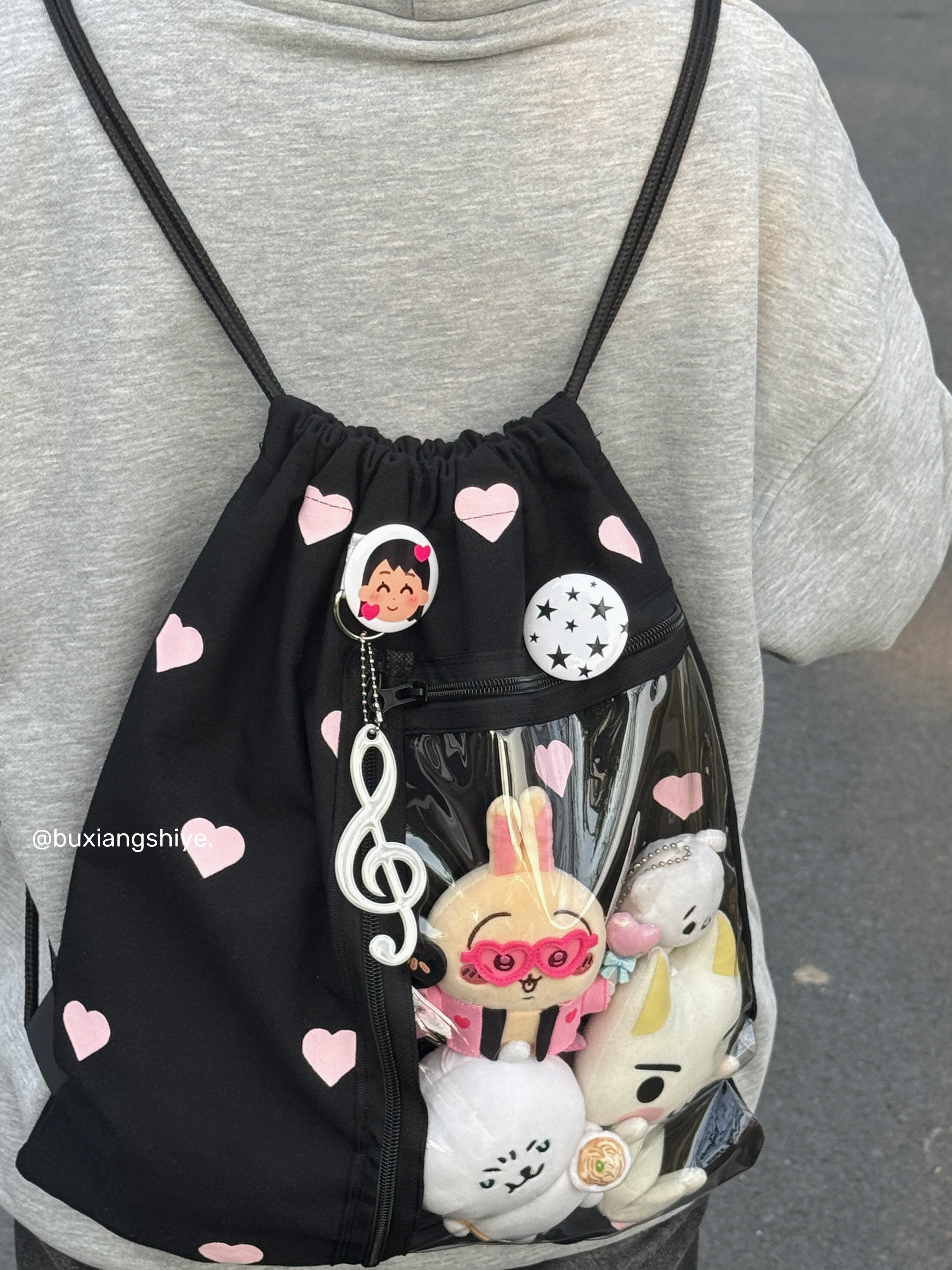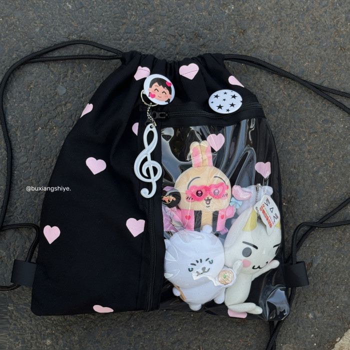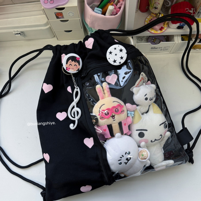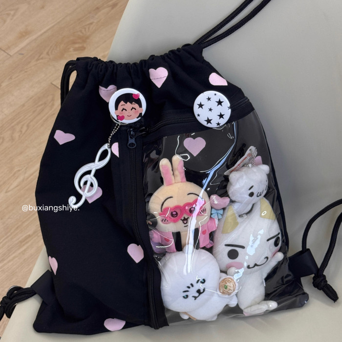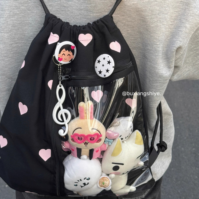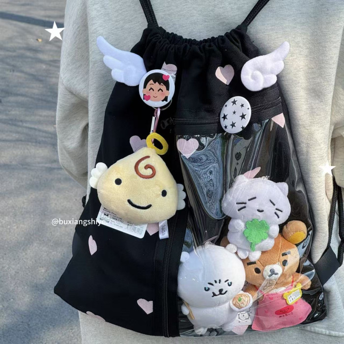 不想失業原創愛心抽繩痛包小衆黑色雙肩包簡約休閒學生大容量後後背包