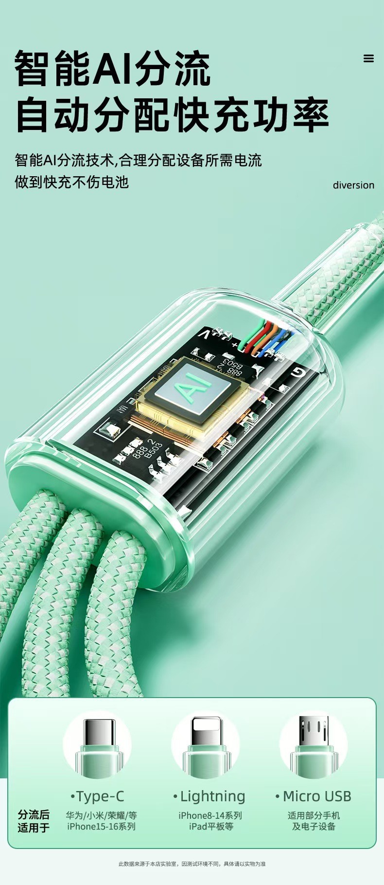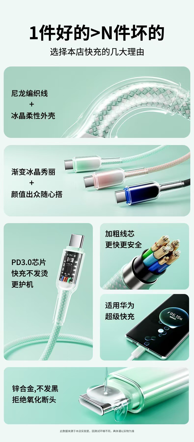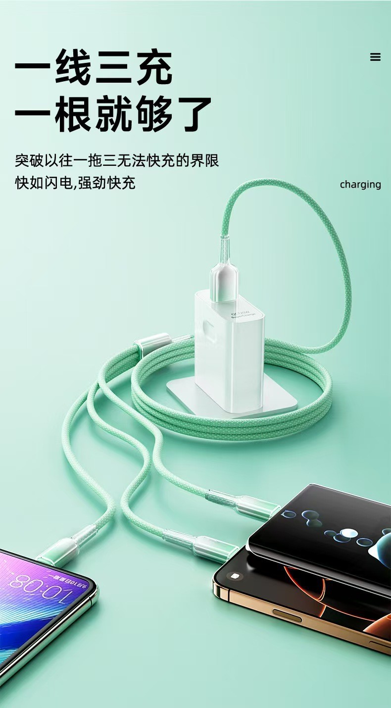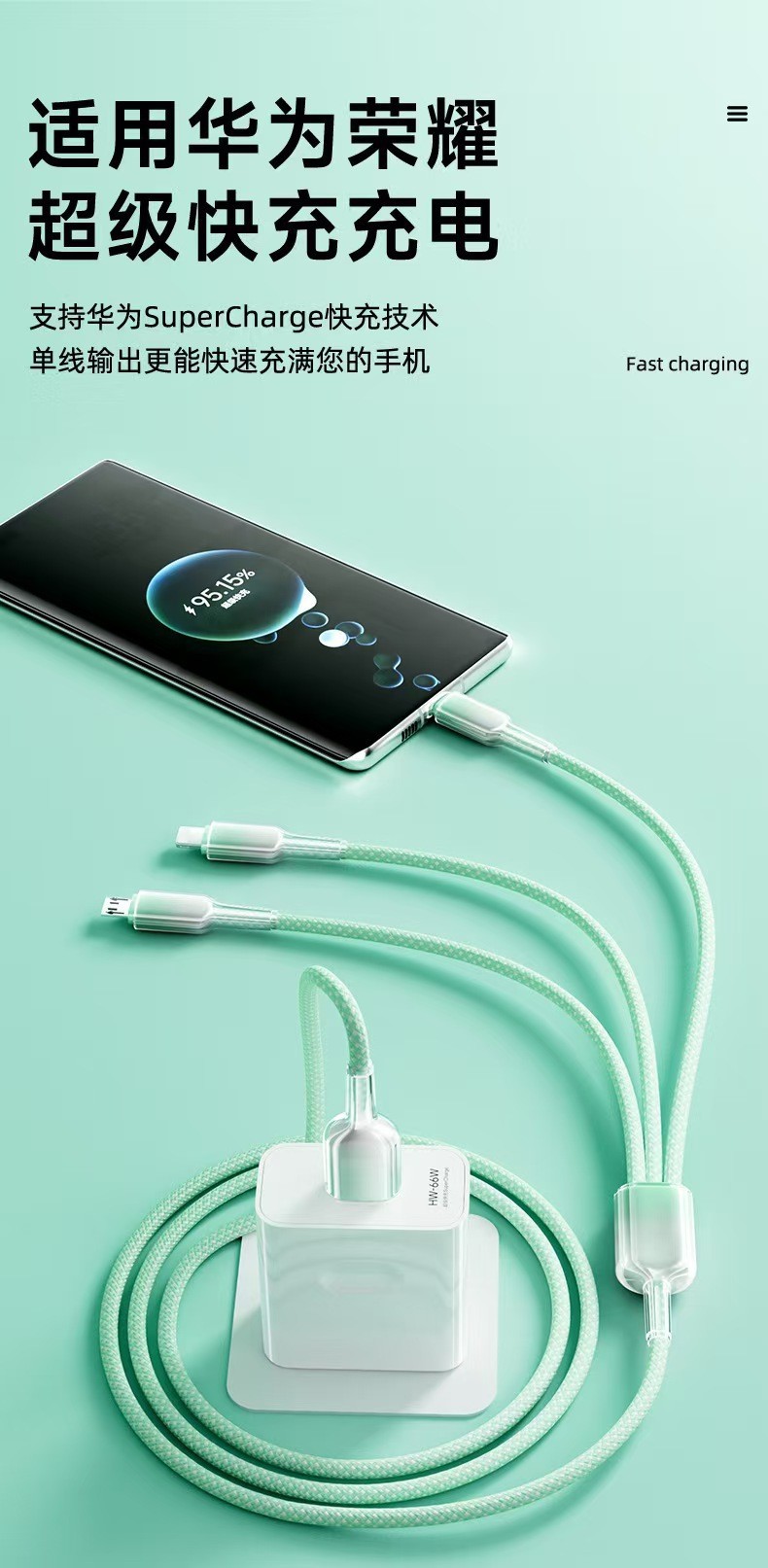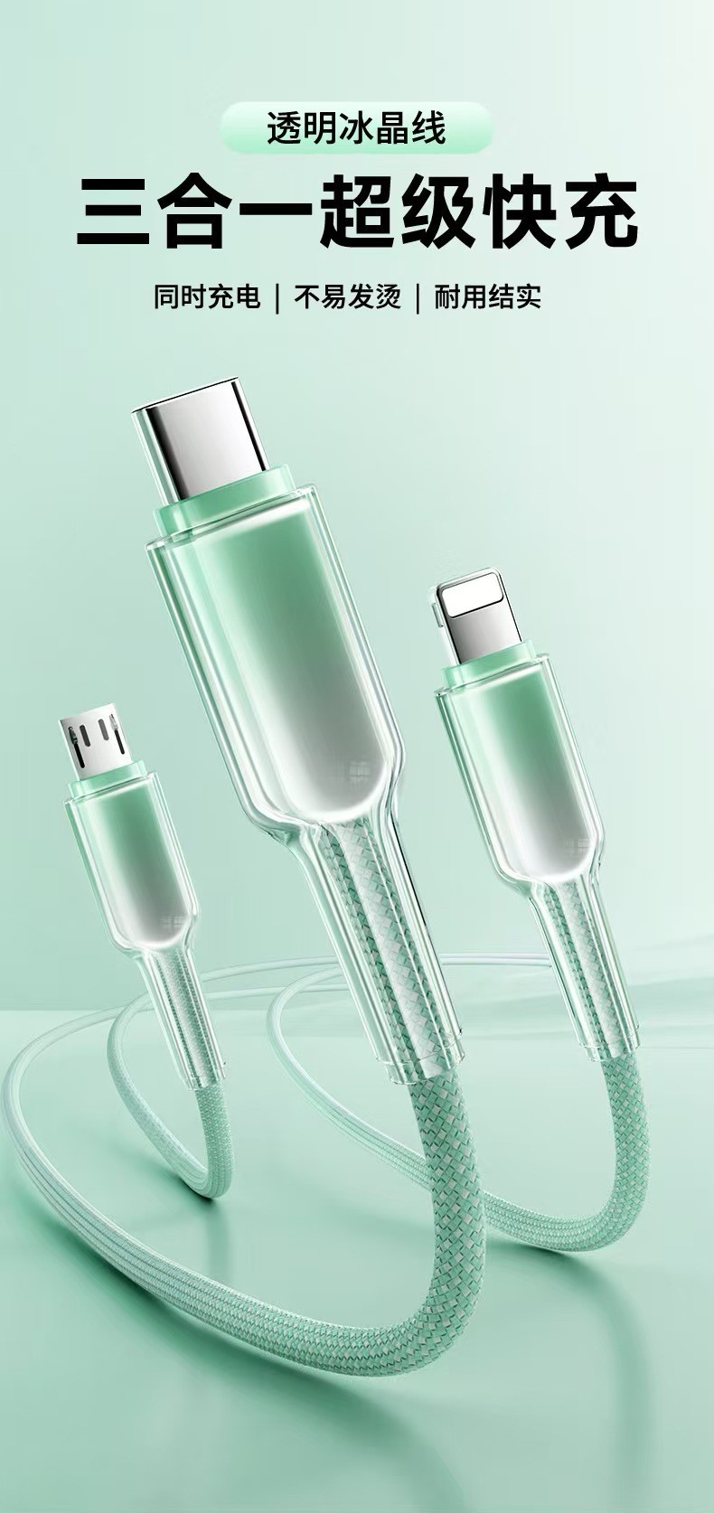 120W透明冰晶一拖三快充usb數據線 適用蘋果16華爲手機充電線