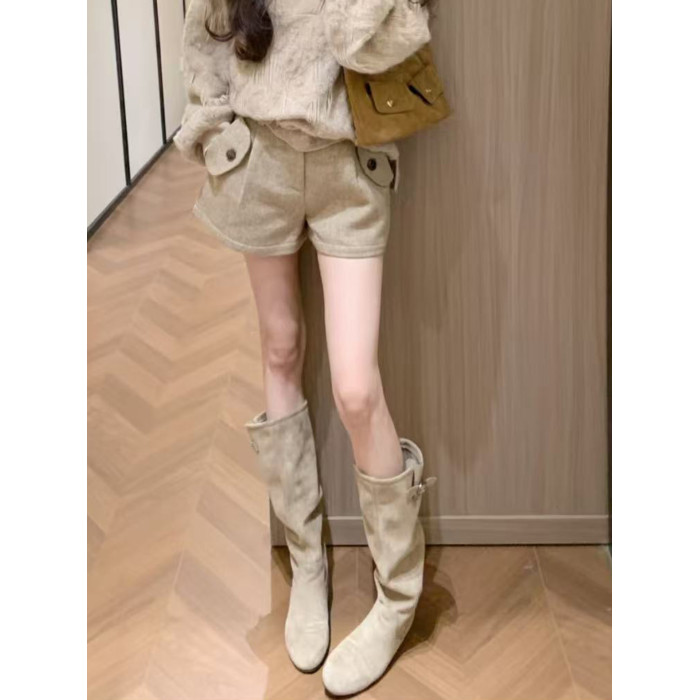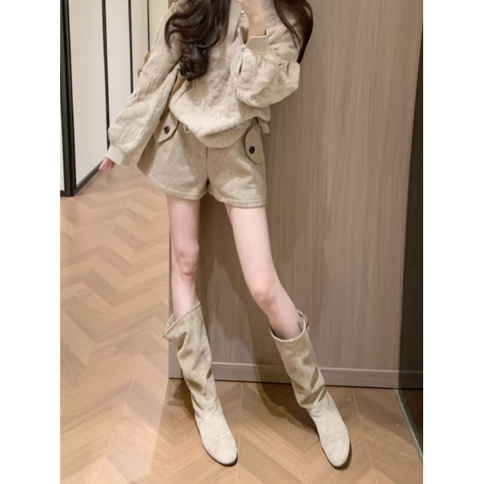 韓版高筒法式西部堆堆靴子女2025年秋冬新款圓頭絨面內增高長筒靴