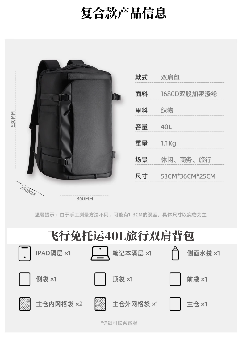 UKPINGTI平替大容量雙肩後後背包男多功能40L飛行免托運18寸電腦旅行