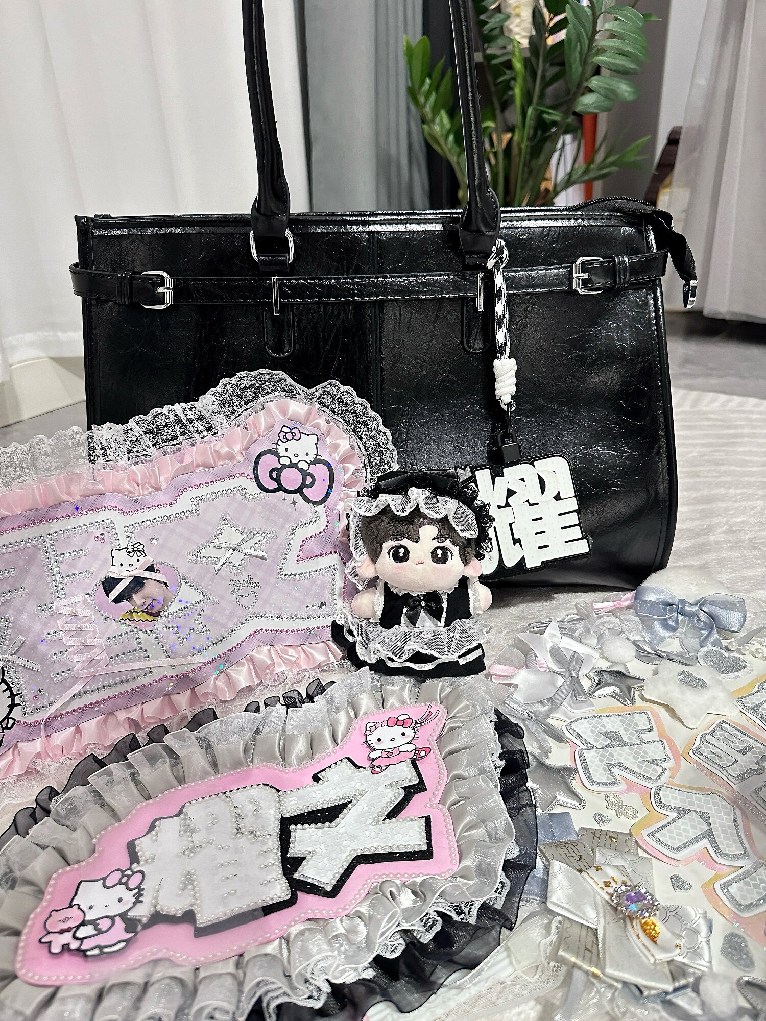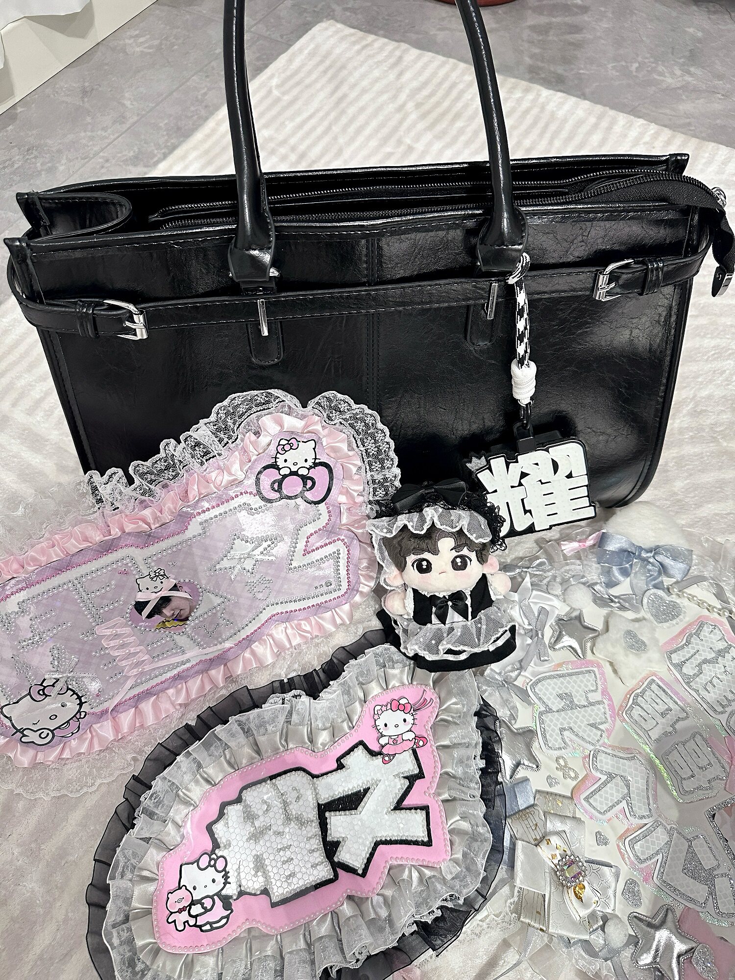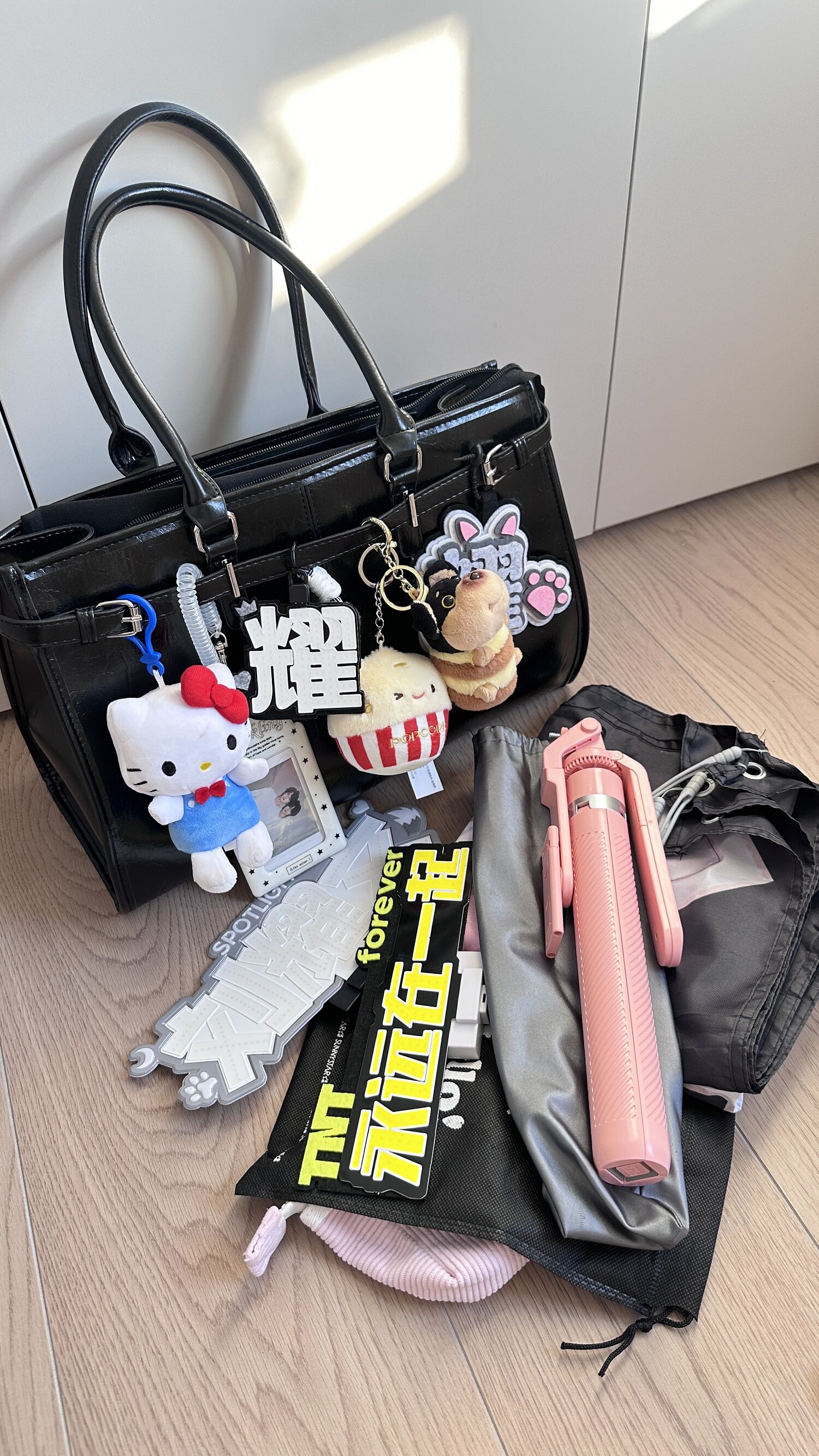 黑色油蠟皮大容量托特包追星女孩演唱會藏相機支架手提包應援包