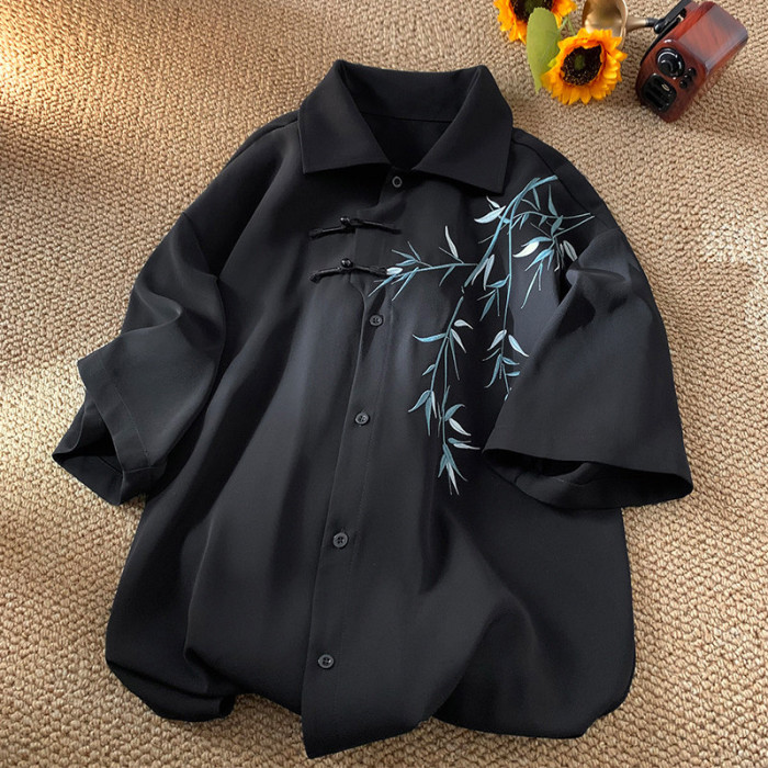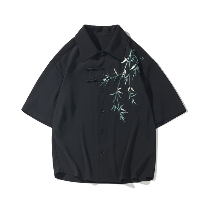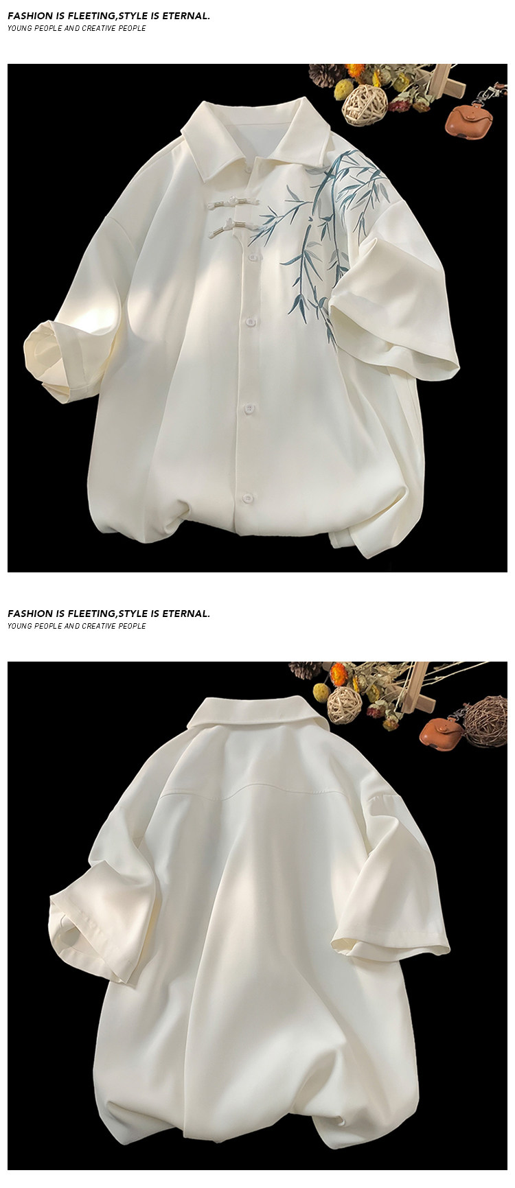 風青竹刺綉短袖襯衫男高級感復古盤釦加大碼寬鬆胖人半袖襯衣