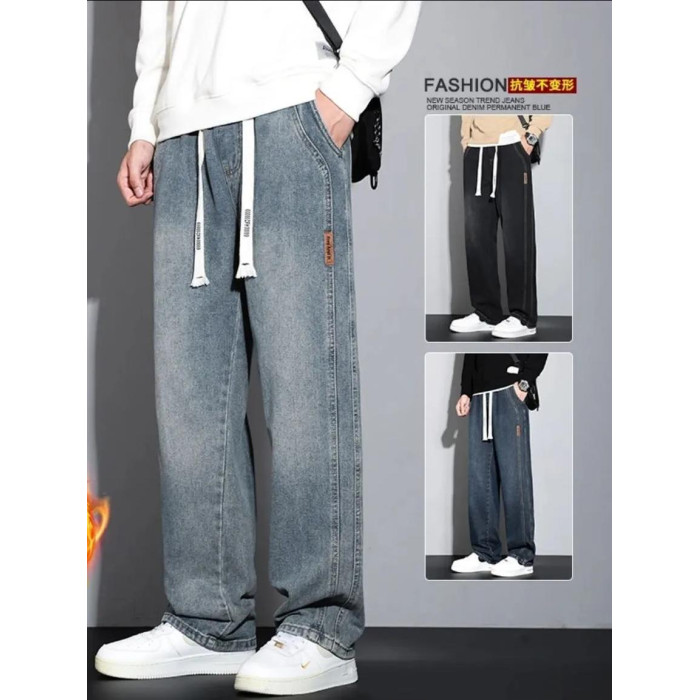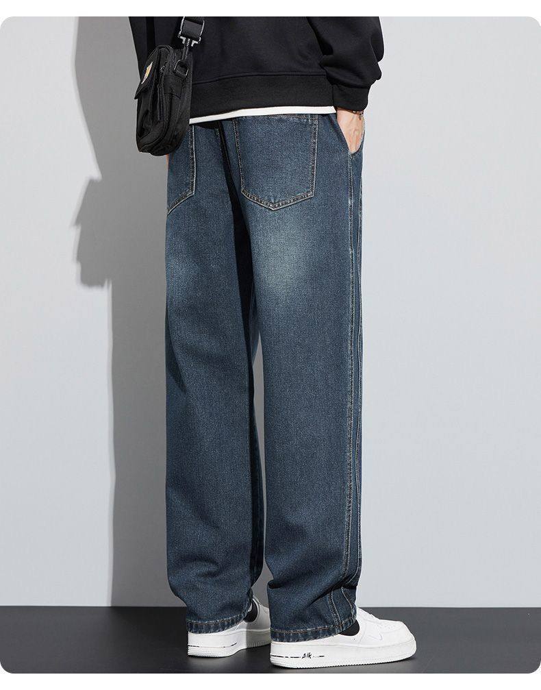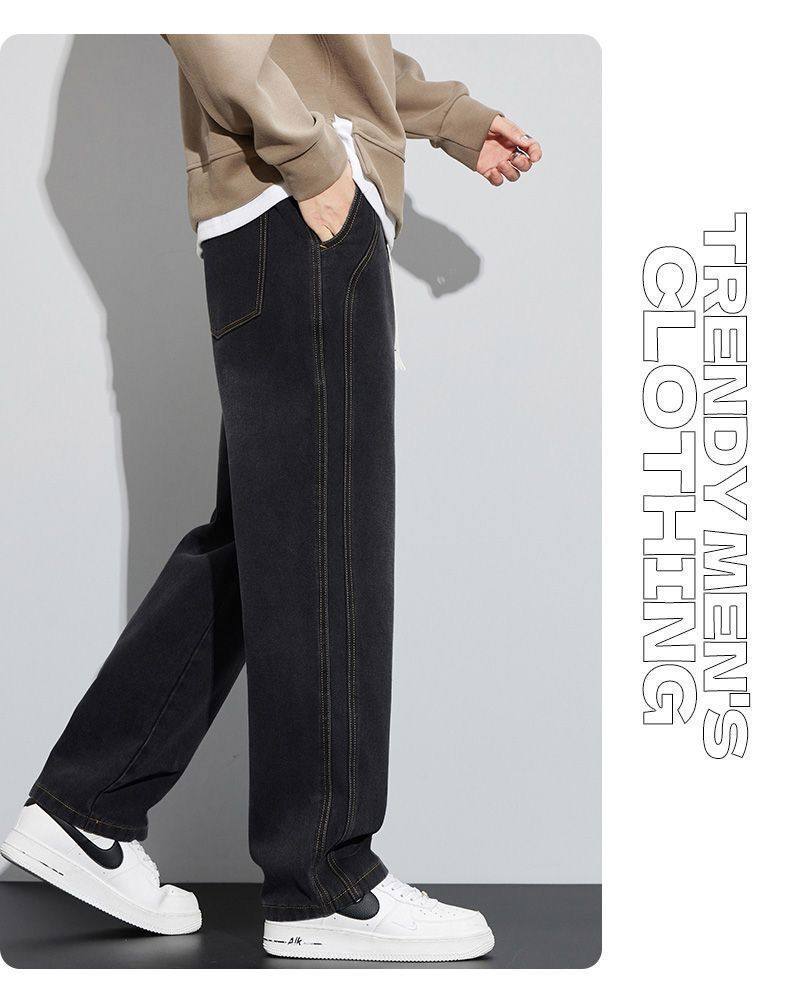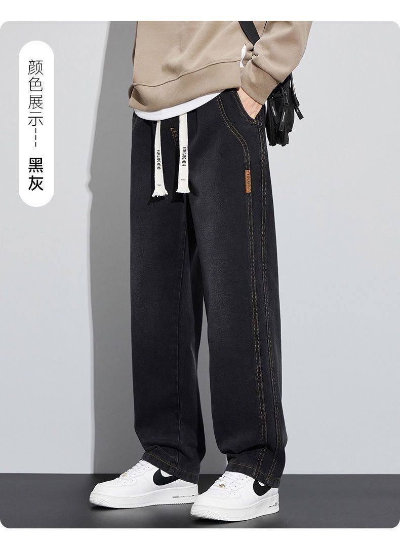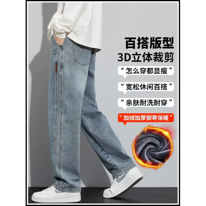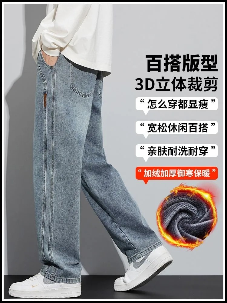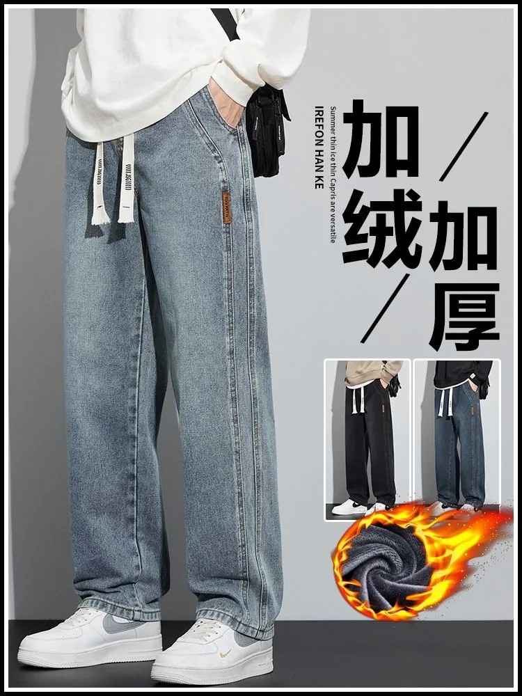 牛仔褲男款冬季加絨加厚松緊腰直筒寬鬆春秋新款濶腿工裝休閒長褲