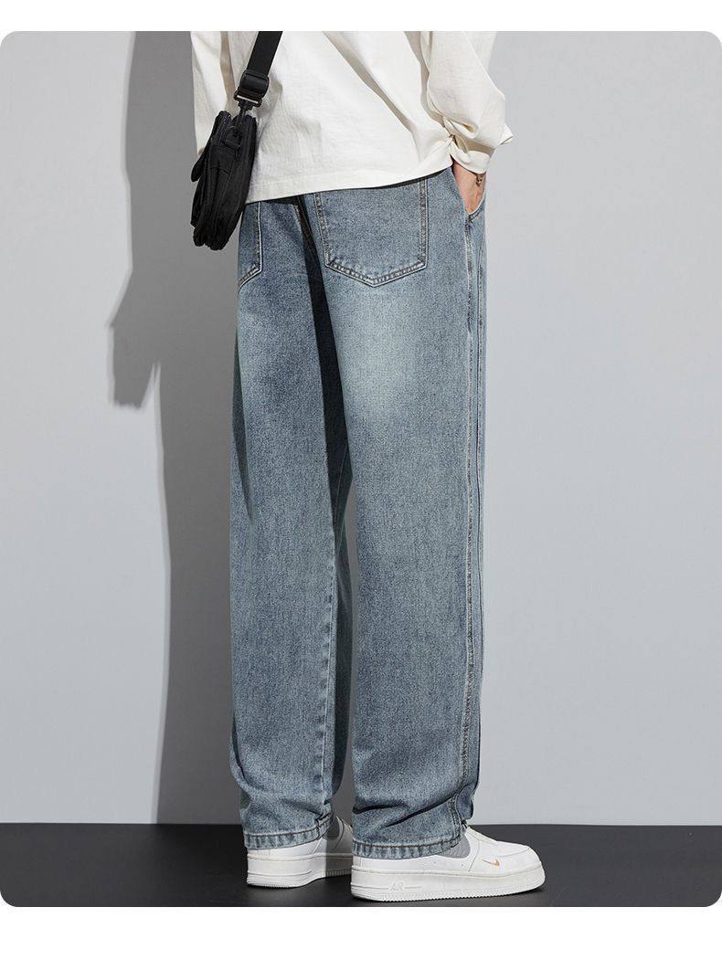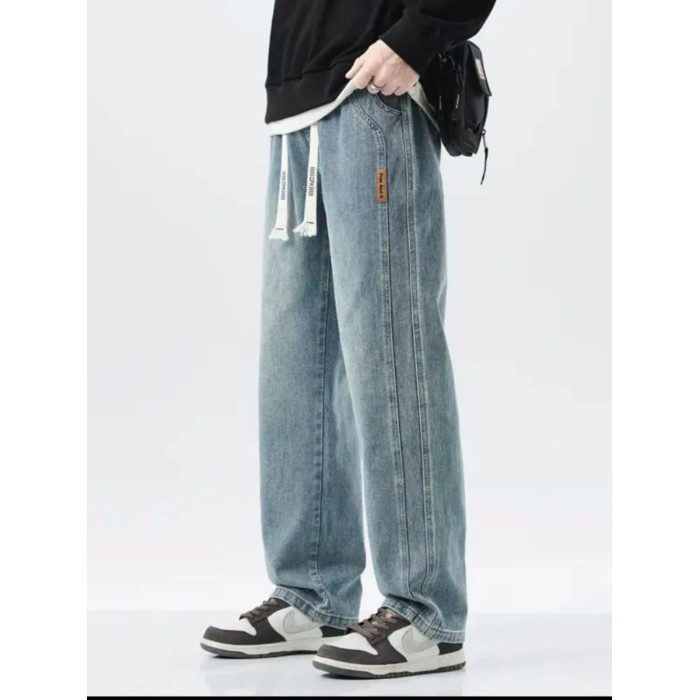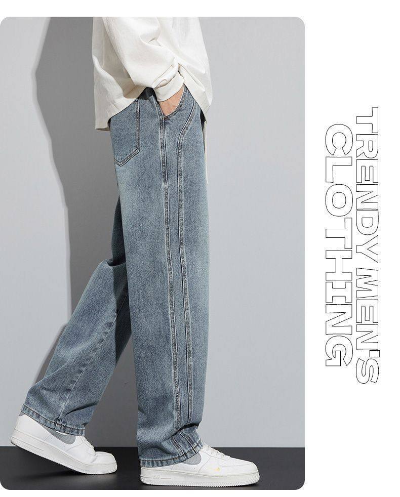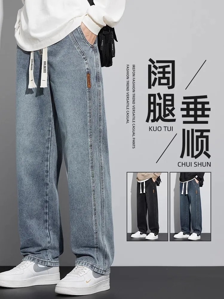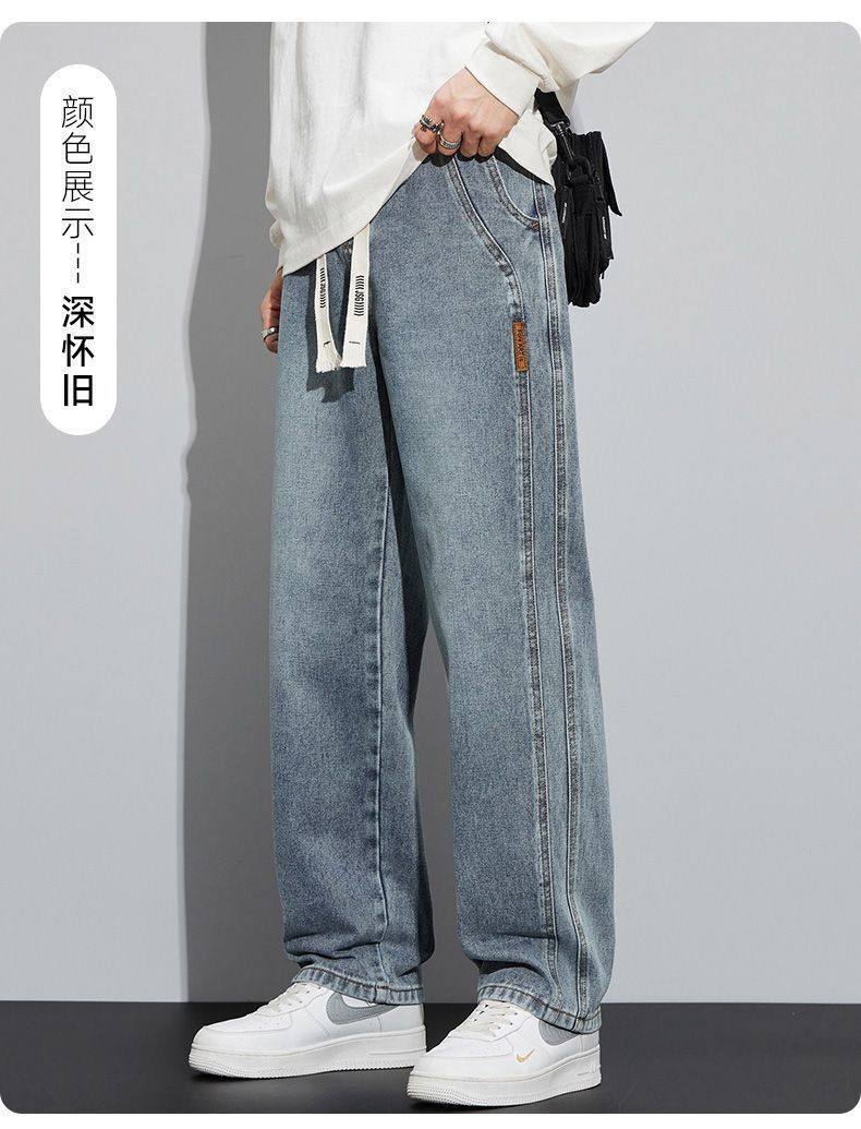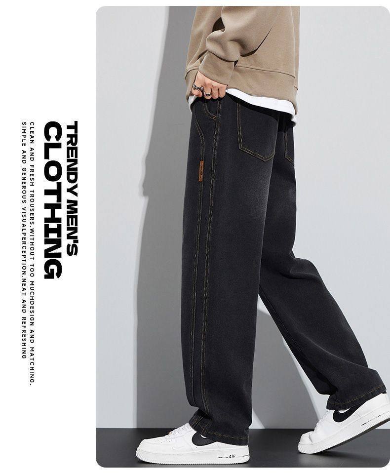牛仔褲男款冬季加絨加厚松緊腰直筒寬鬆春秋新款濶腿工裝休閒長褲
