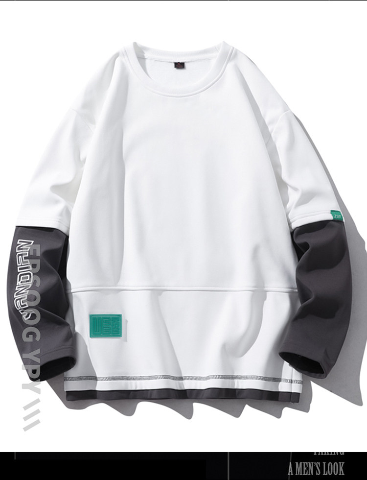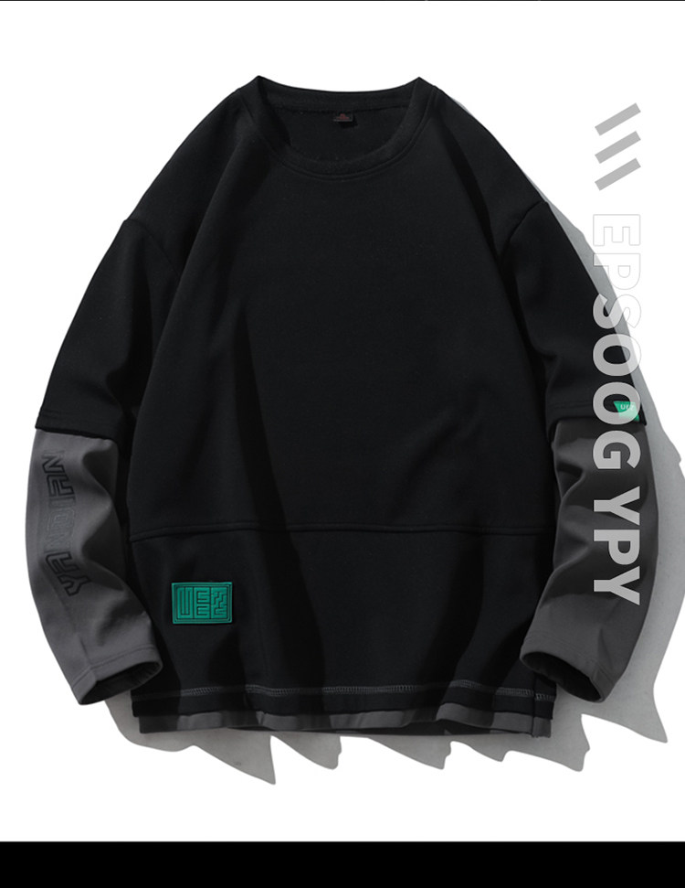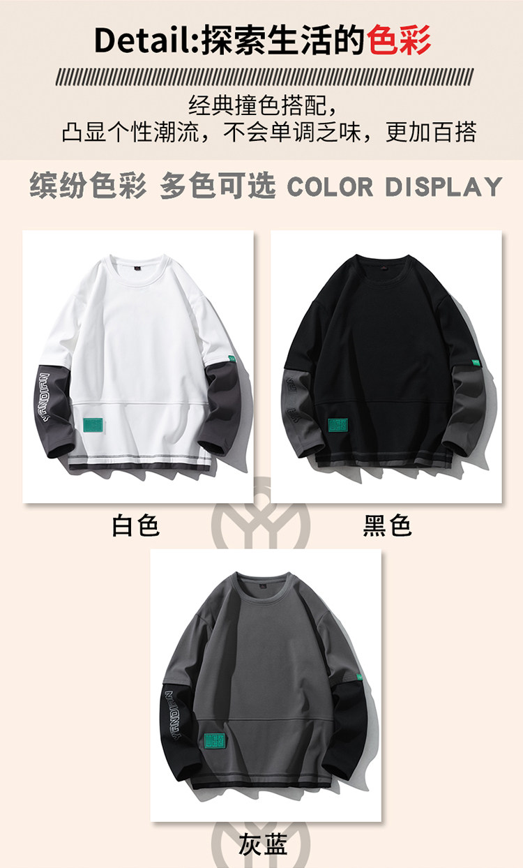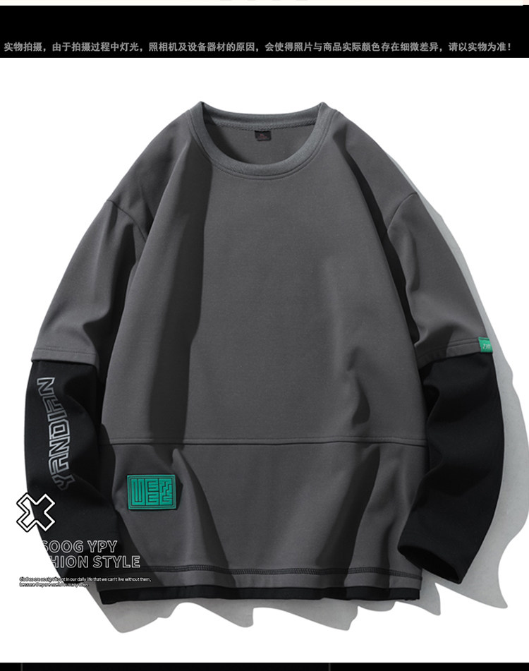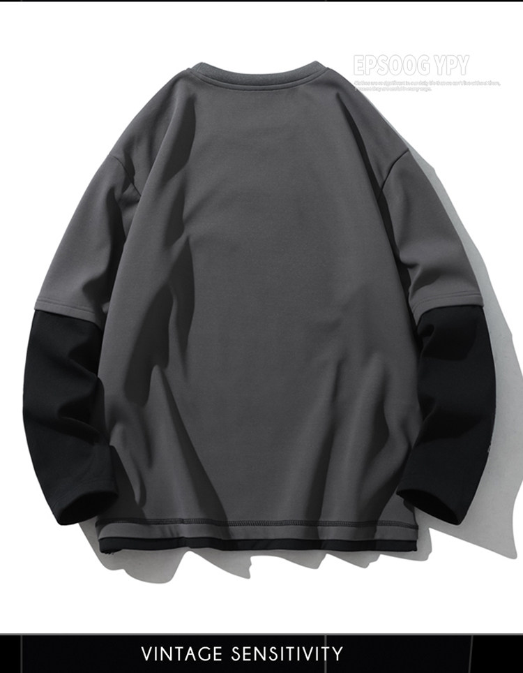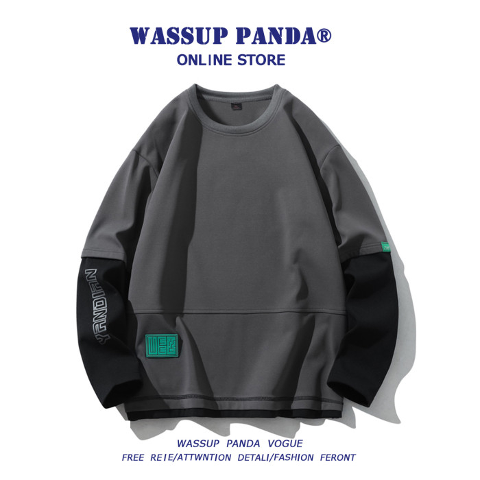 WASSUP PANDA潮牌假兩件衛衣男寬鬆休閒圓領內搭拼接長袖t恤上衣