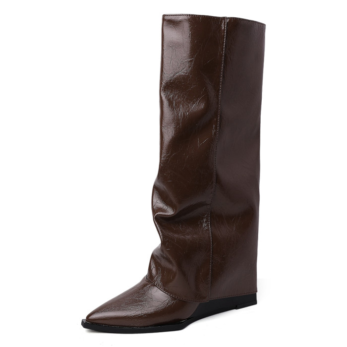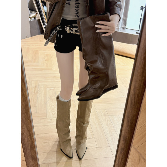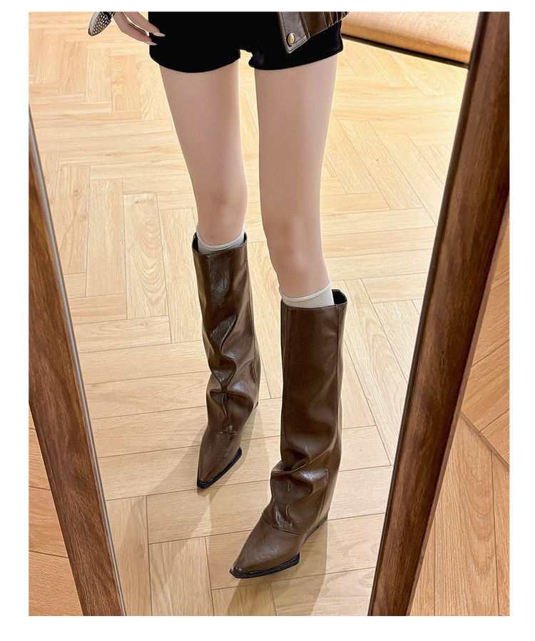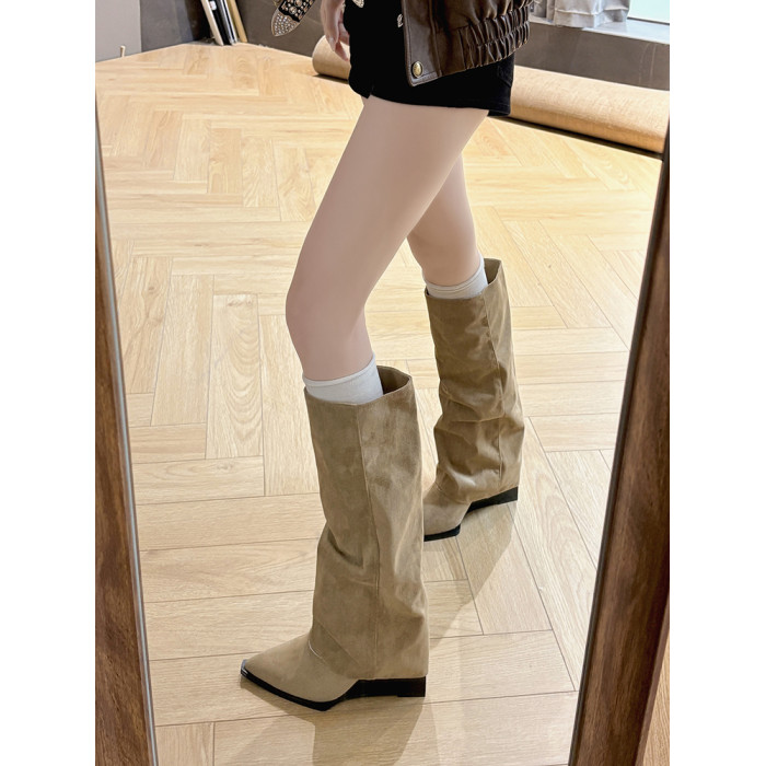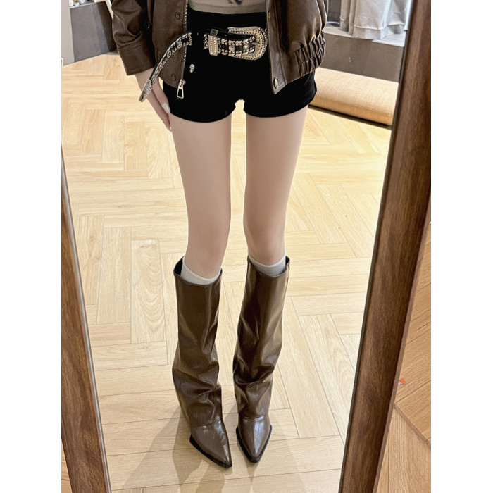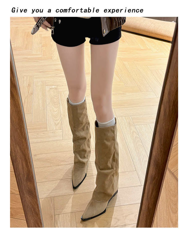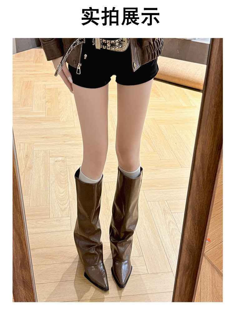 西部牛仔靴子女長筒尖頭粗跟寬鬆顯瘦2026冬新款不過膝高筒騎士靴