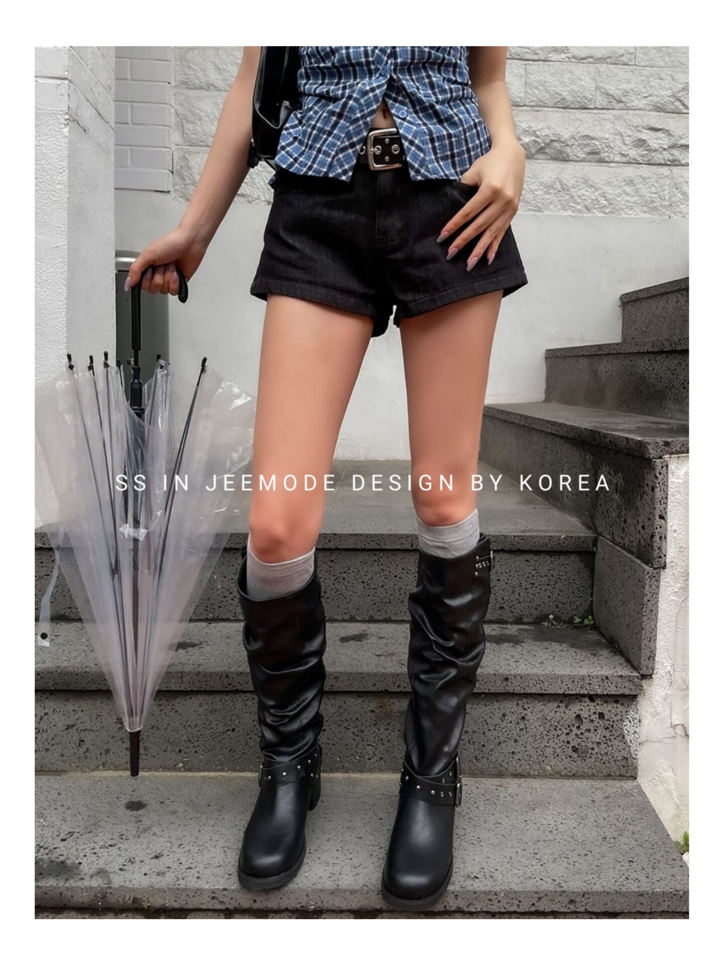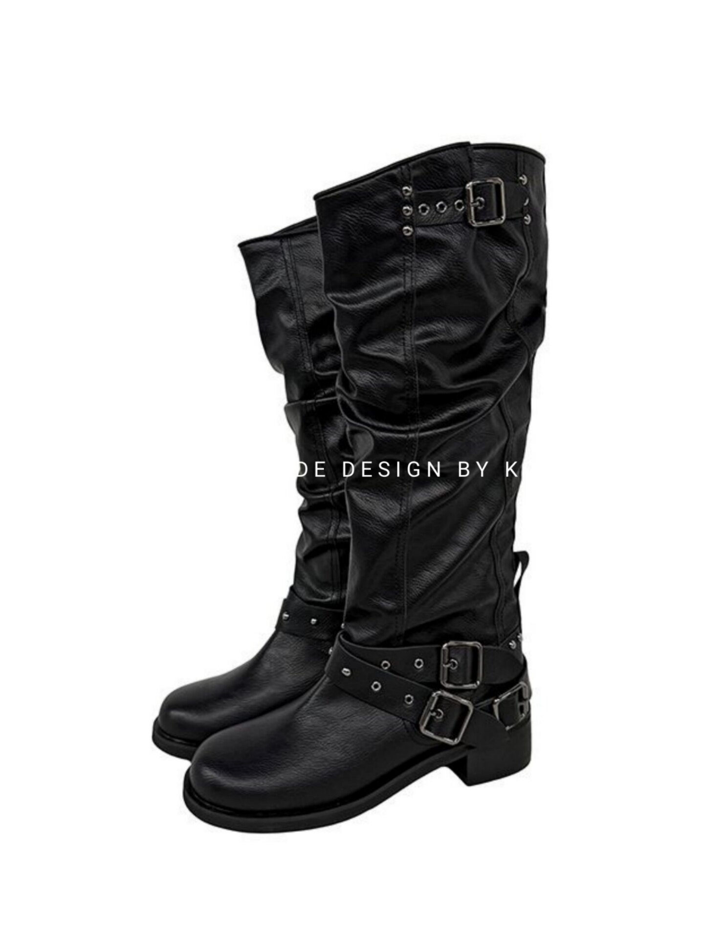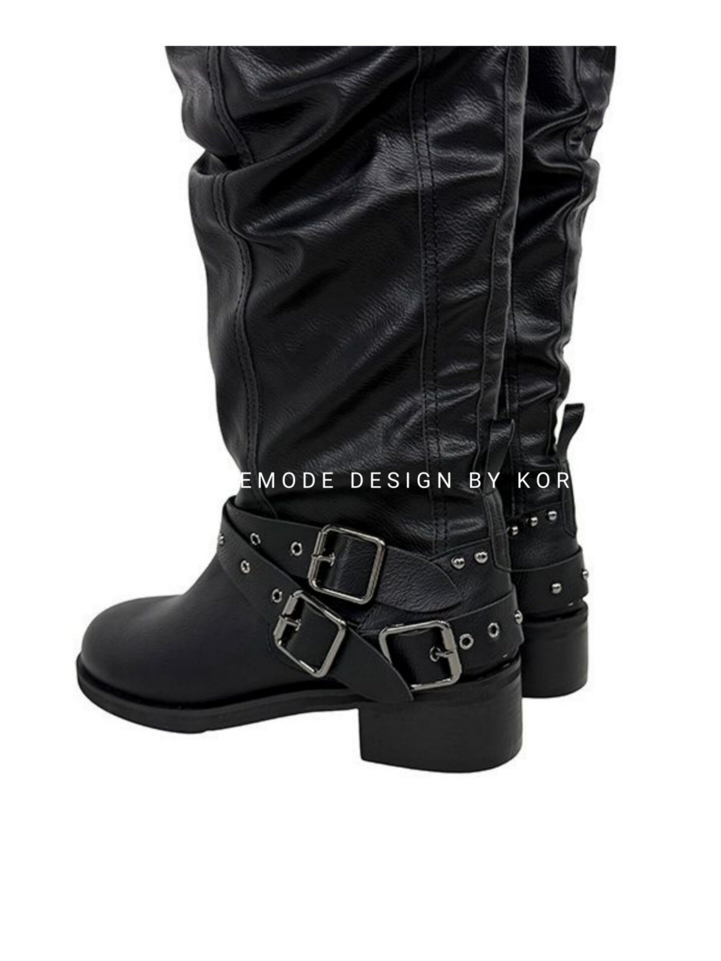 小池在首爾25年秋季新款套筒復古鉚釘皮帶釦個性機車靴褶皺堆堆靴