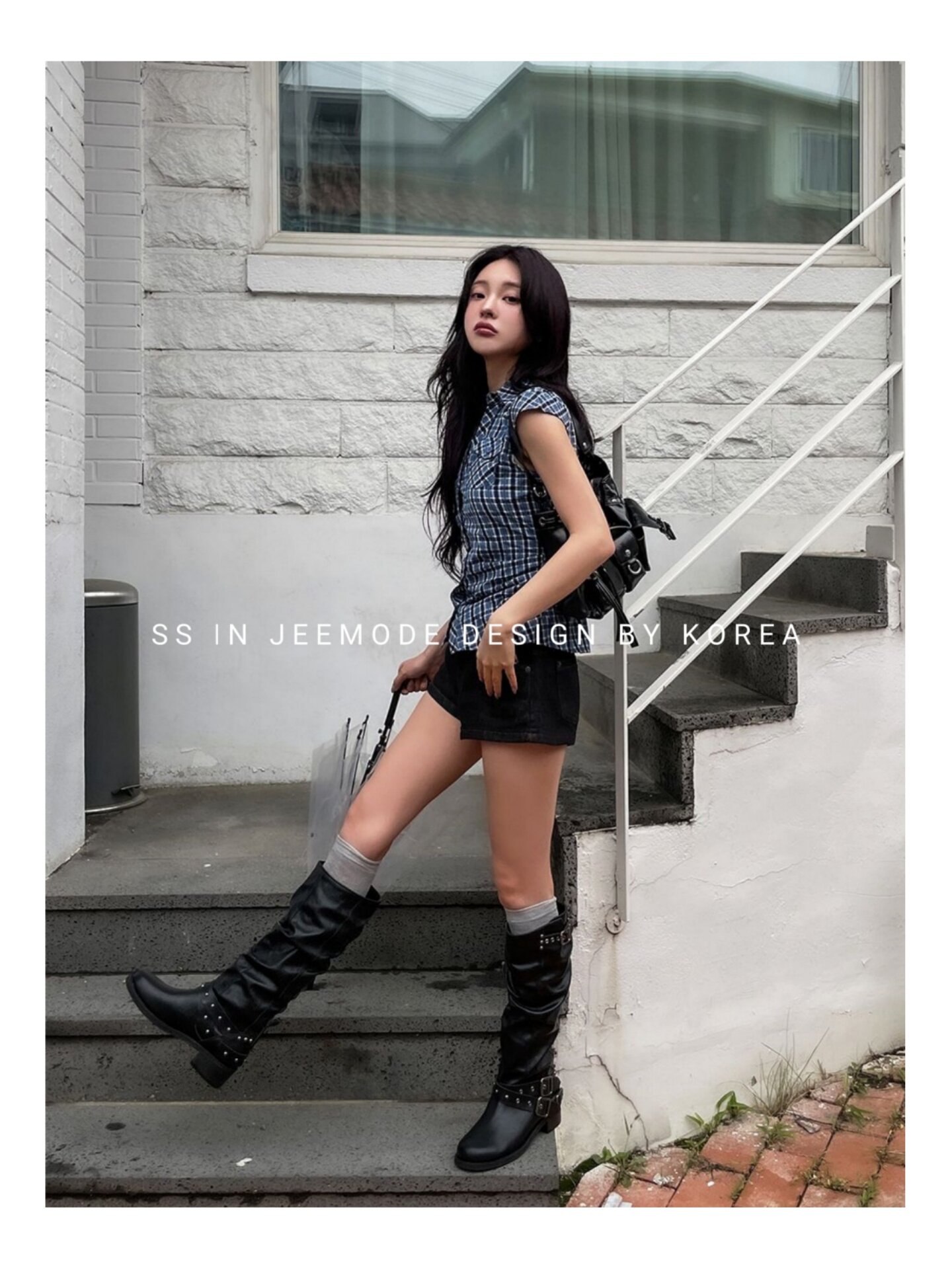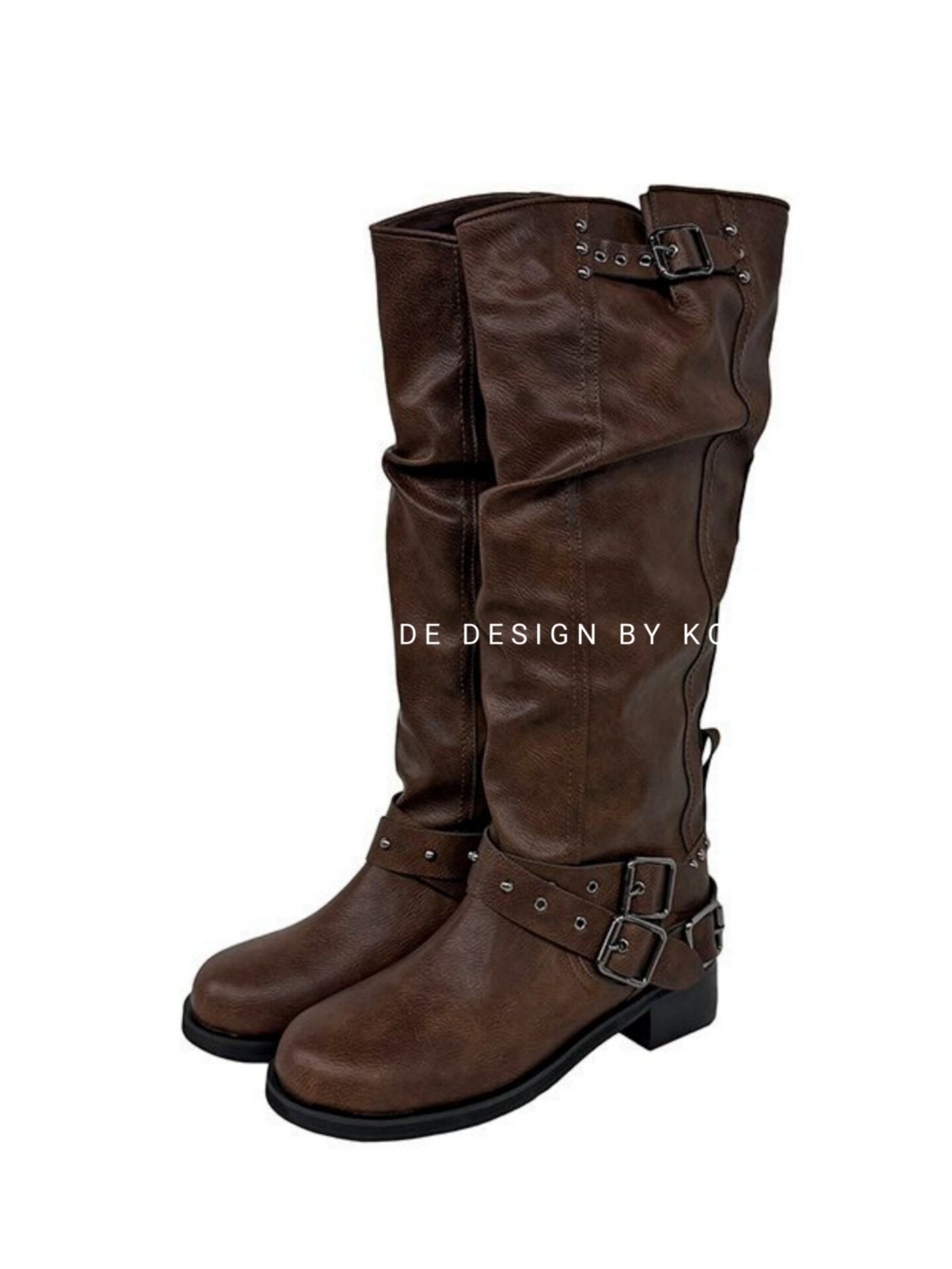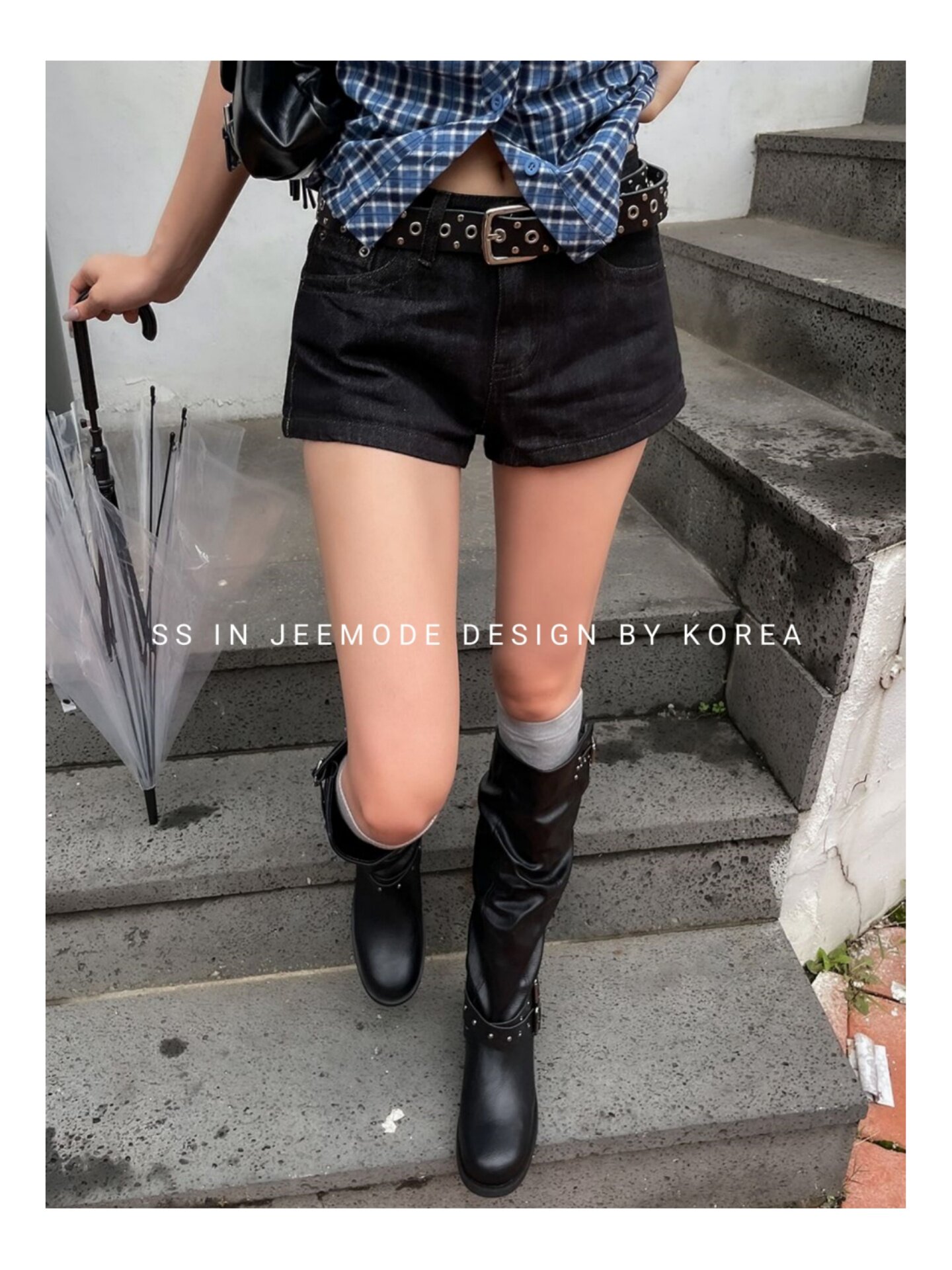 小池在首爾25年秋季新款套筒復古鉚釘皮帶釦個性機車靴褶皺堆堆靴