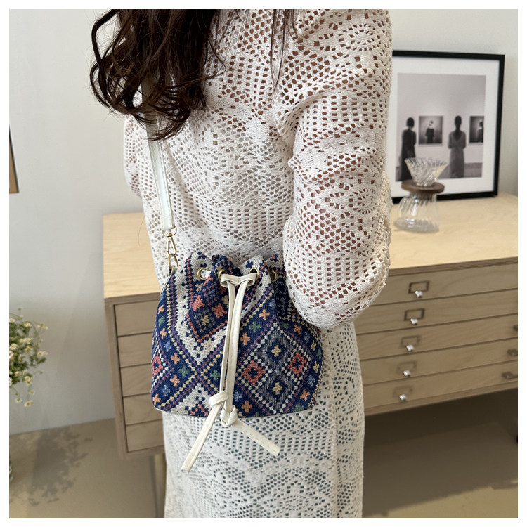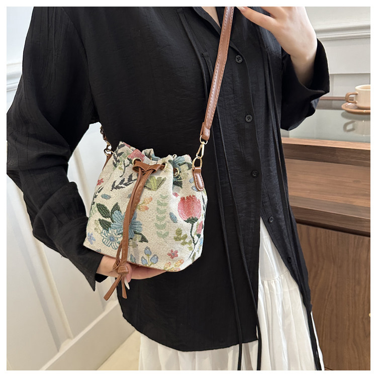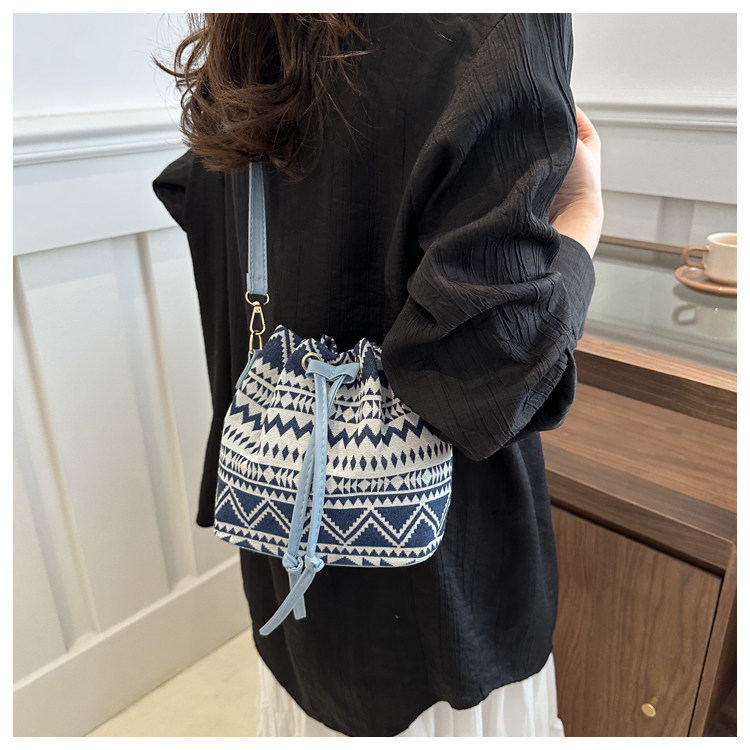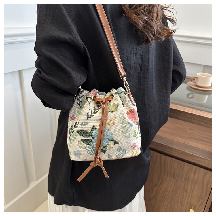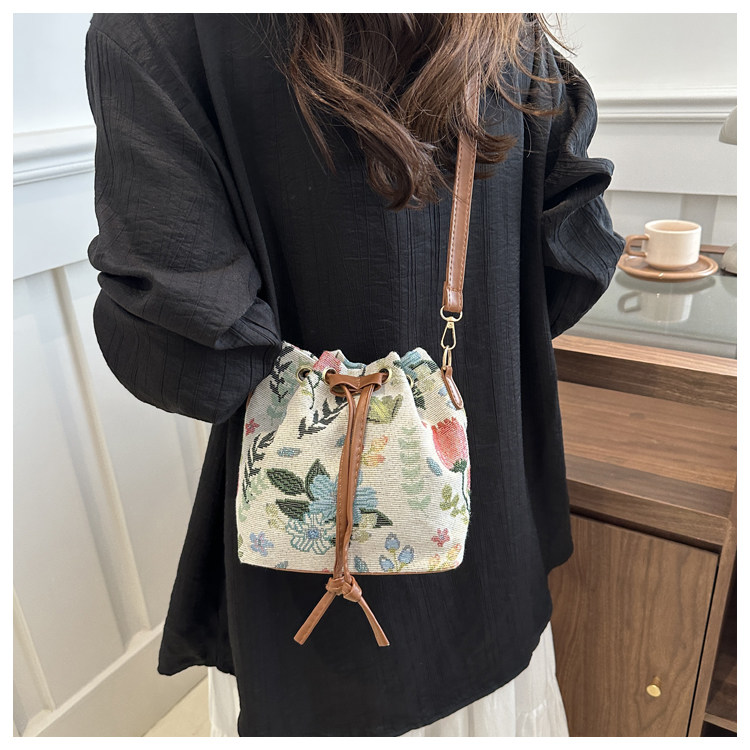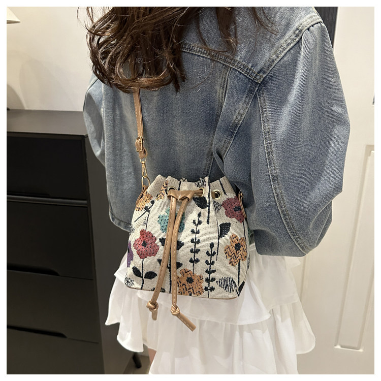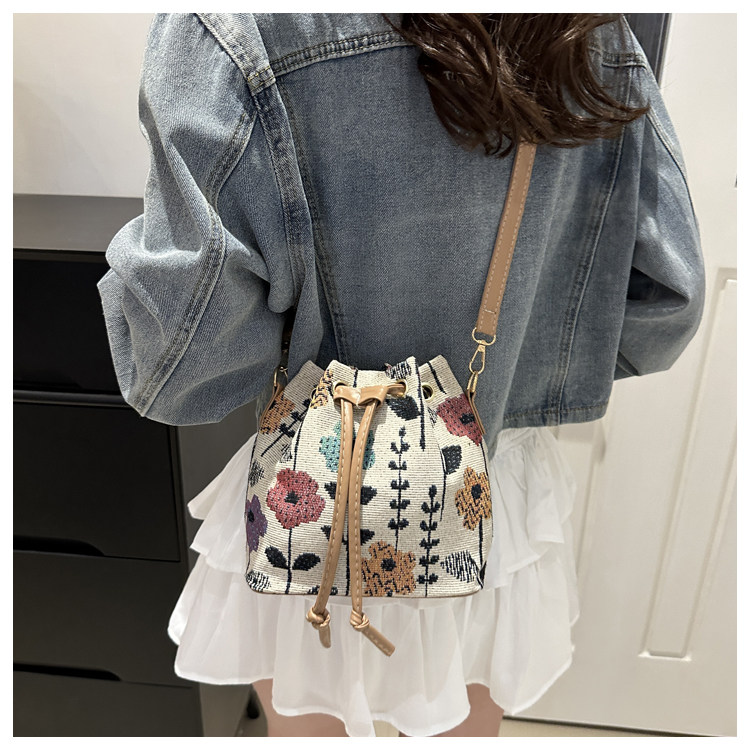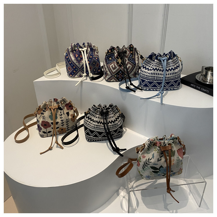 2024新款潮輕便抽繩帆布女包花卉條紋民族風大容量單肩斜背水桶包