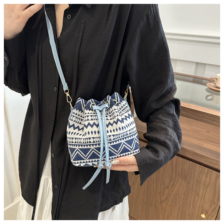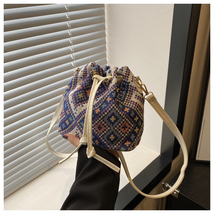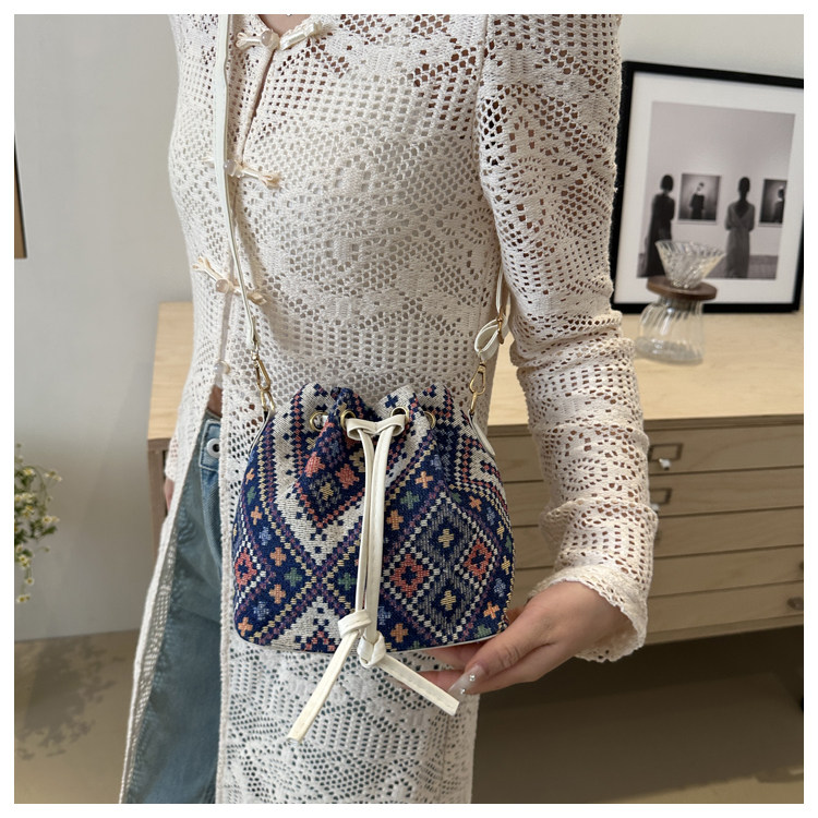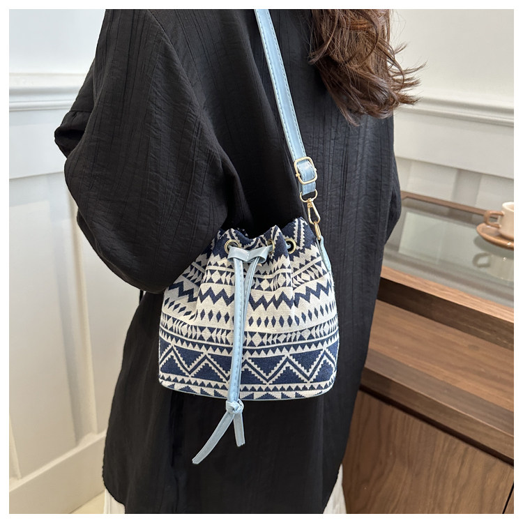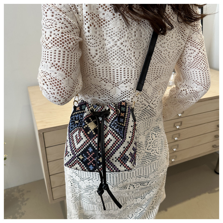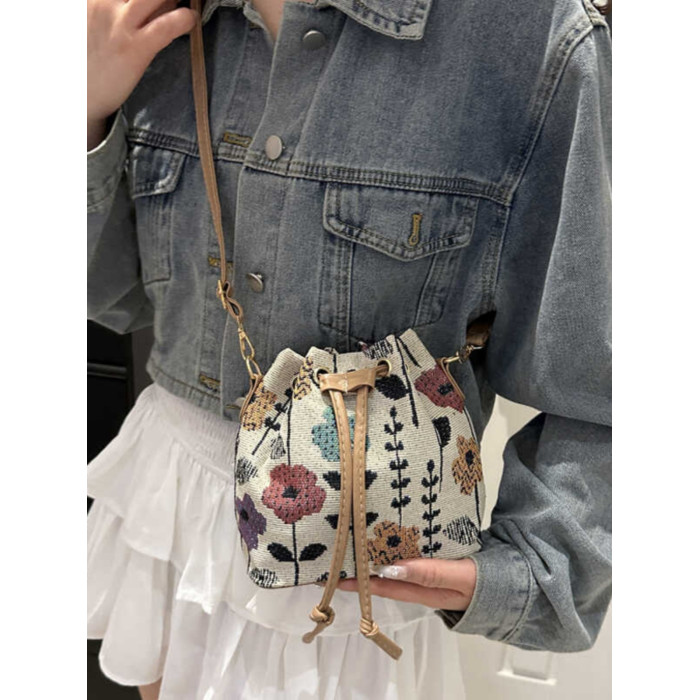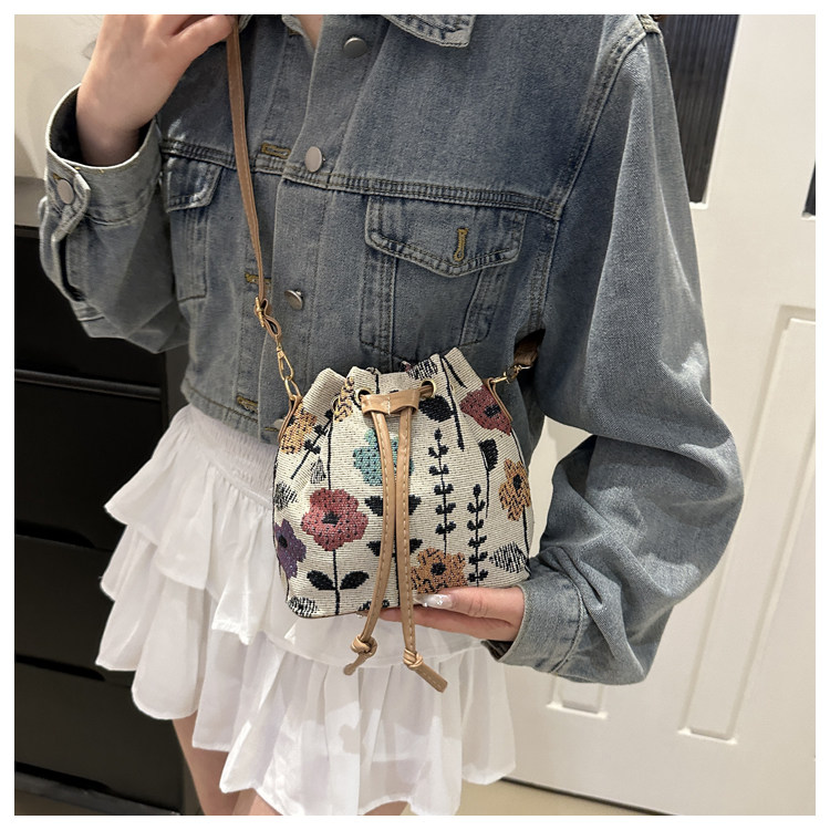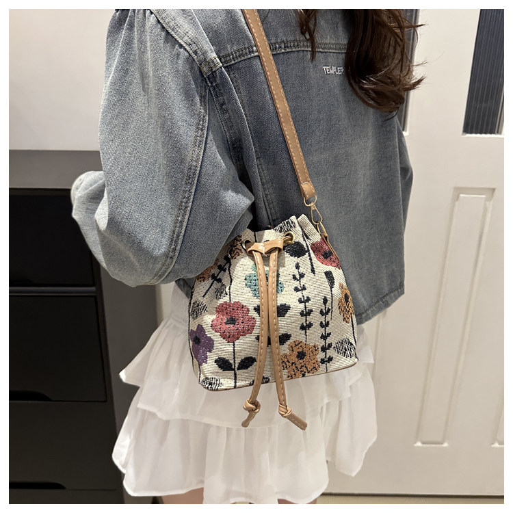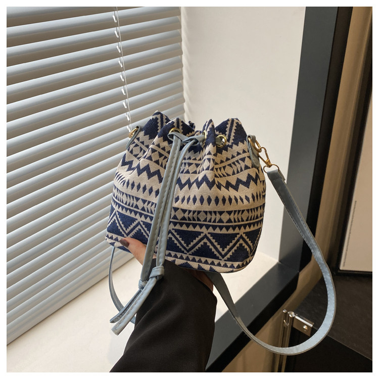 2024新款潮輕便抽繩帆布女包花卉條紋民族風大容量單肩斜背水桶包