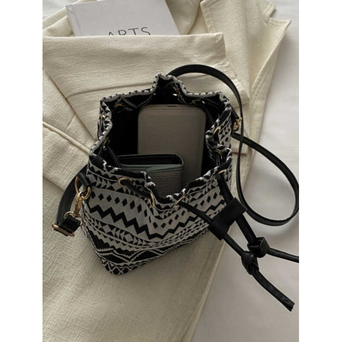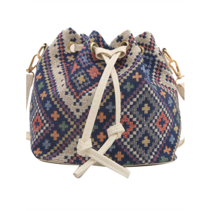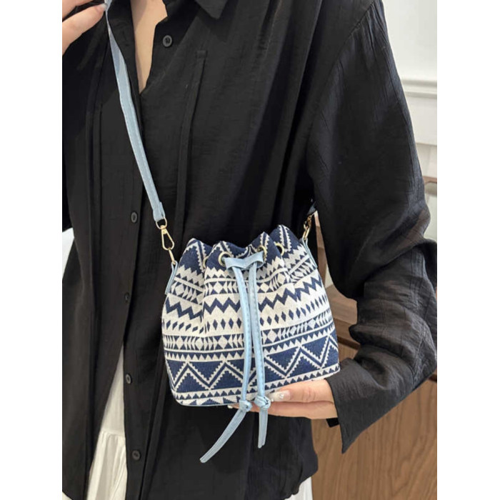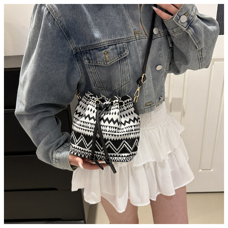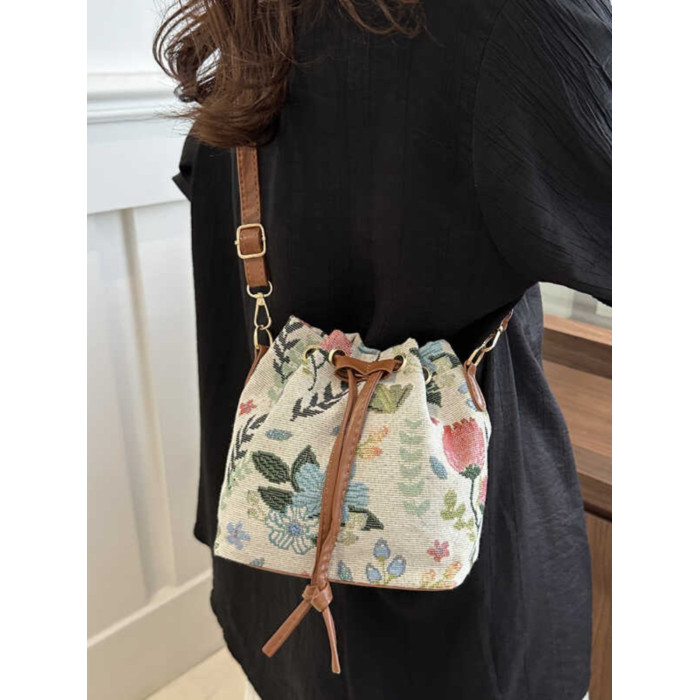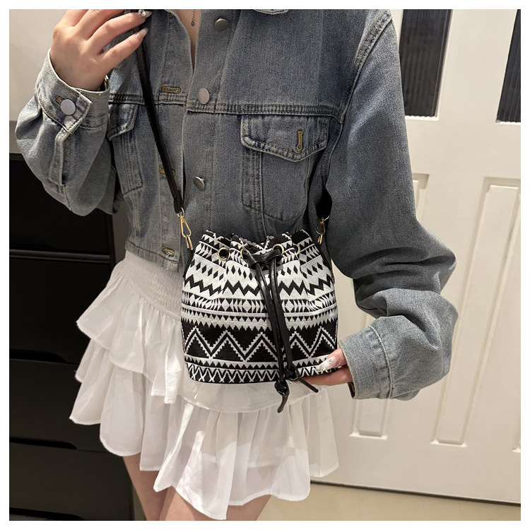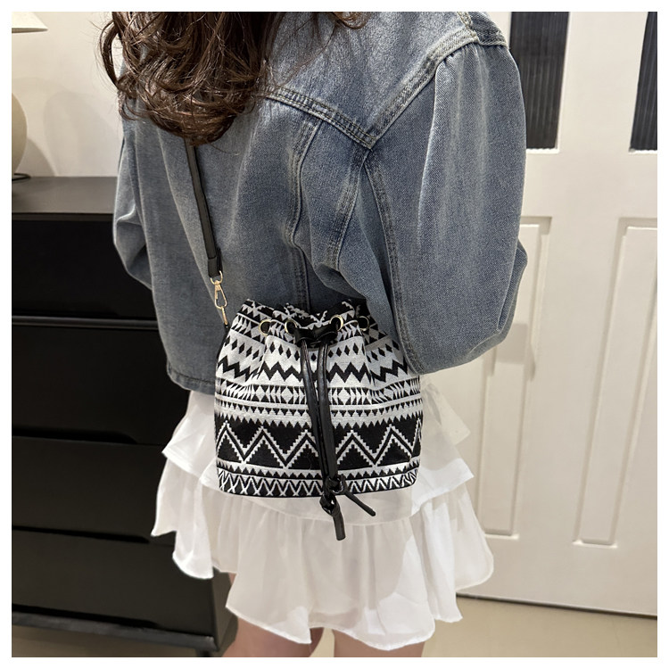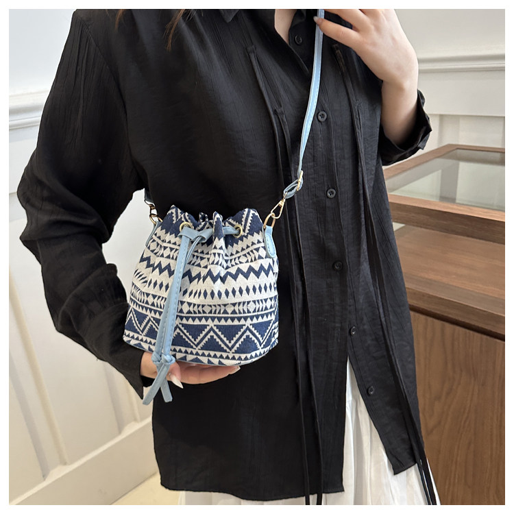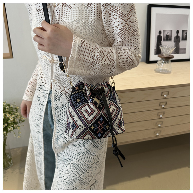 2024新款潮輕便抽繩帆布女包花卉條紋民族風大容量單肩斜背水桶包