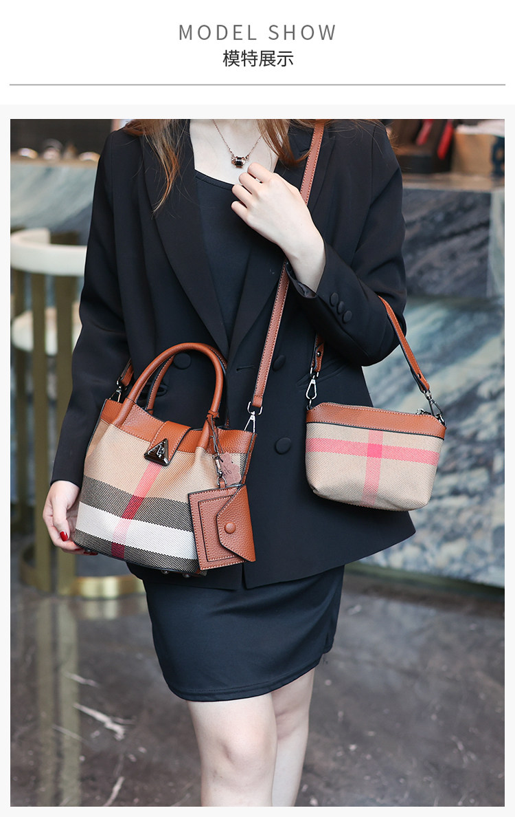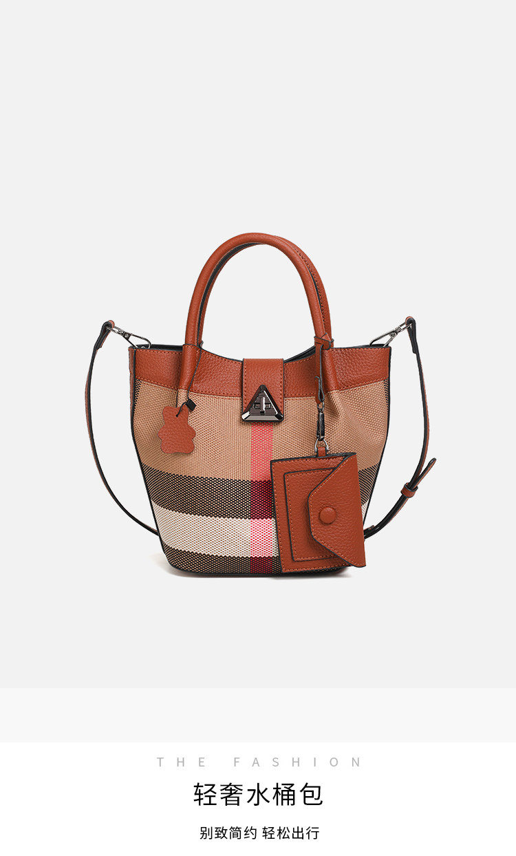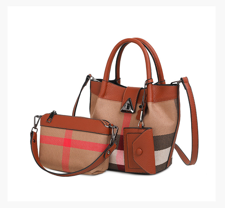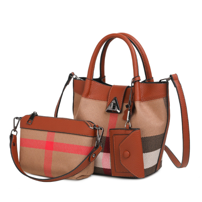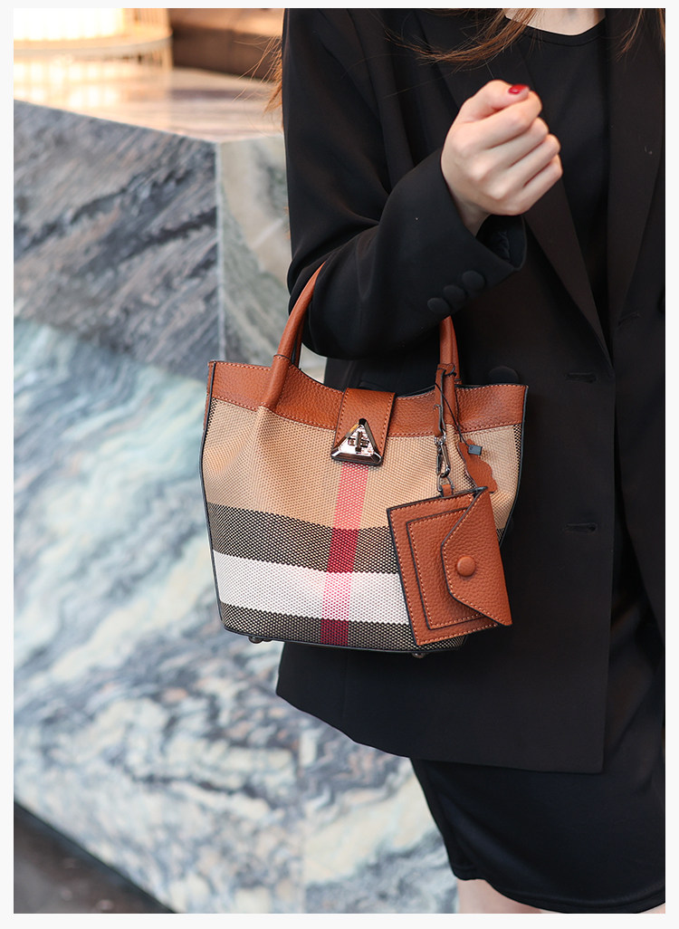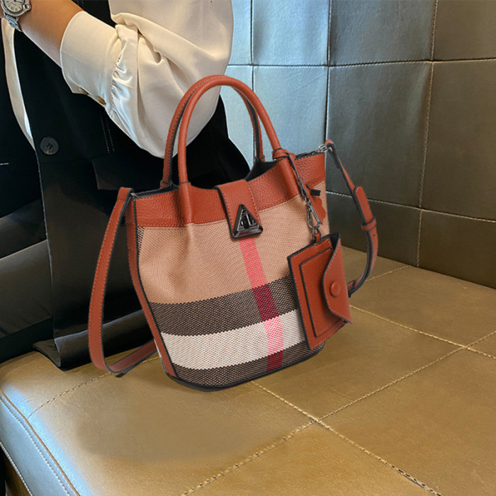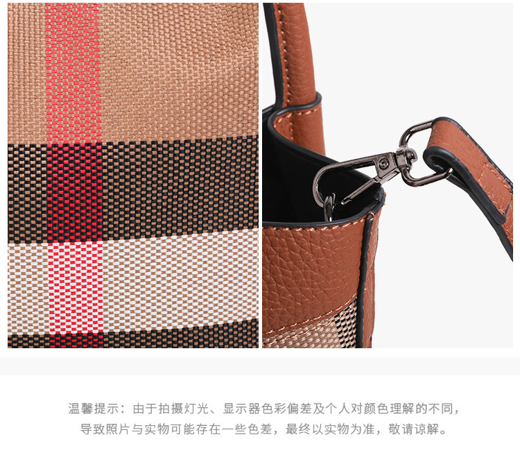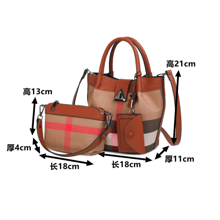 包包女新款格子帆布包時尚真皮子母包三件套水桶包手提單肩斜後後背包