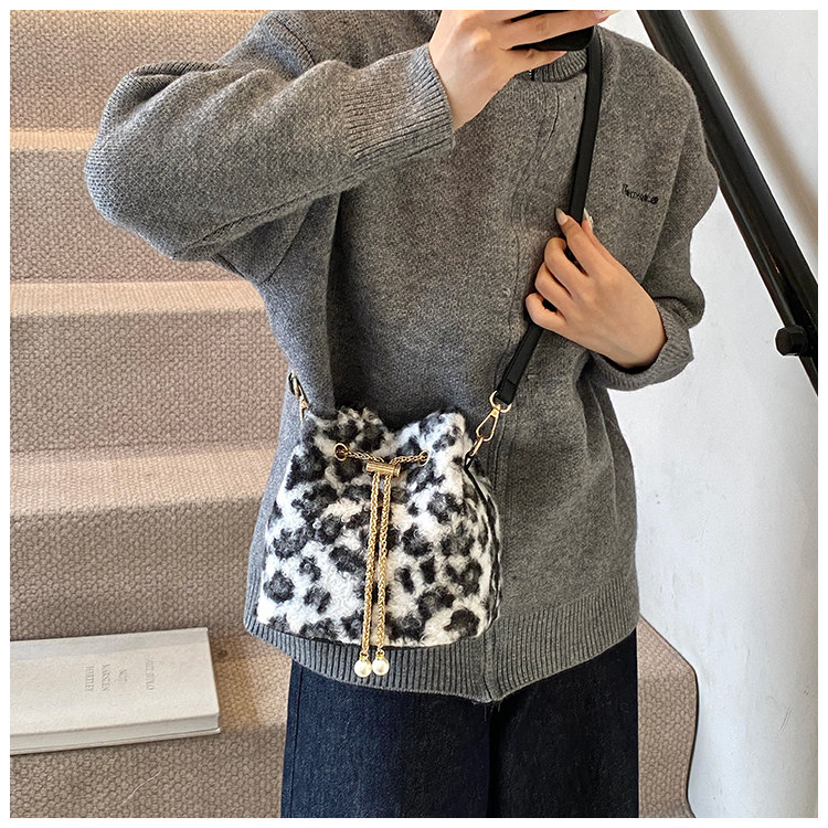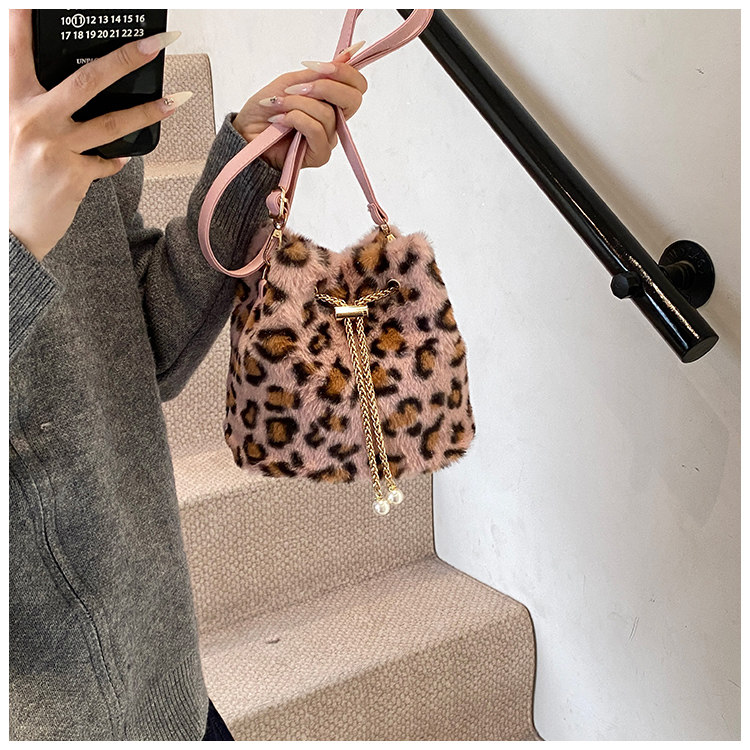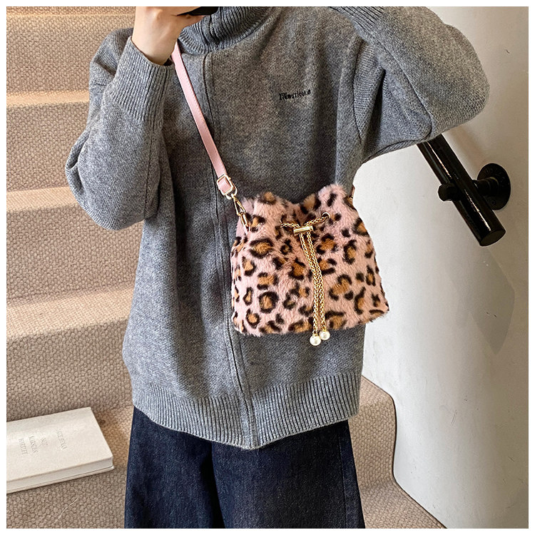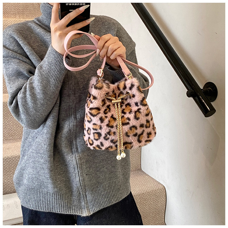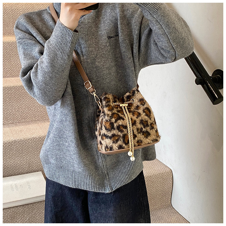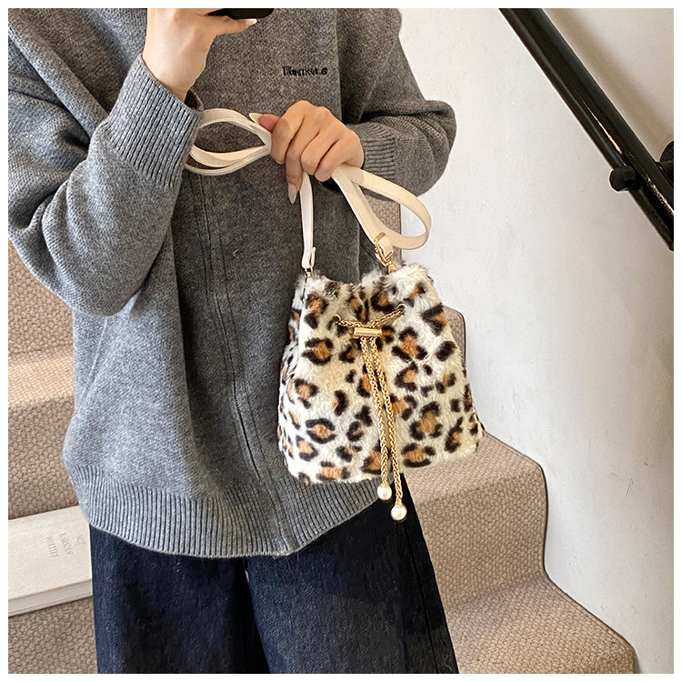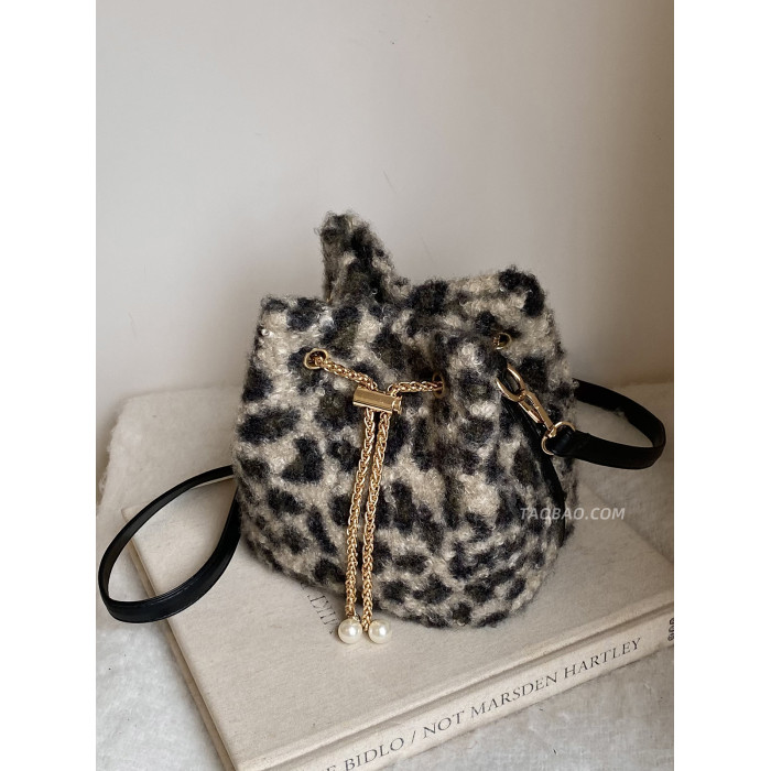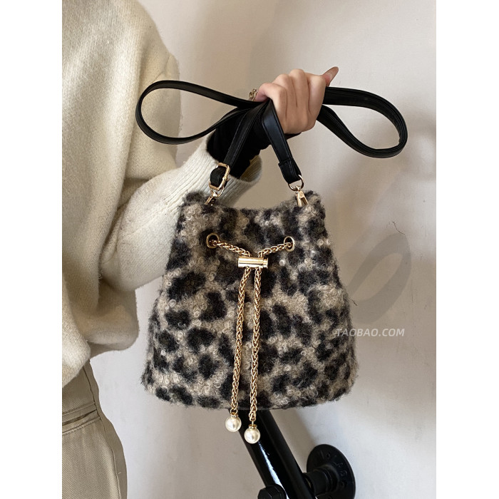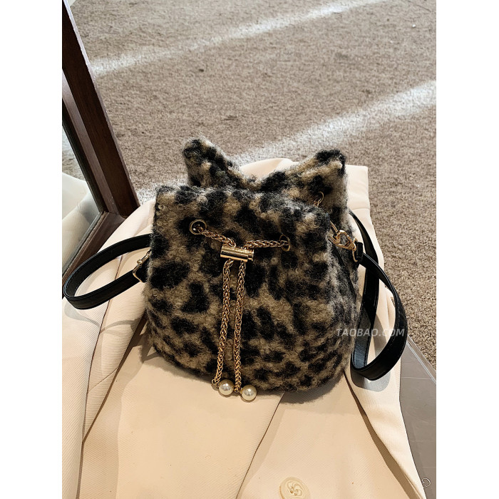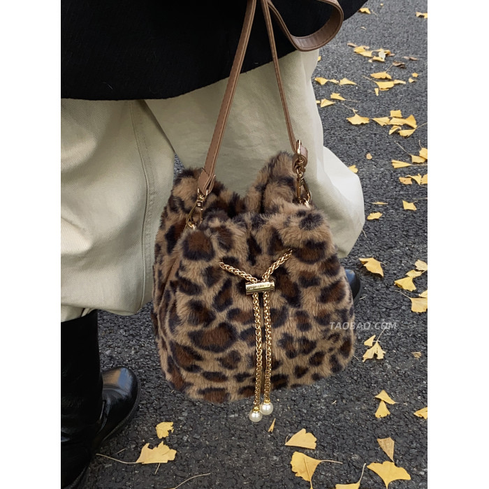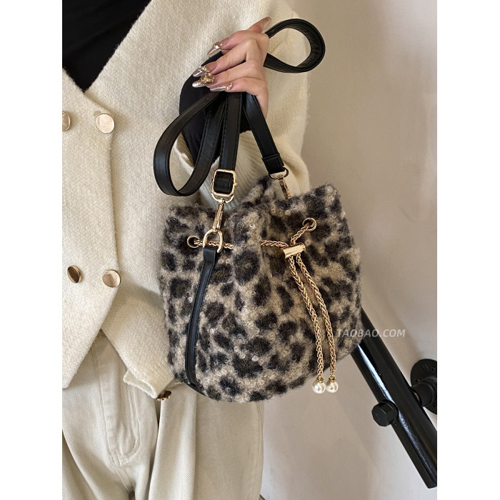 秋冬季超火小衆豹紋毛茸茸包包女2025新款百搭斜後後背包毛毛包水桶包