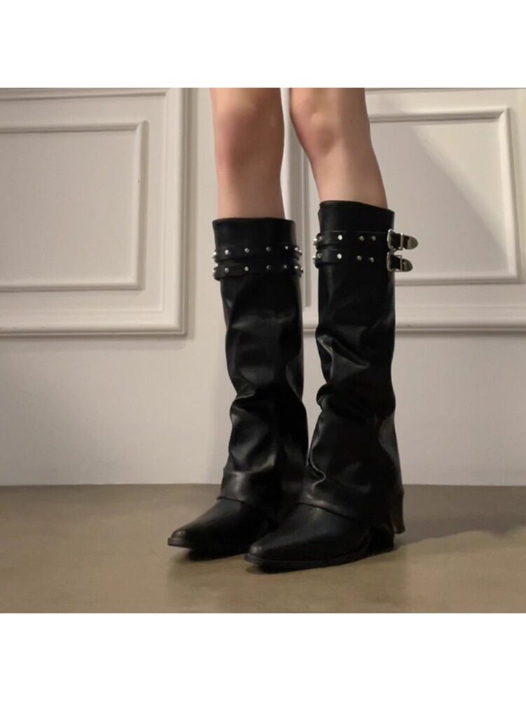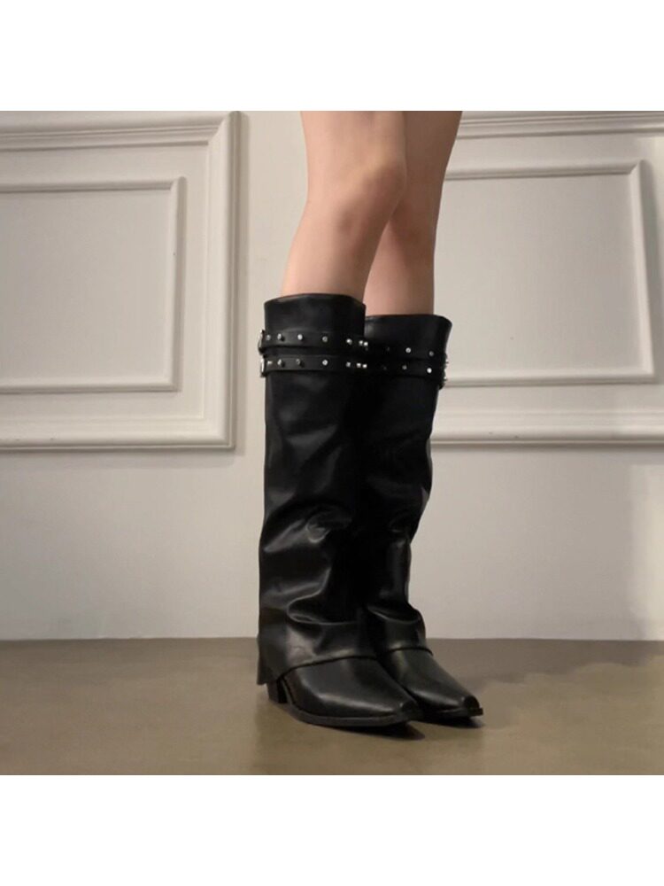 牛皮版~甜酷辣妹氣質粗跟褲琯靴女復古黑色皮帶釦鉚釘尖頭騎士靴