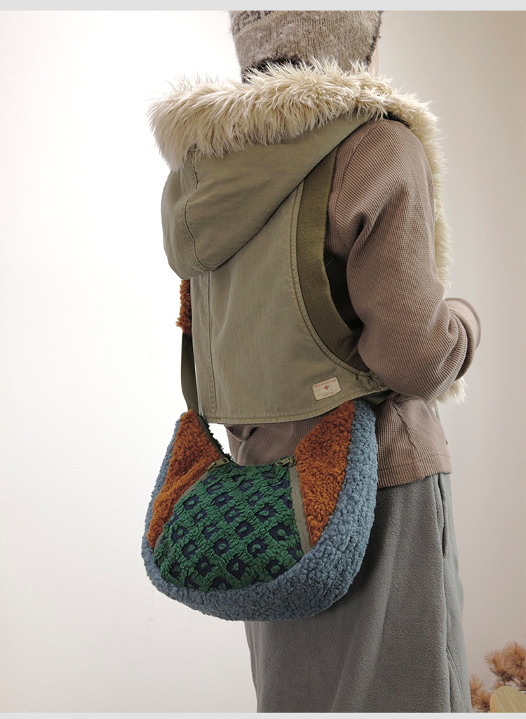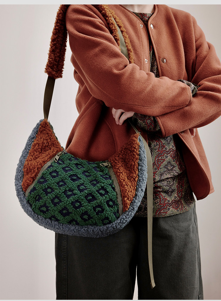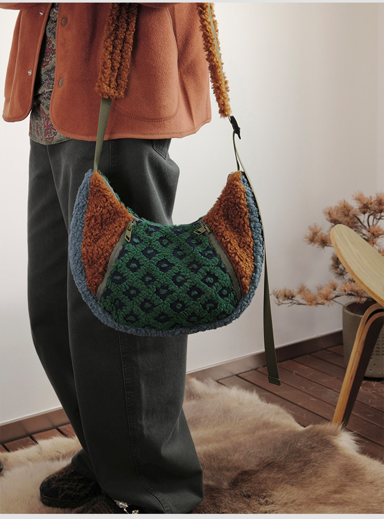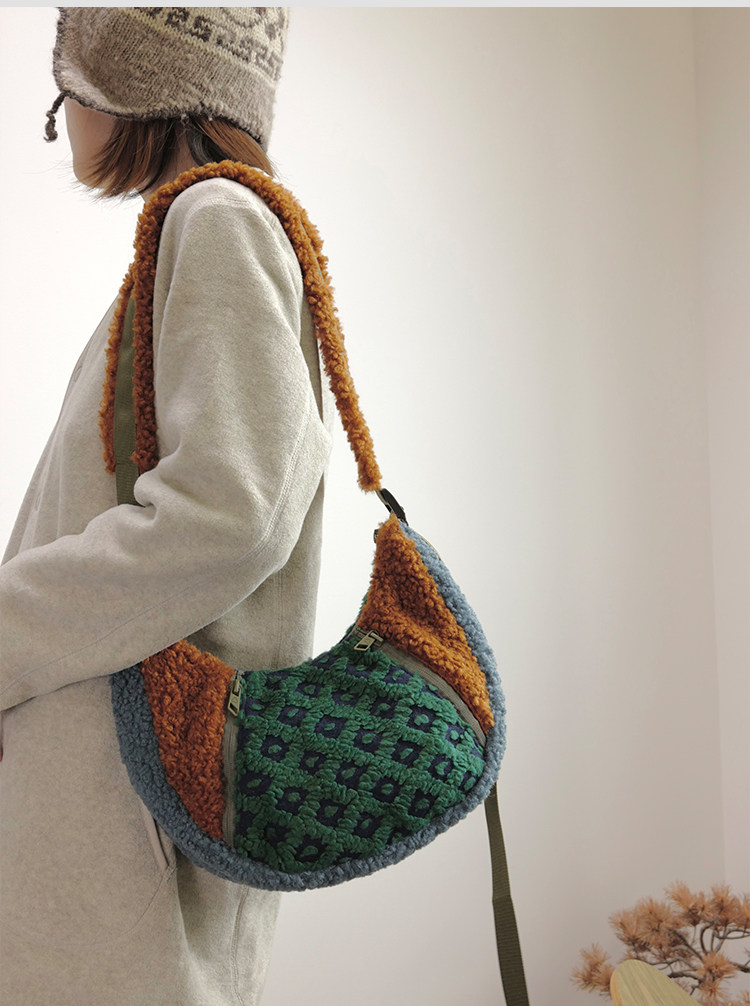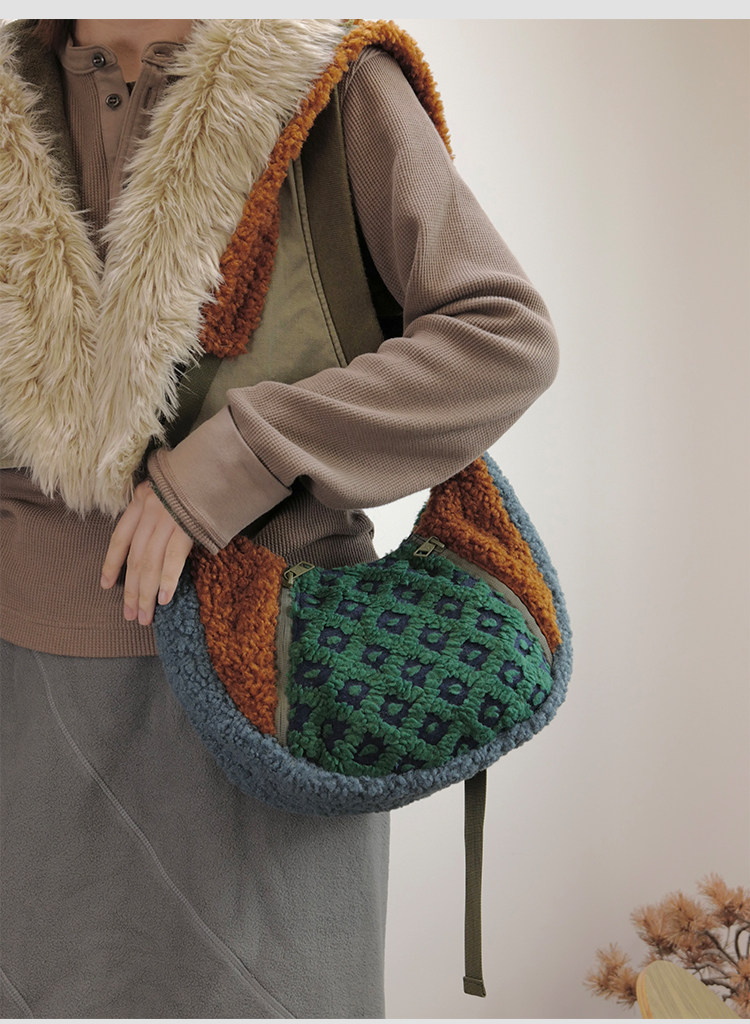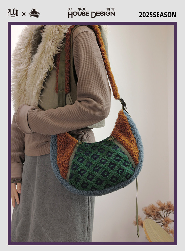 housedesign原創2025冬季撞色拼接毛絨月牙包小衆個性單肩斜後後背包