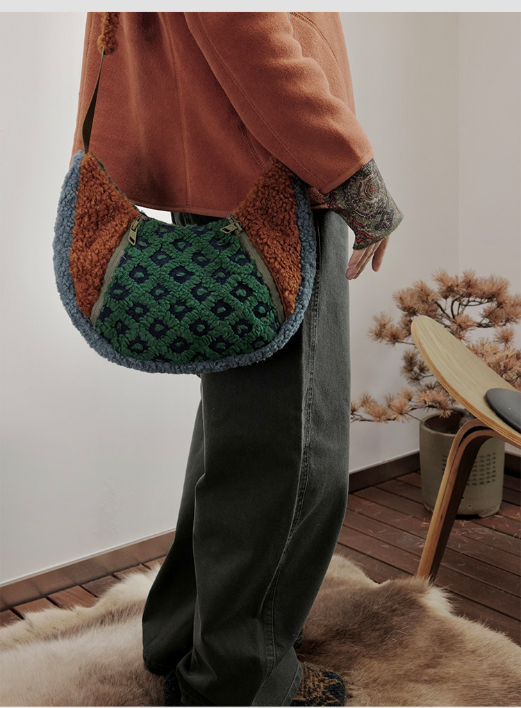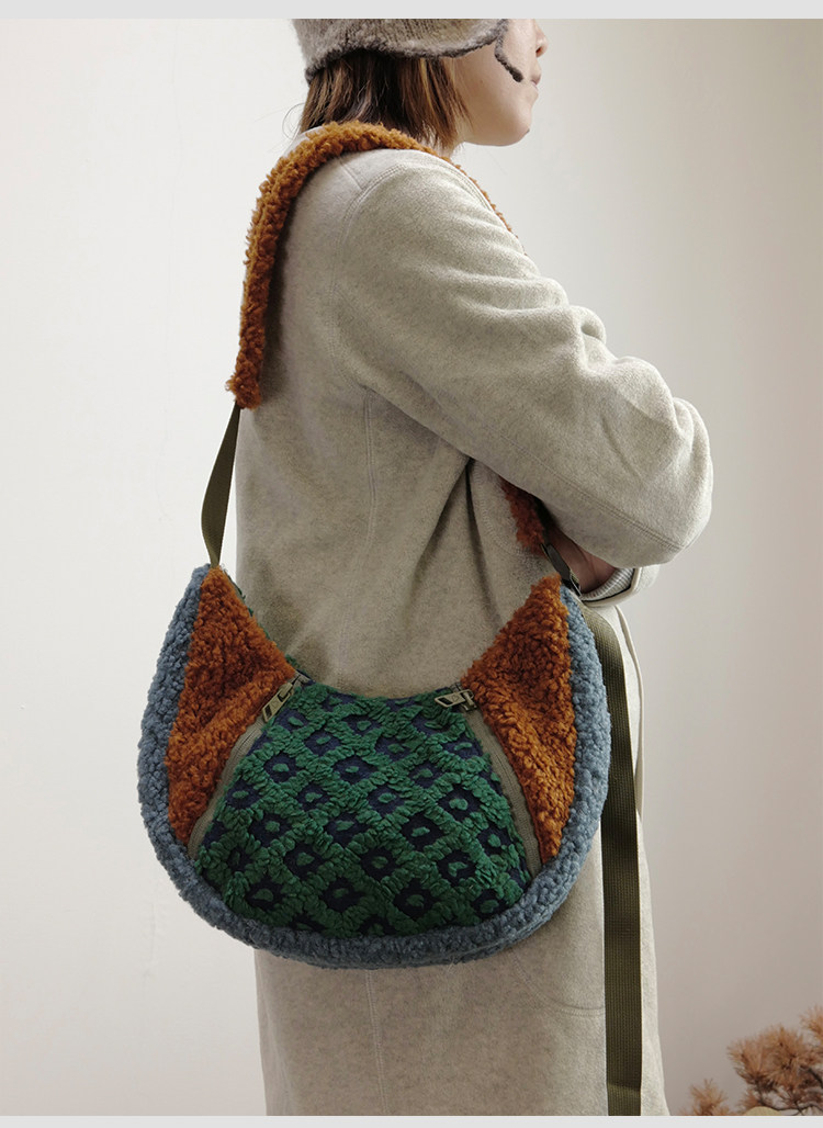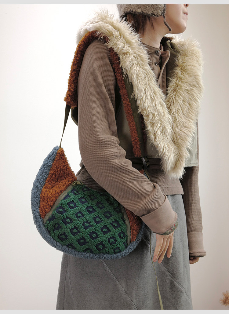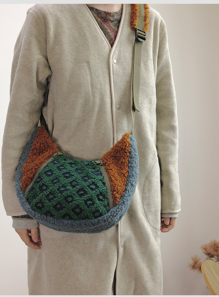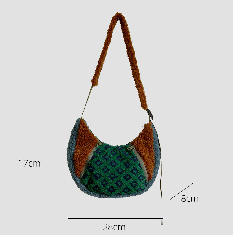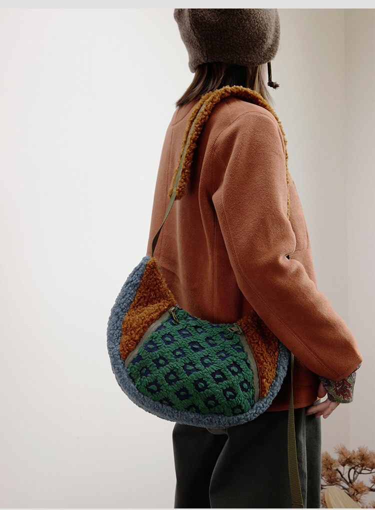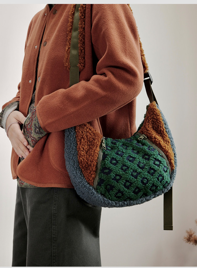 housedesign原創2025冬季撞色拼接毛絨月牙包小衆個性單肩斜後後背包
