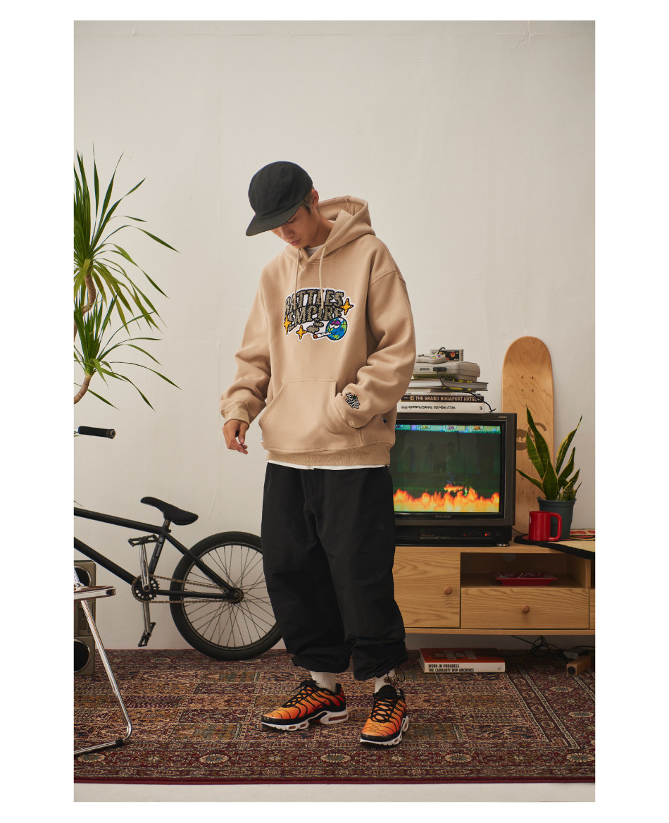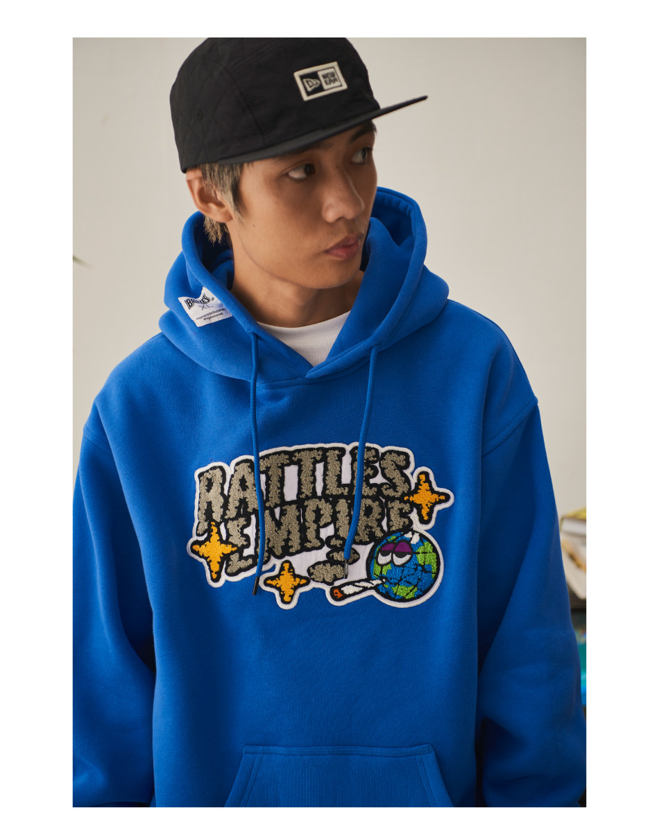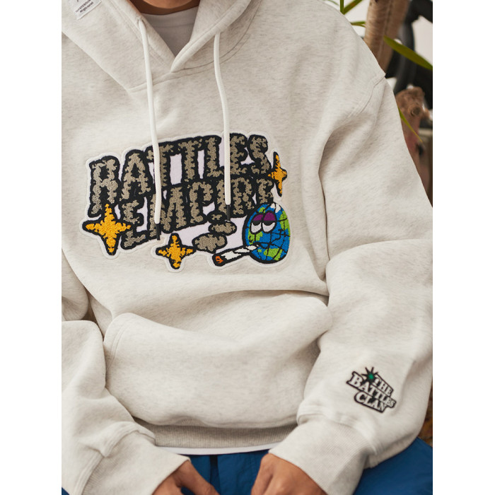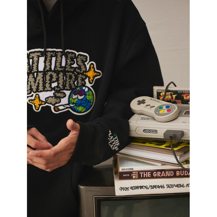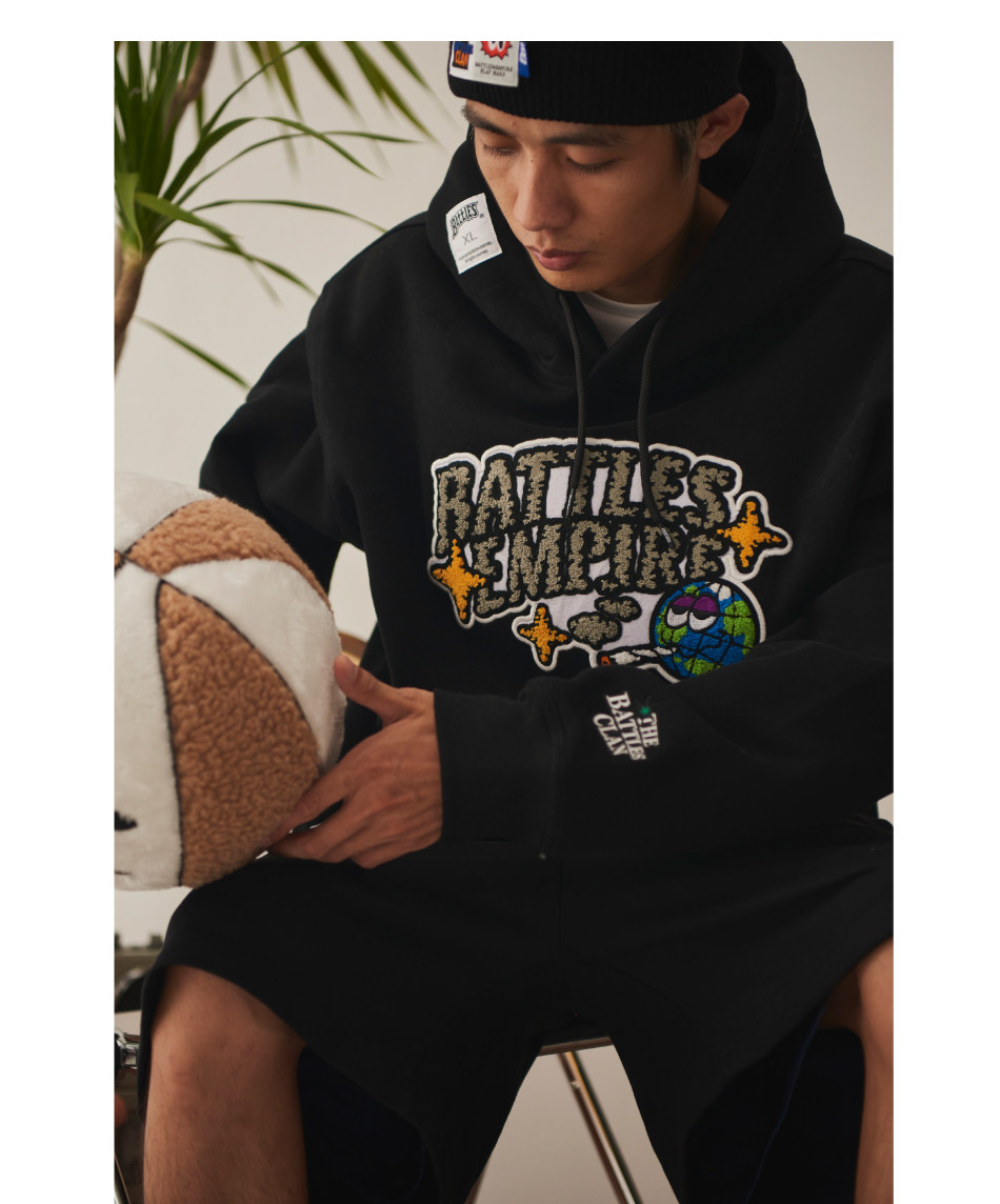 Battles 秋冬地球毛巾刺綉抓絨連帽衛衣男套頭外套寬鬆