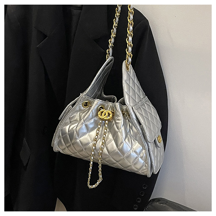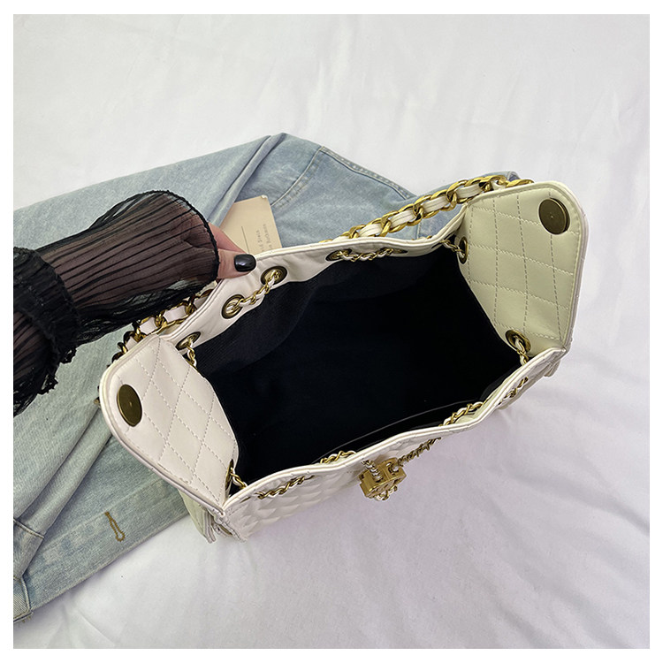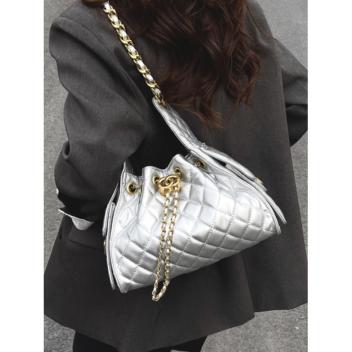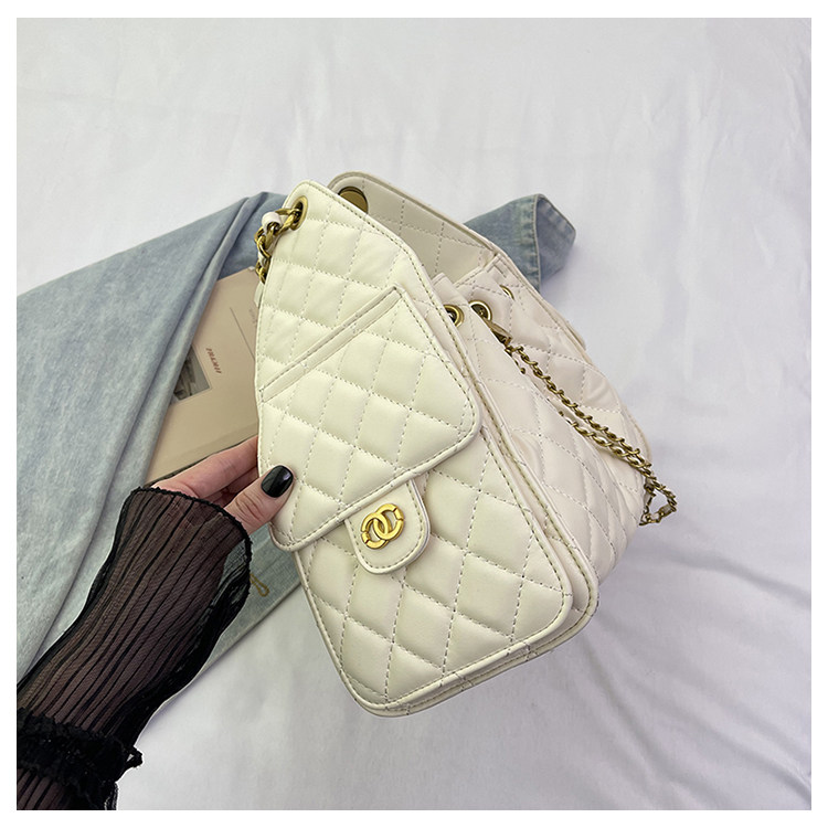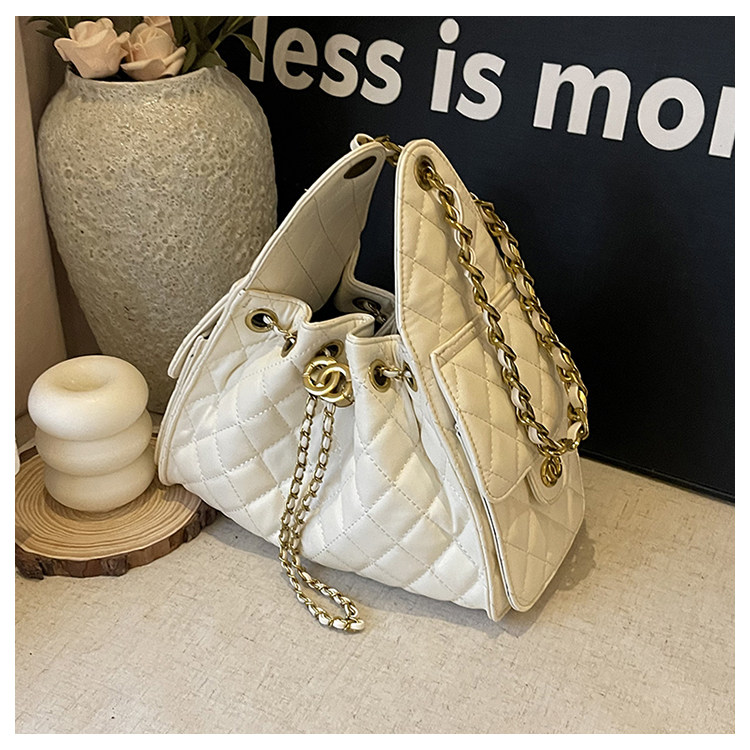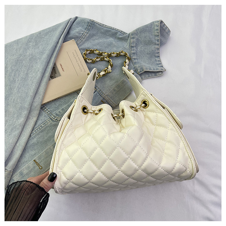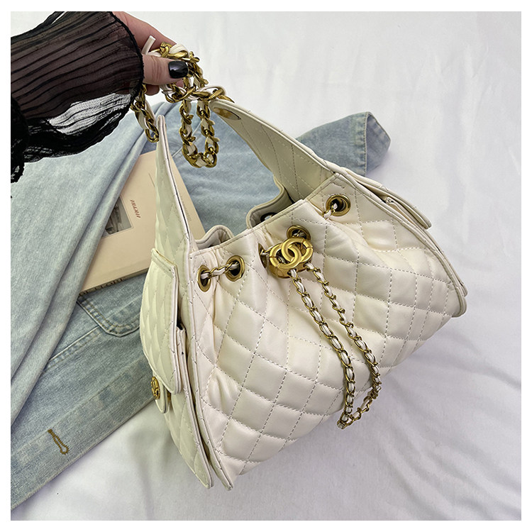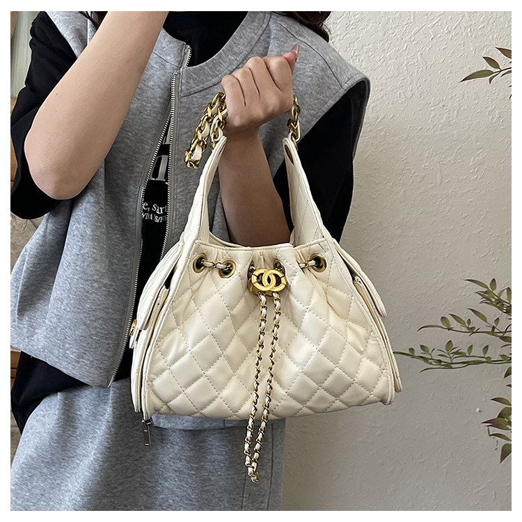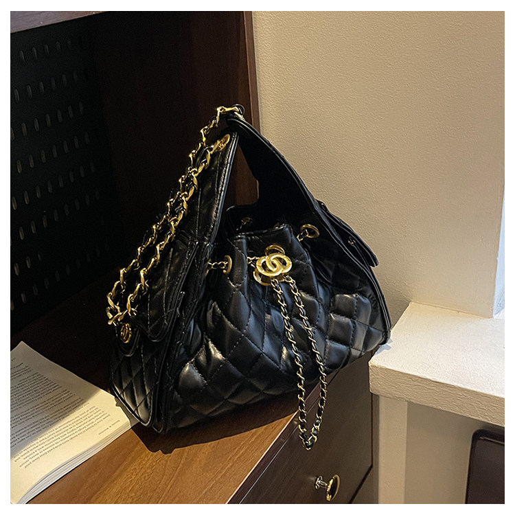 菱格復古單肩腋下包大容量時尚流浪包水桶抽繩包早春鏈條斜後後背包女