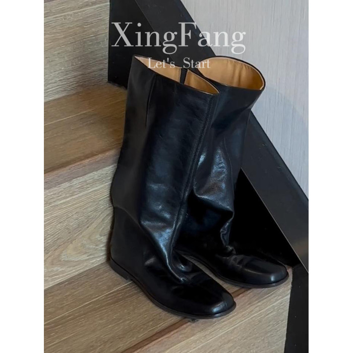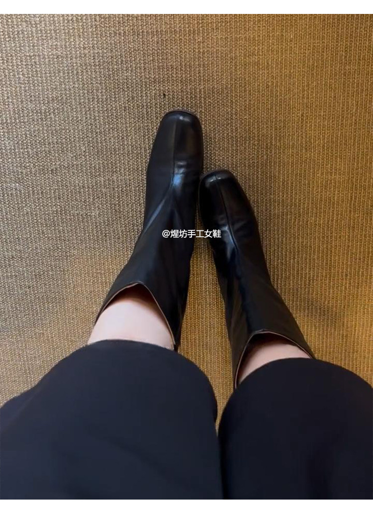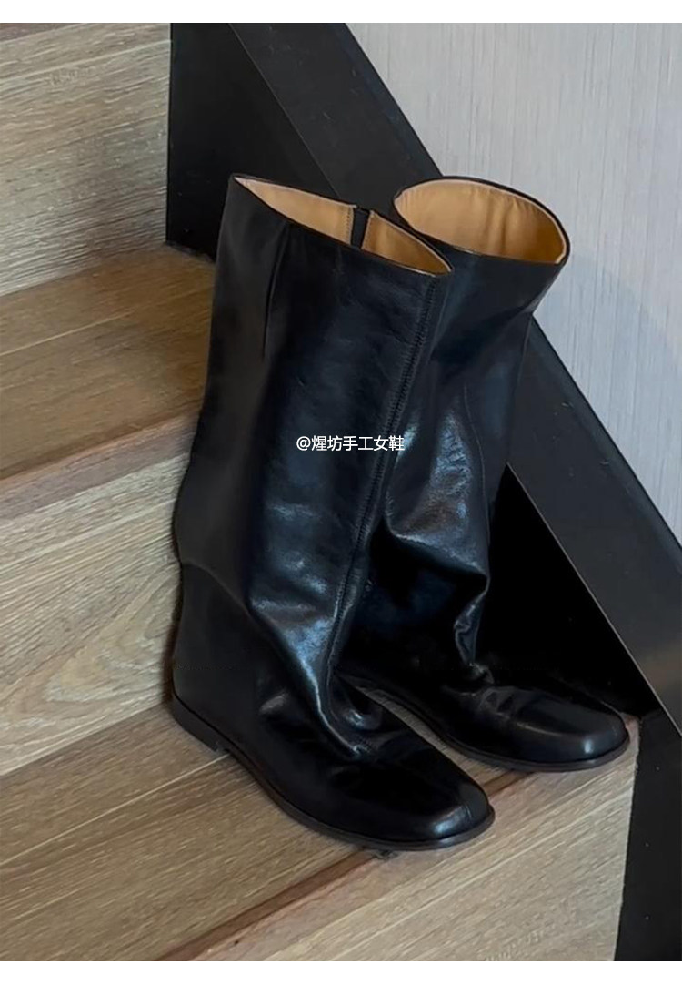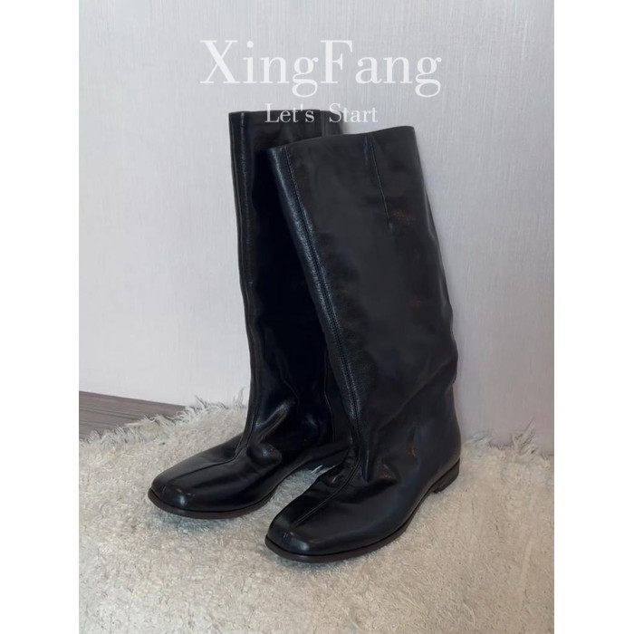 牛皮版~復古方頭不過膝高筒騎士靴女新款真皮平底顯瘦長筒堆堆靴