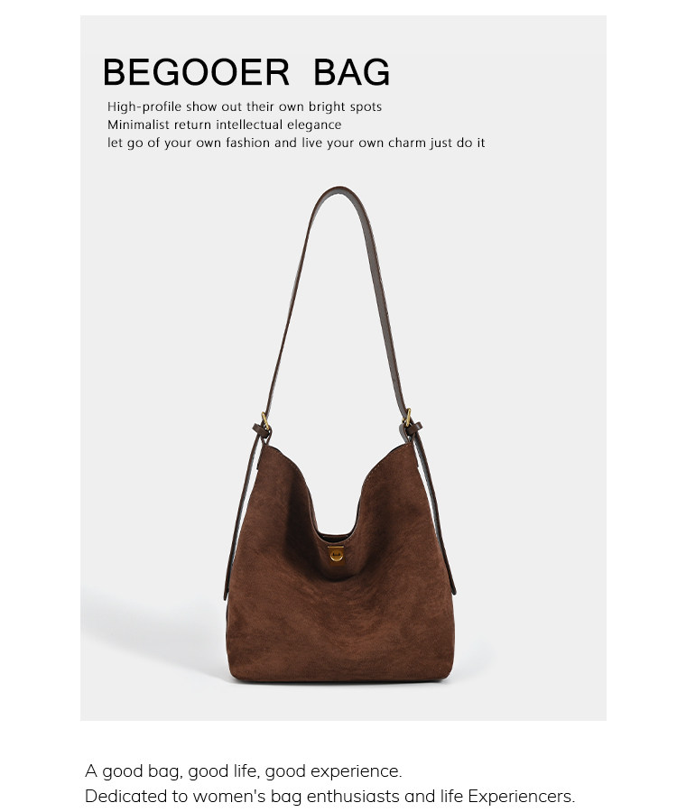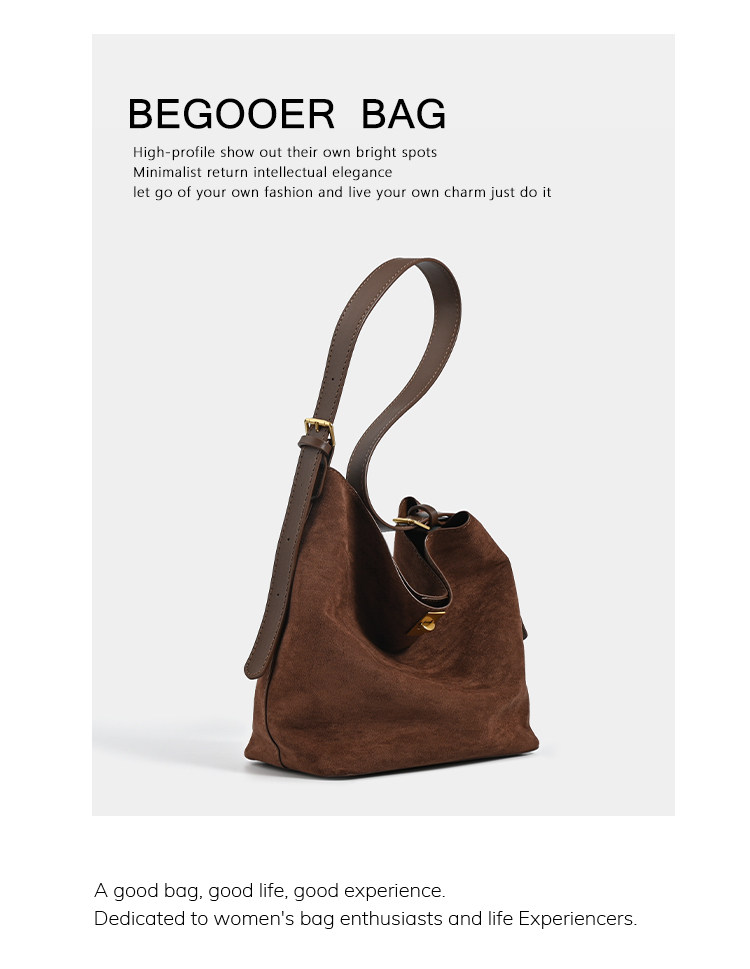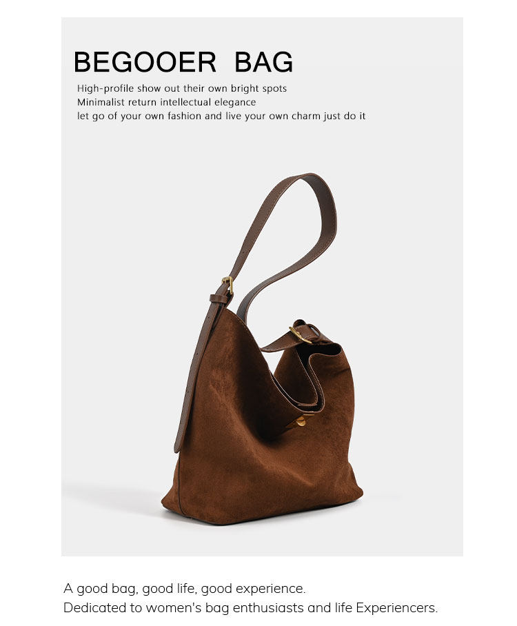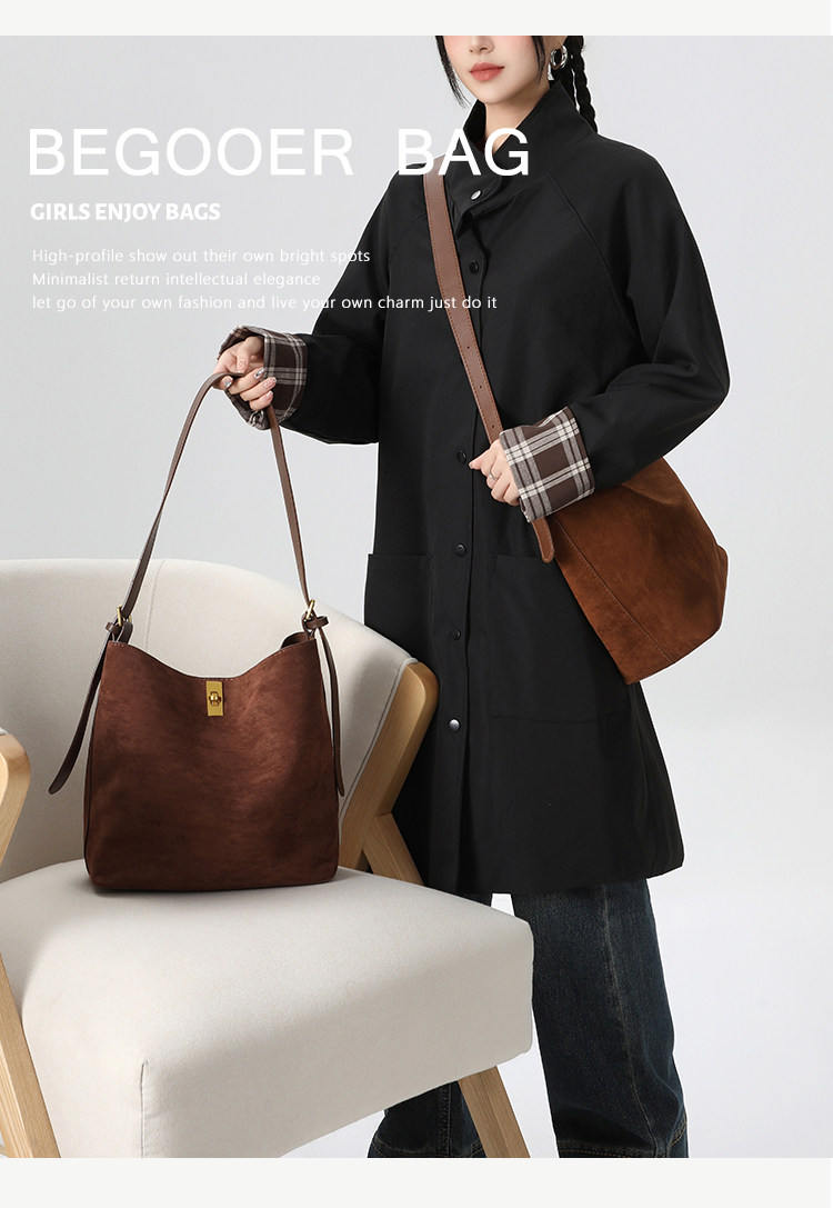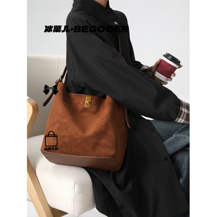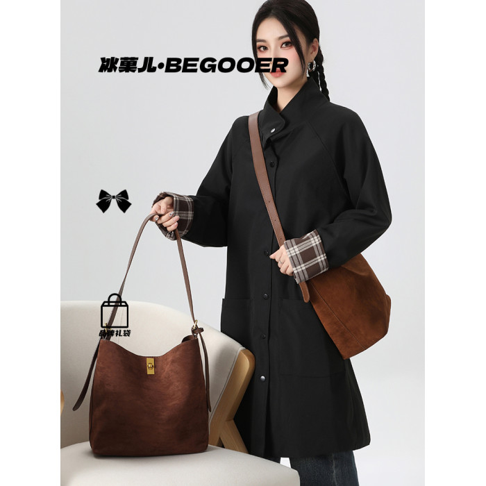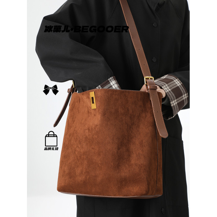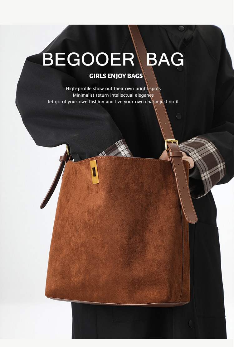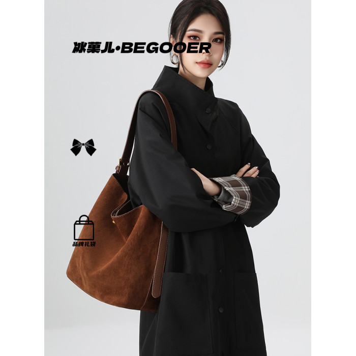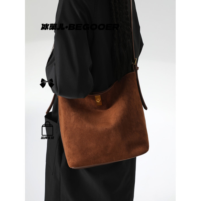 BEGOOER復古絨面通勤水桶包女2026春夏新款氣質大容量單肩斜後後背包