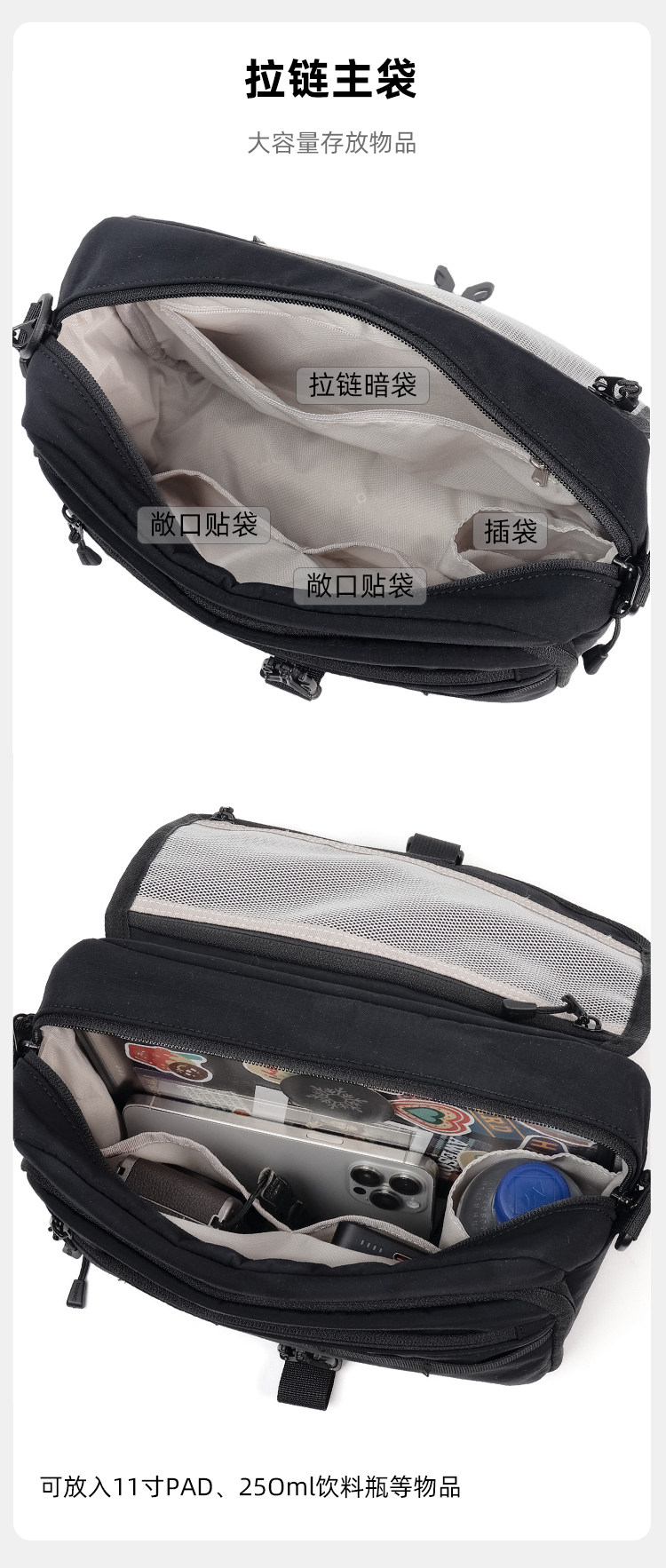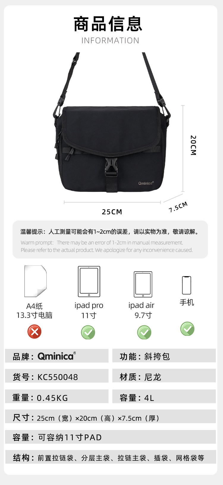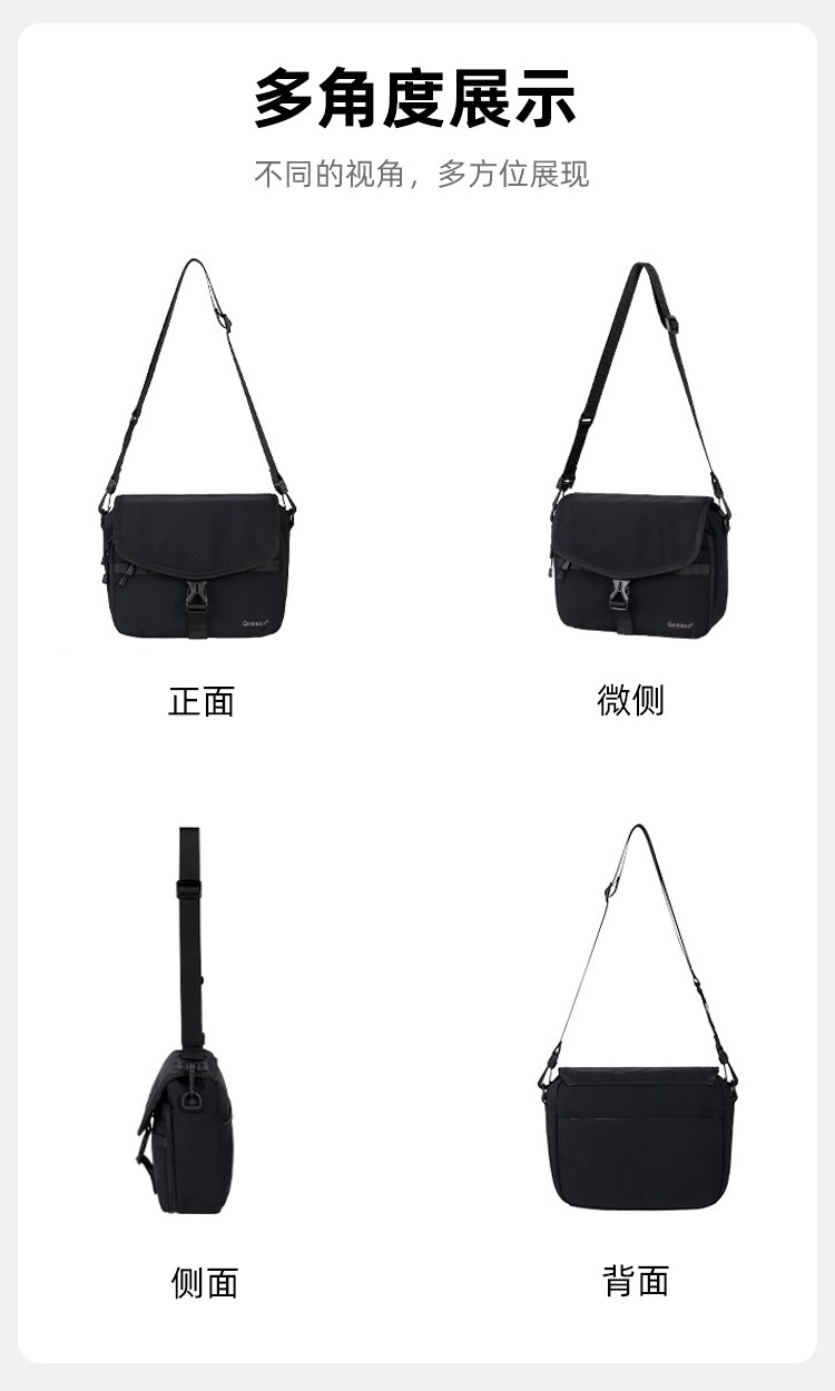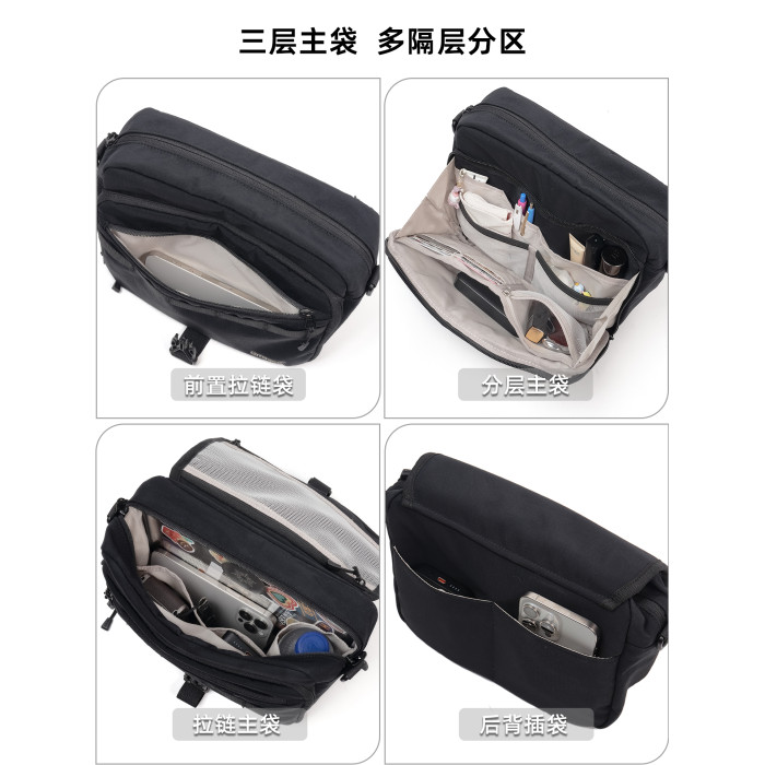 Qminica時尚通勤單肩包11寸PAD收納休閒多隔層郵差包防潑水斜後後背包