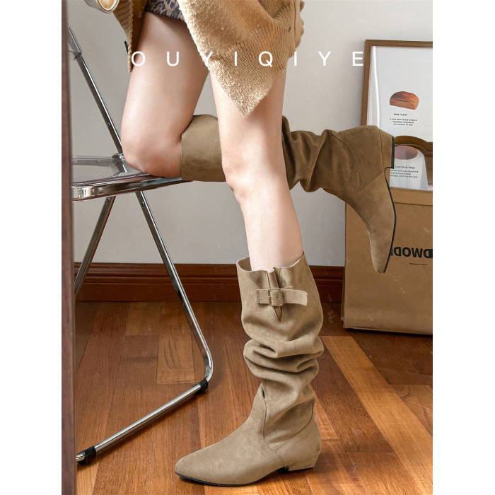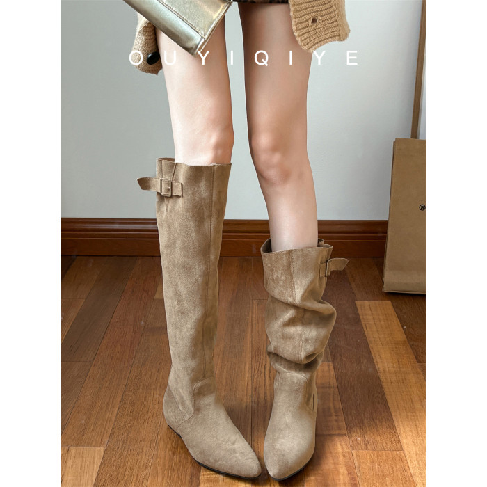 羊皮版~超火絕美長靴不過膝麂皮尖頭騎士靴女夏季薄款顯瘦堆堆靴