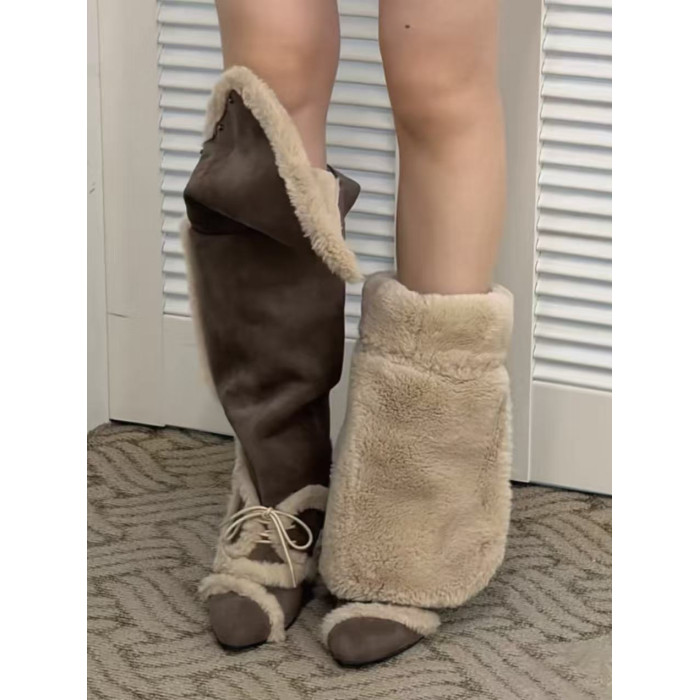 牛皮版2026冬季新款加絨加厚毛毛靴雪地靴女小衆坡跟兩穿過膝長靴