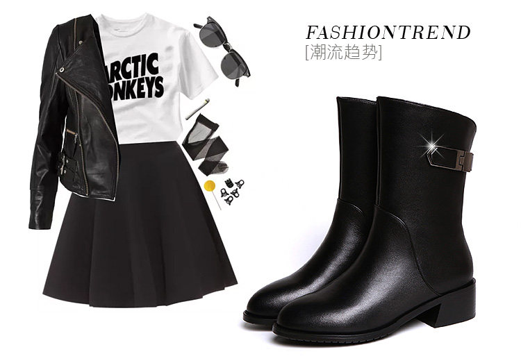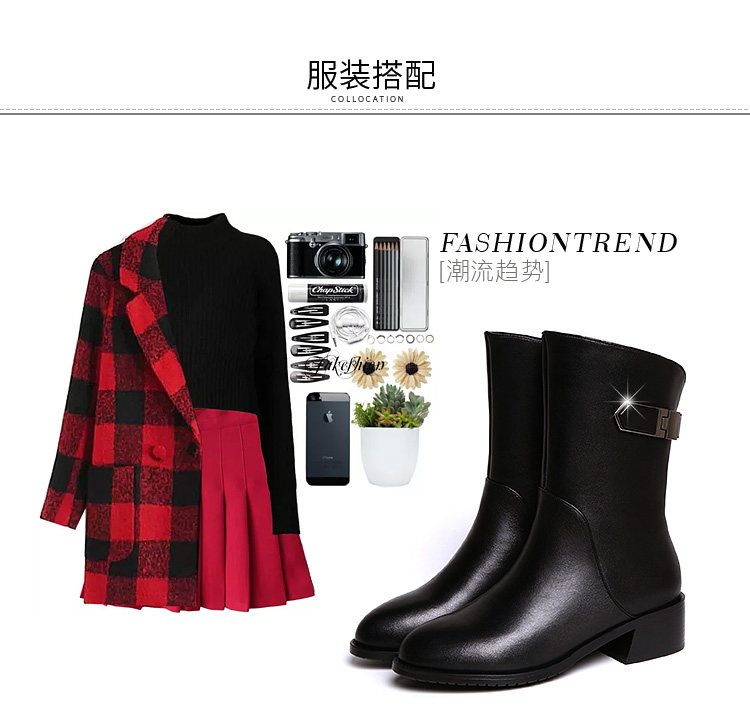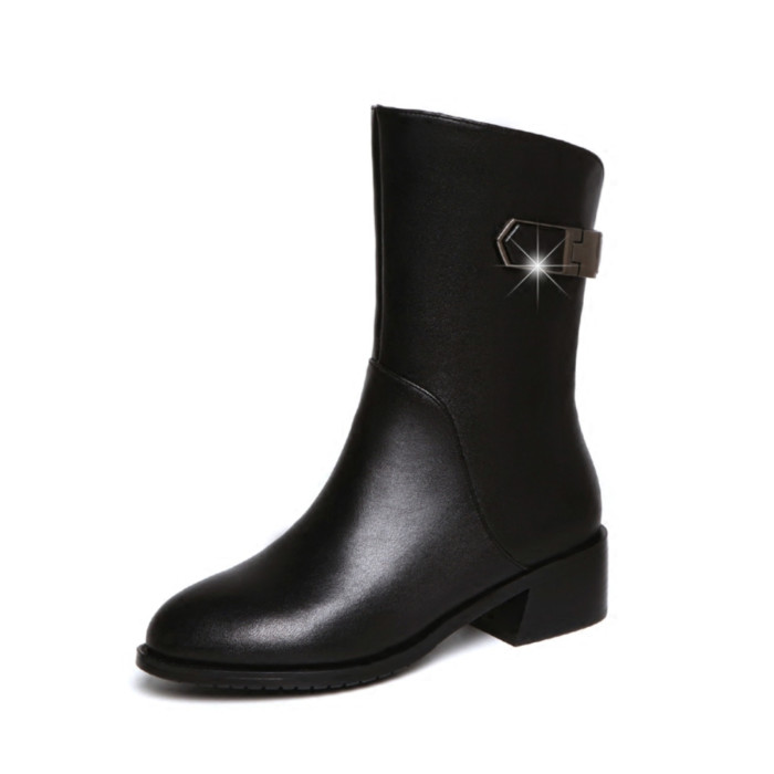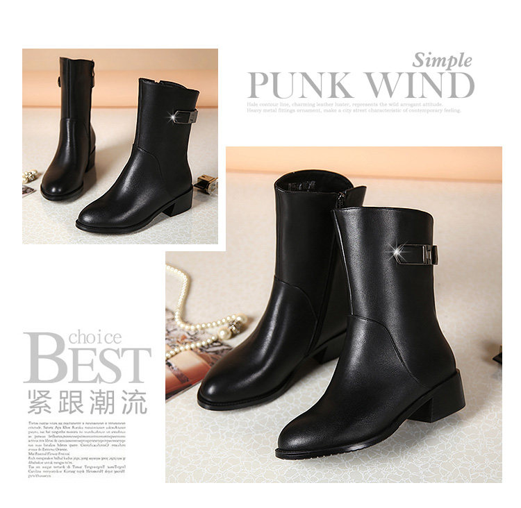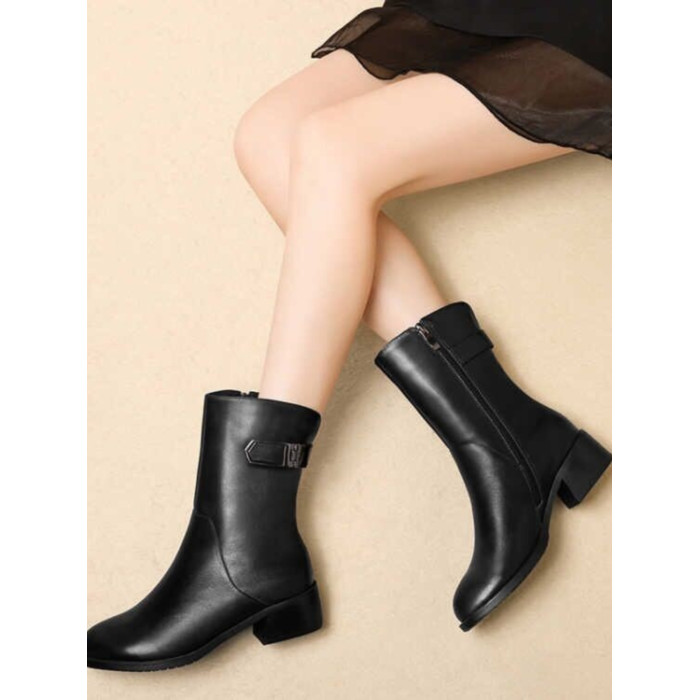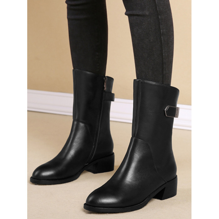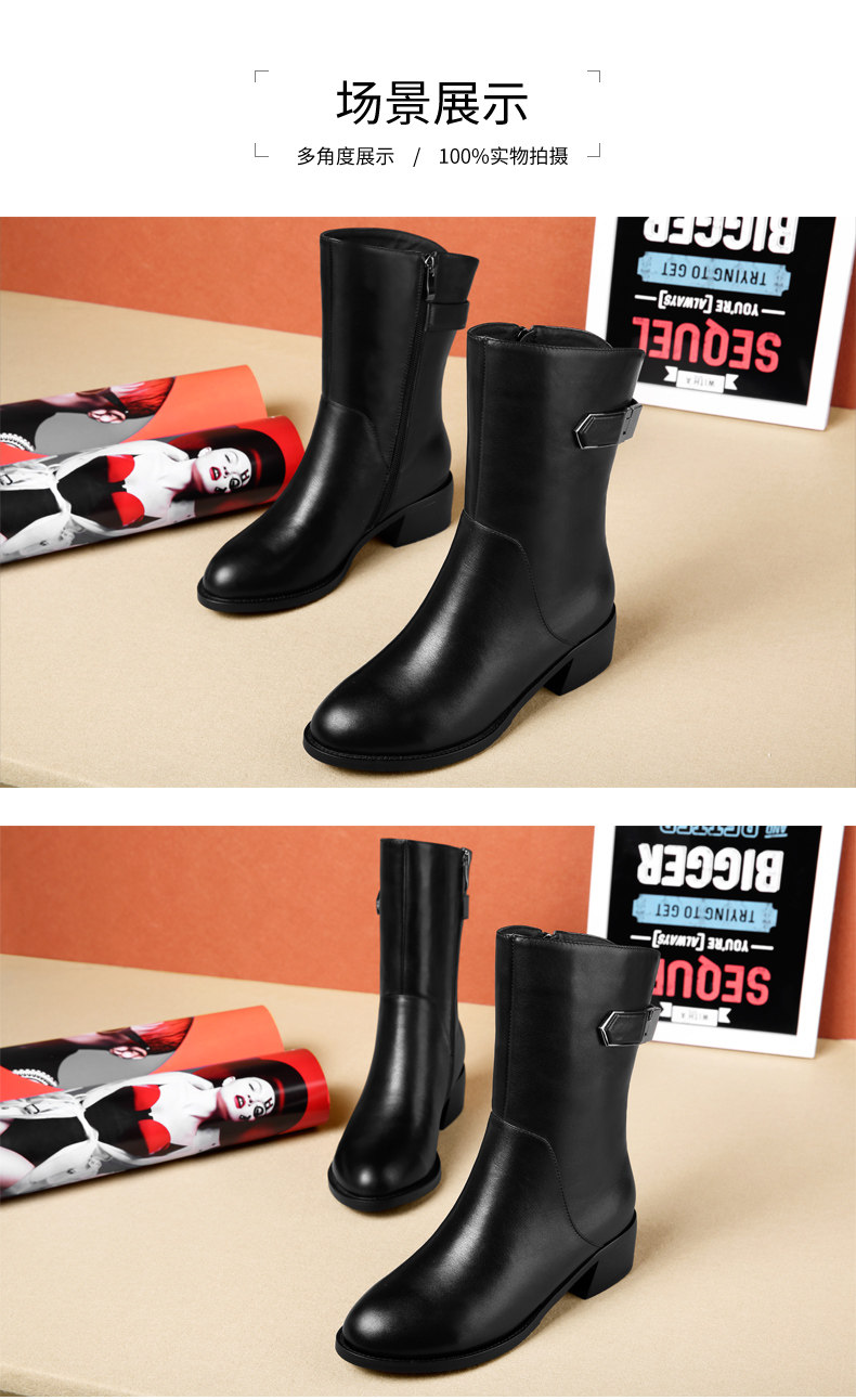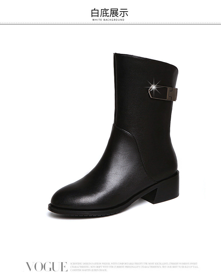 2024秋冬新款真皮粗跟短靴女平底中筒靴厚底馬丁靴百搭女靴子加絨
