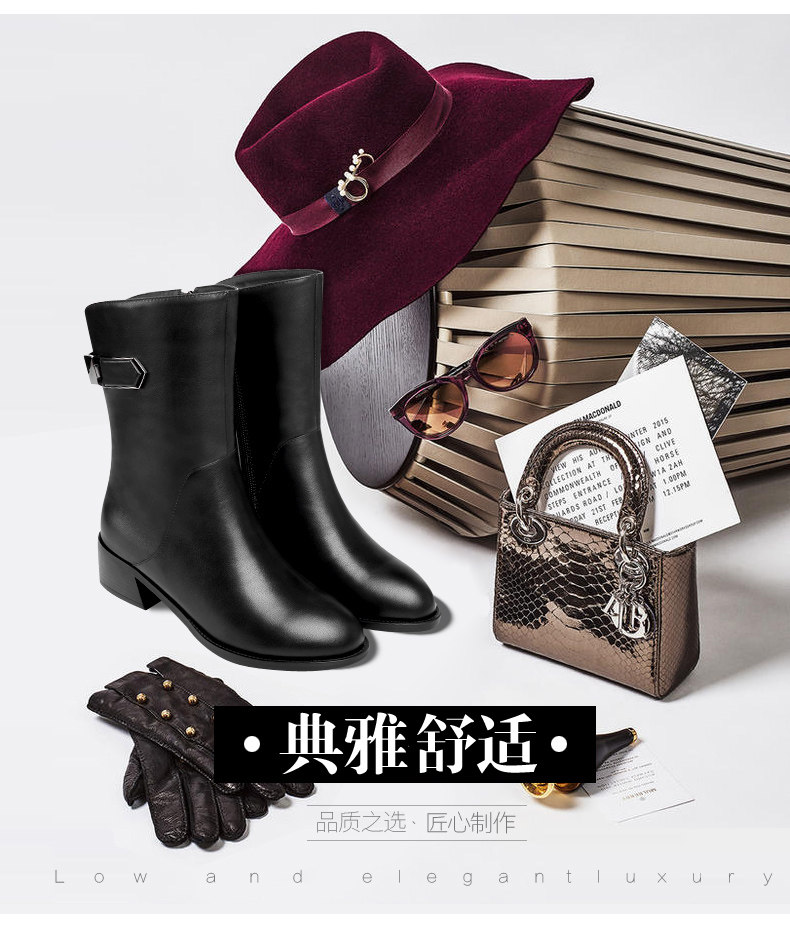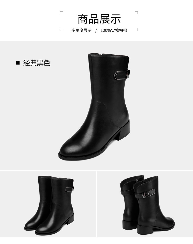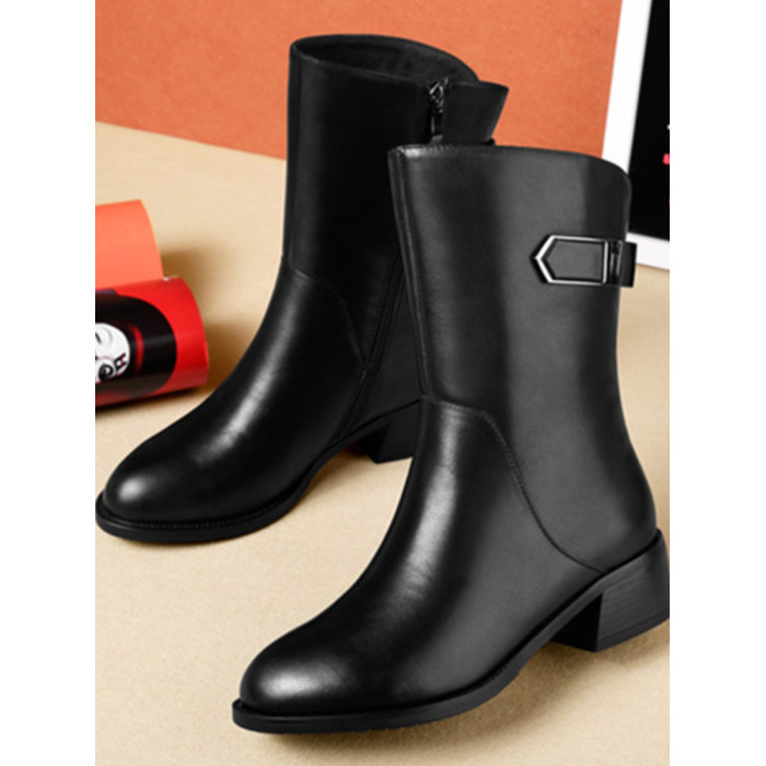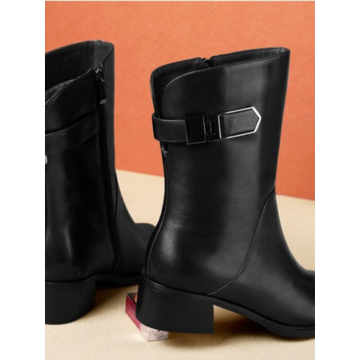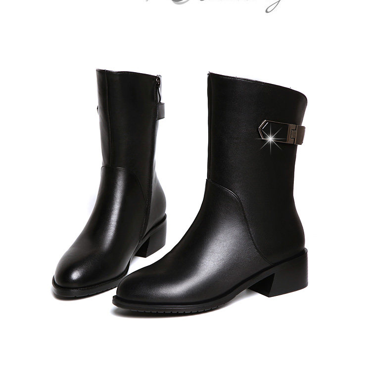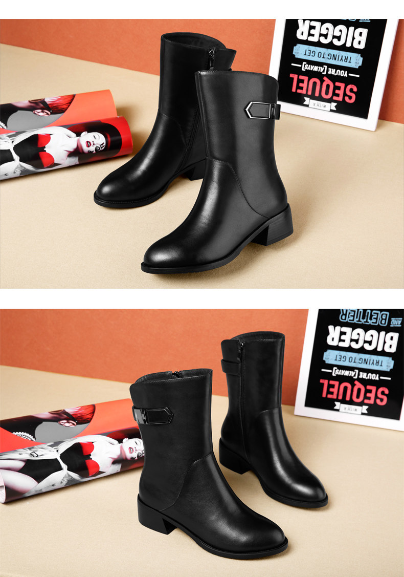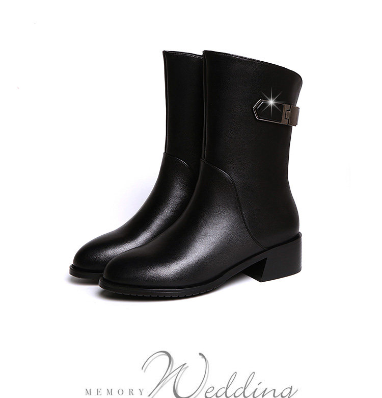 2024秋冬新款真皮粗跟短靴女平底中筒靴厚底馬丁靴百搭女靴子加絨