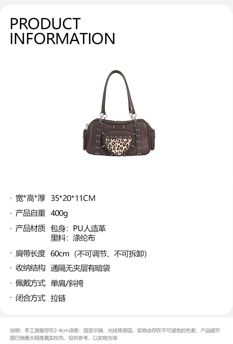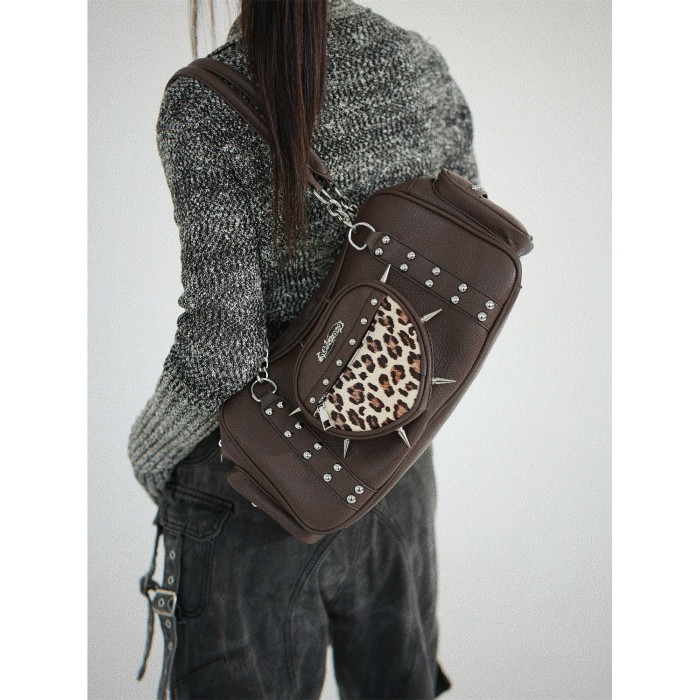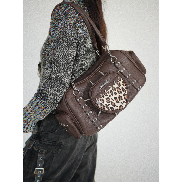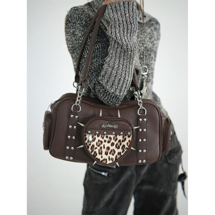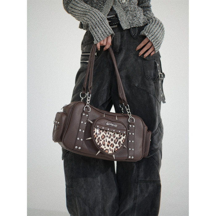 uustudio小衆原創設計秋冬復古亞比哥特風辣妹鉚釘愛心豹紋腋下包