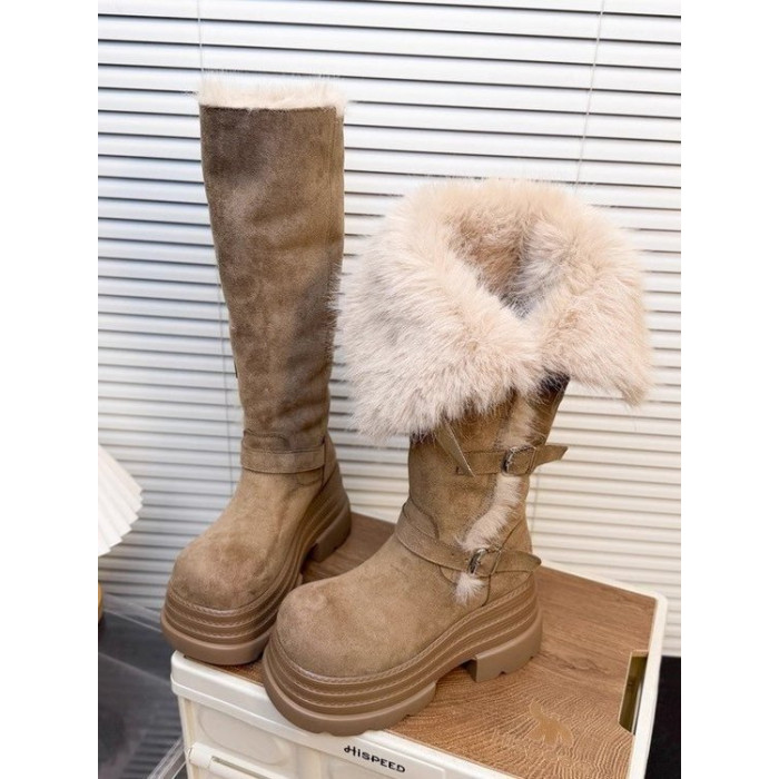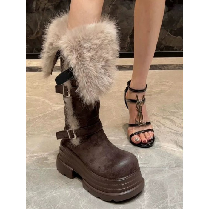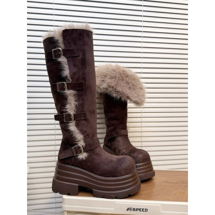 高筒毛毛雪地靴女2026秋季新款復古時尚百搭皮帶釦厚絨保暖棉靴子