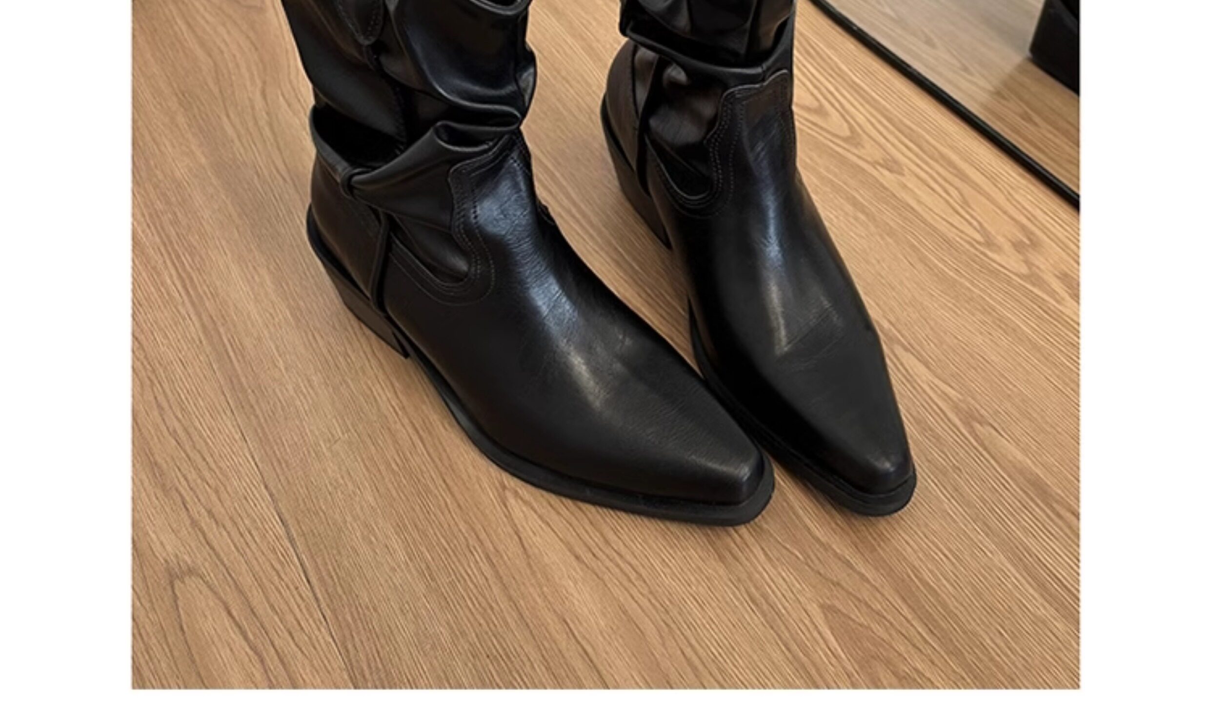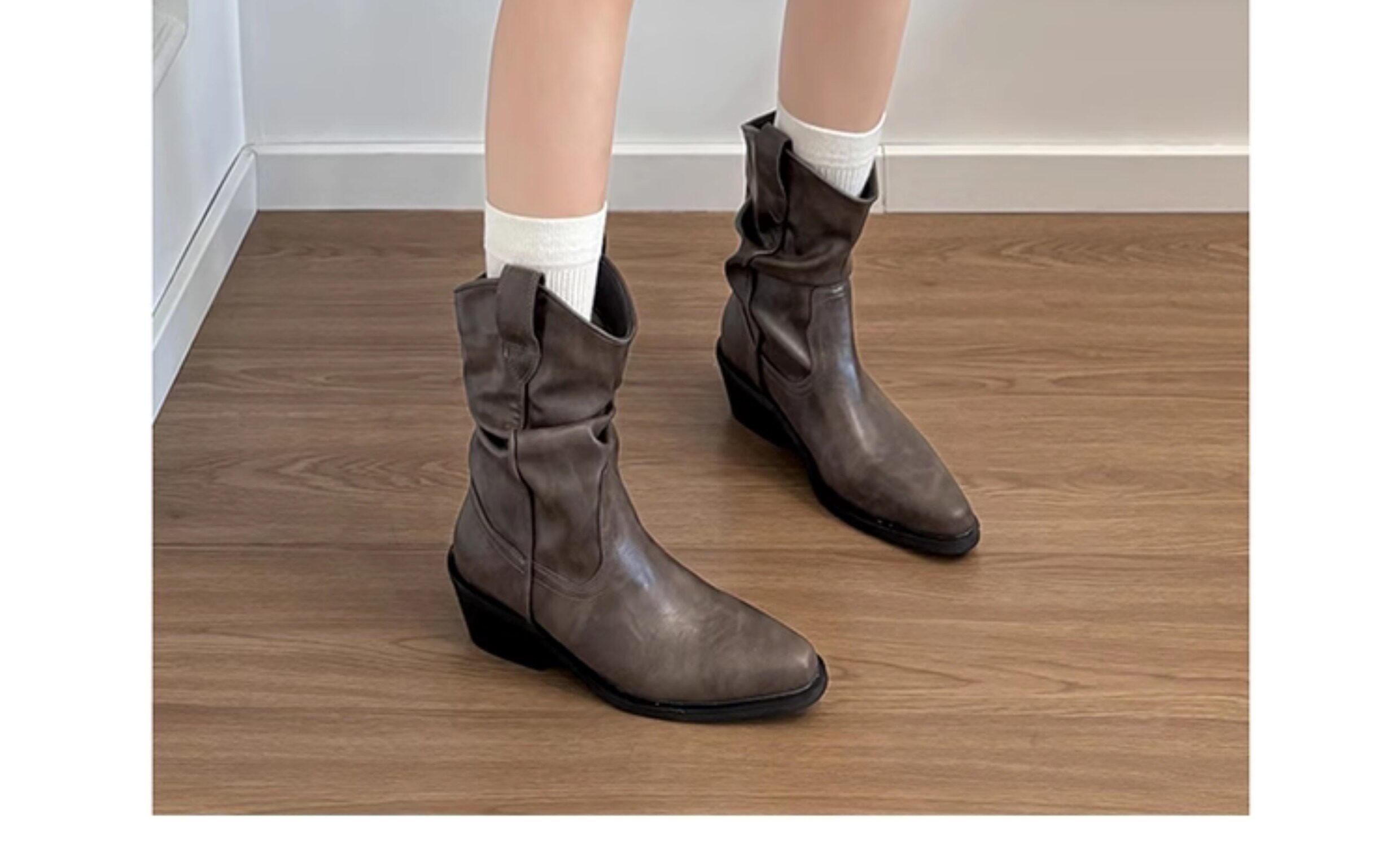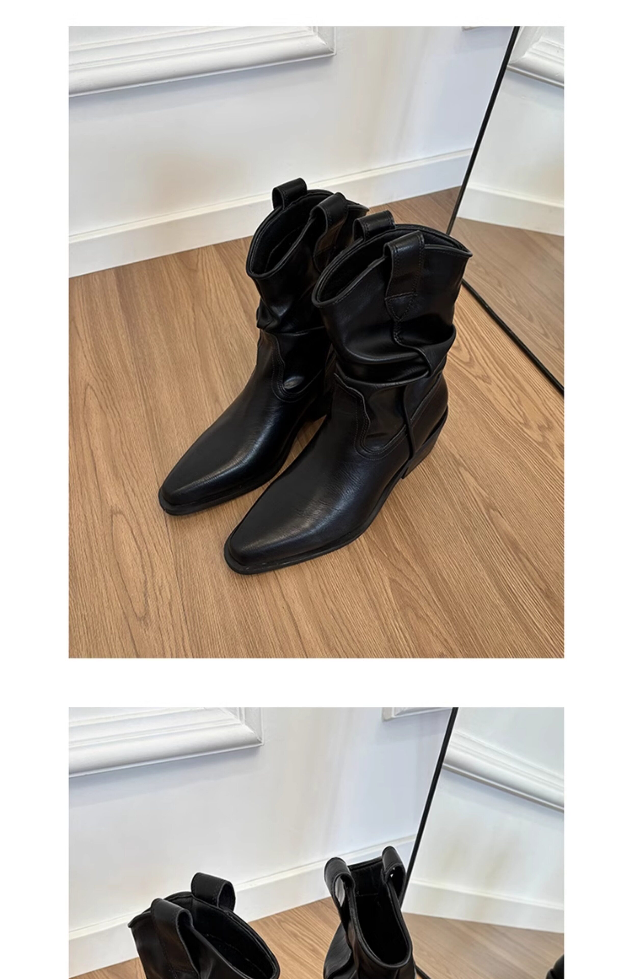 牛皮版~真皮顯瘦尖頭粗跟短靴女秋冬新款堆堆靴西部牛仔靴馬丁靴