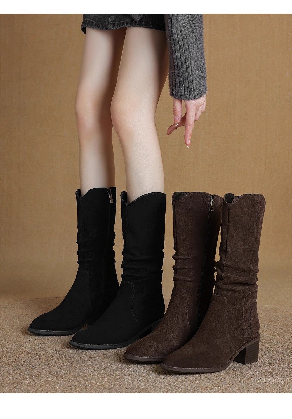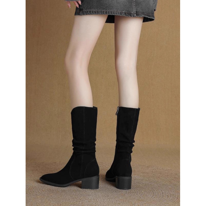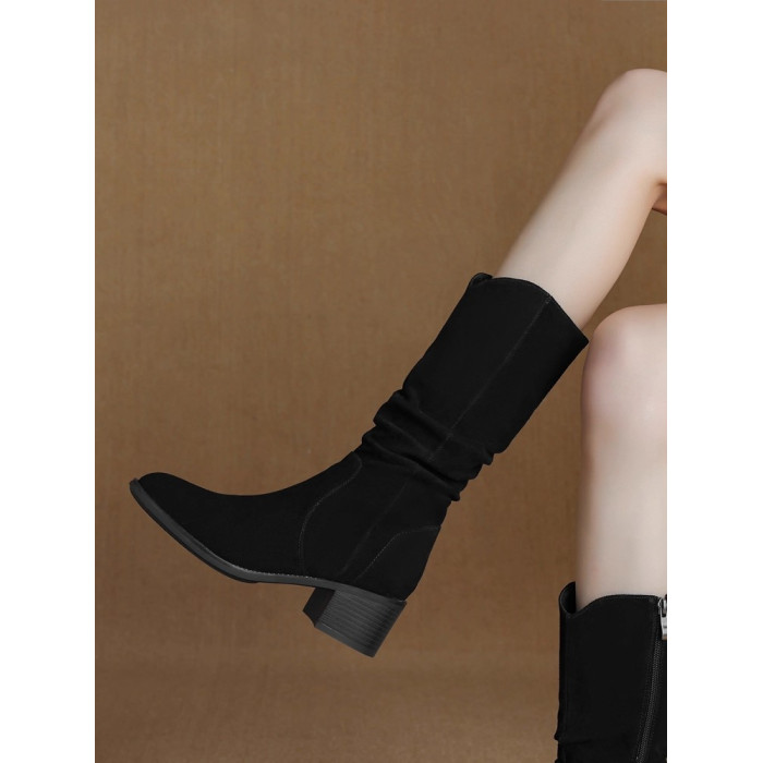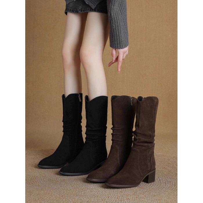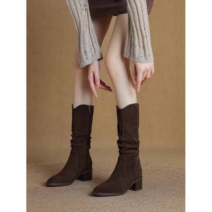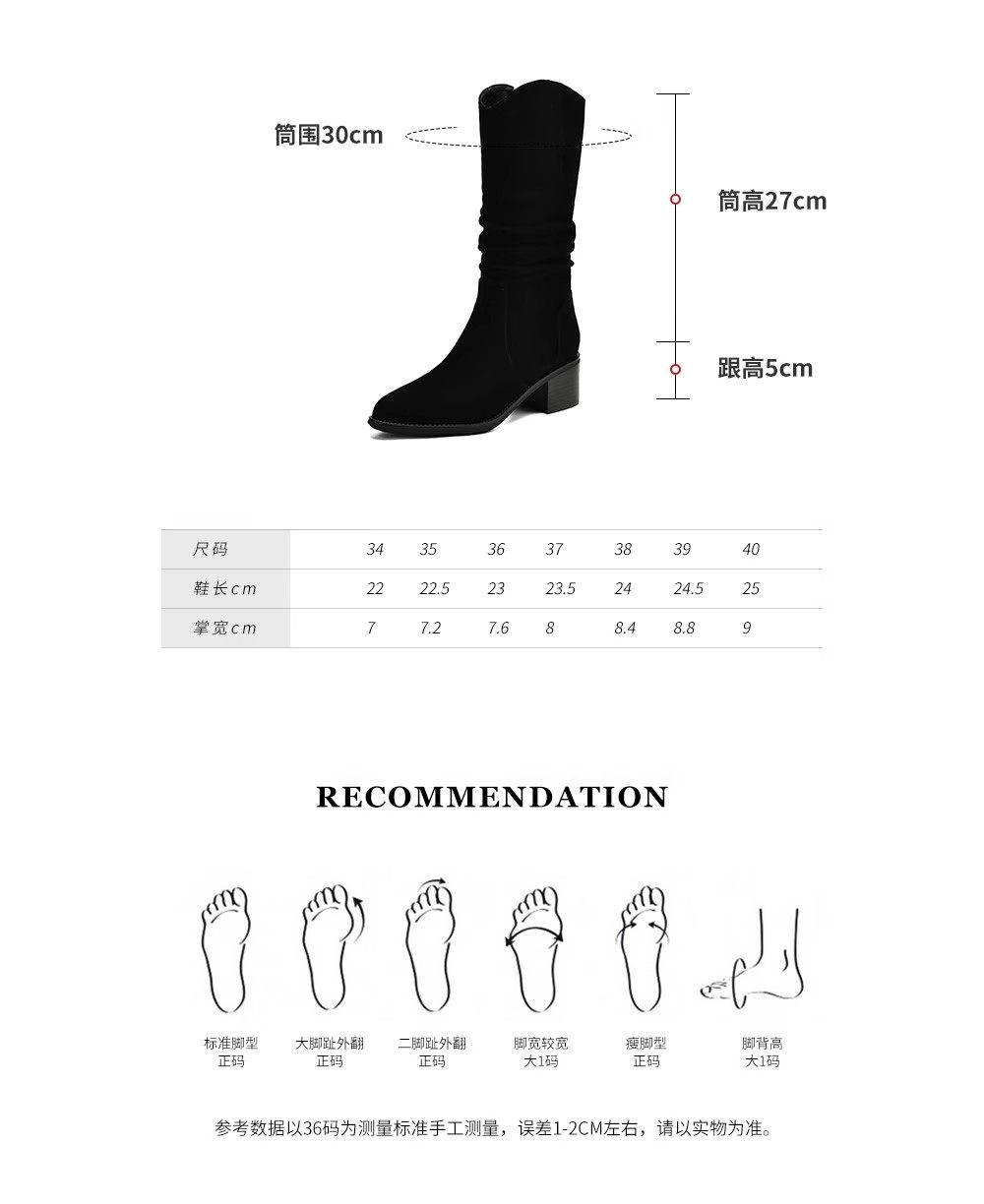 撤櫃品牌女鞋粗跟西部靴復古V口中筒靴女2025秋冬新款中跟堆堆靴
