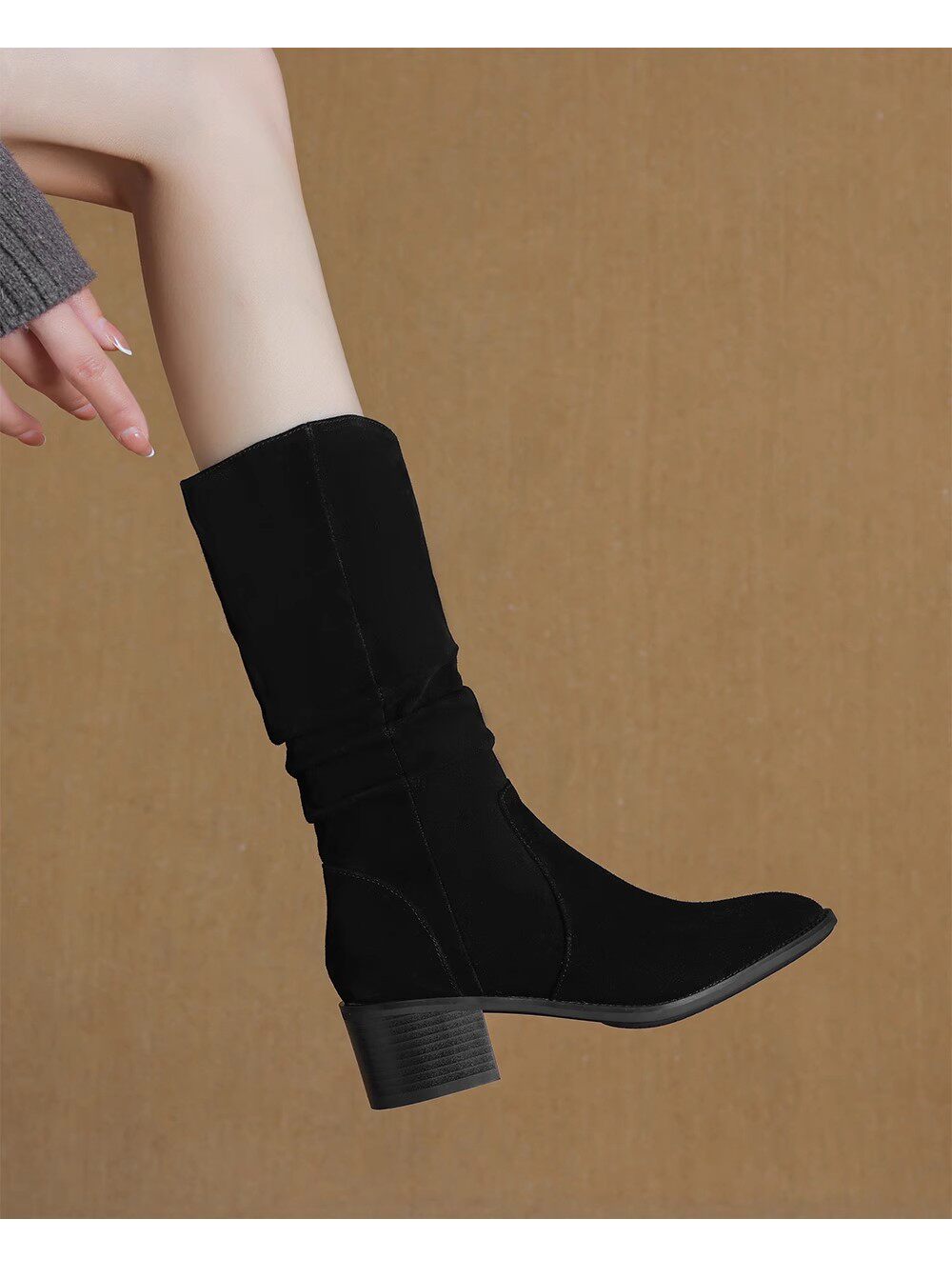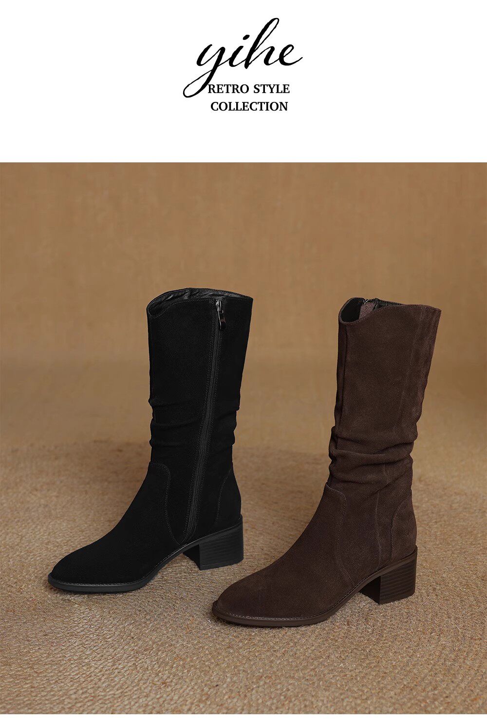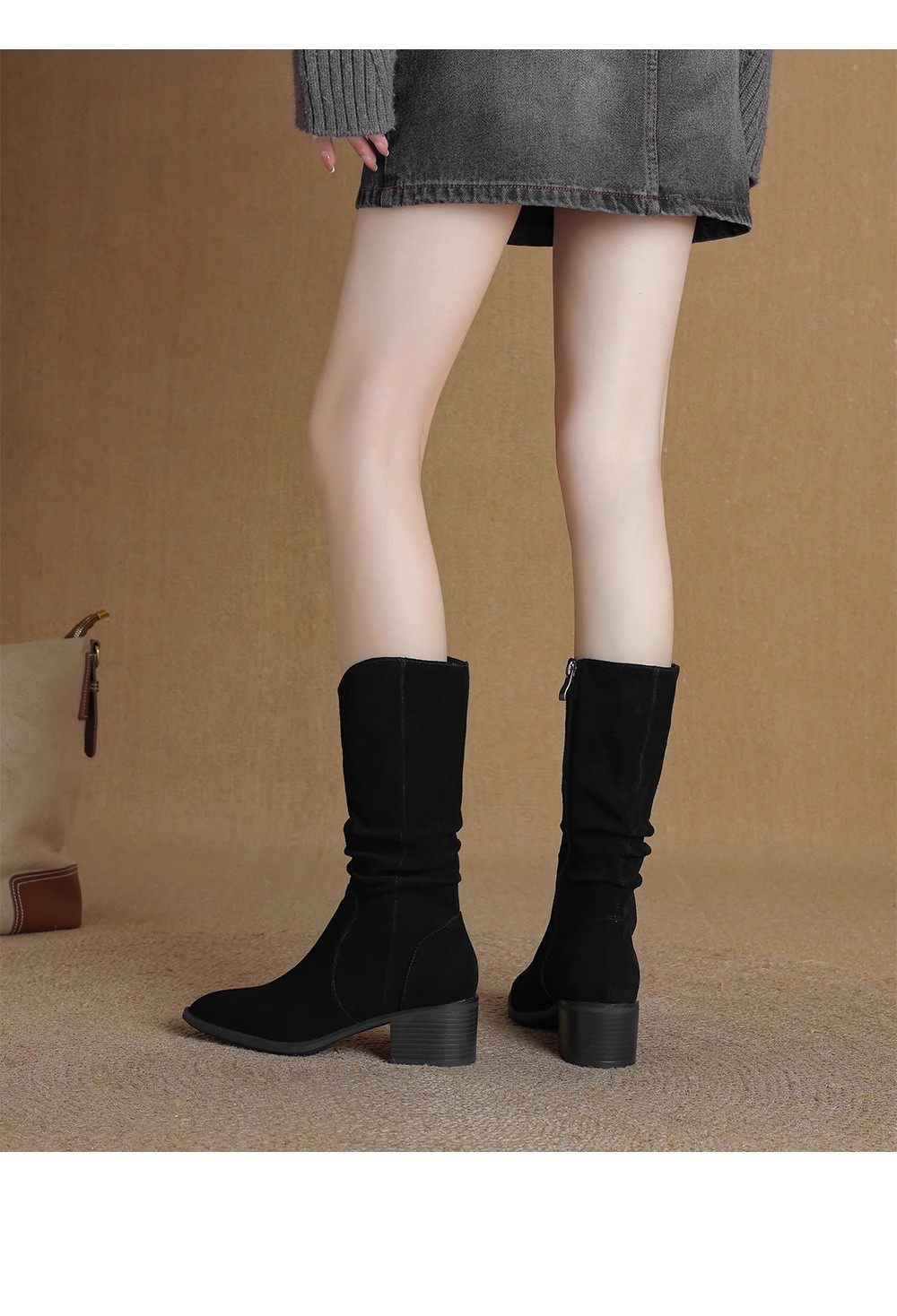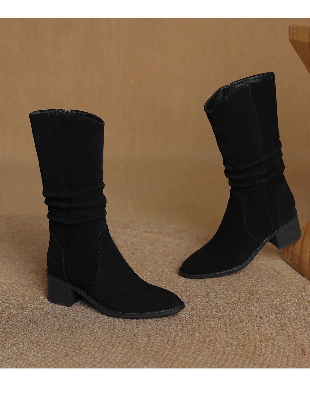 撤櫃品牌女鞋粗跟西部靴復古V口中筒靴女2025秋冬新款中跟堆堆靴