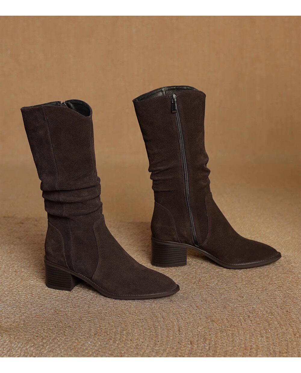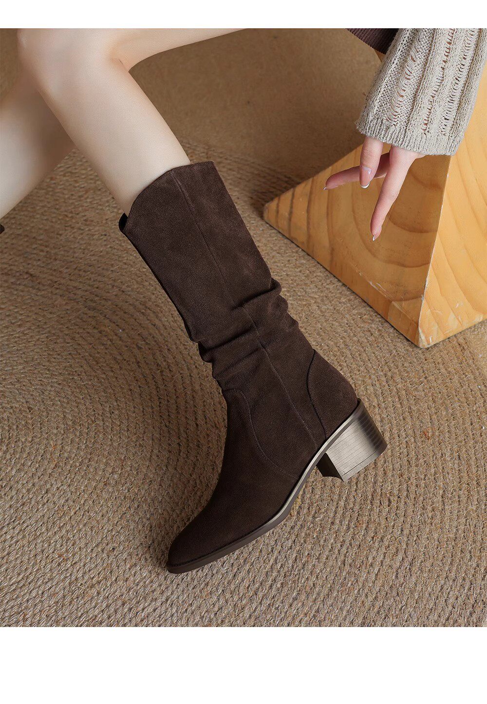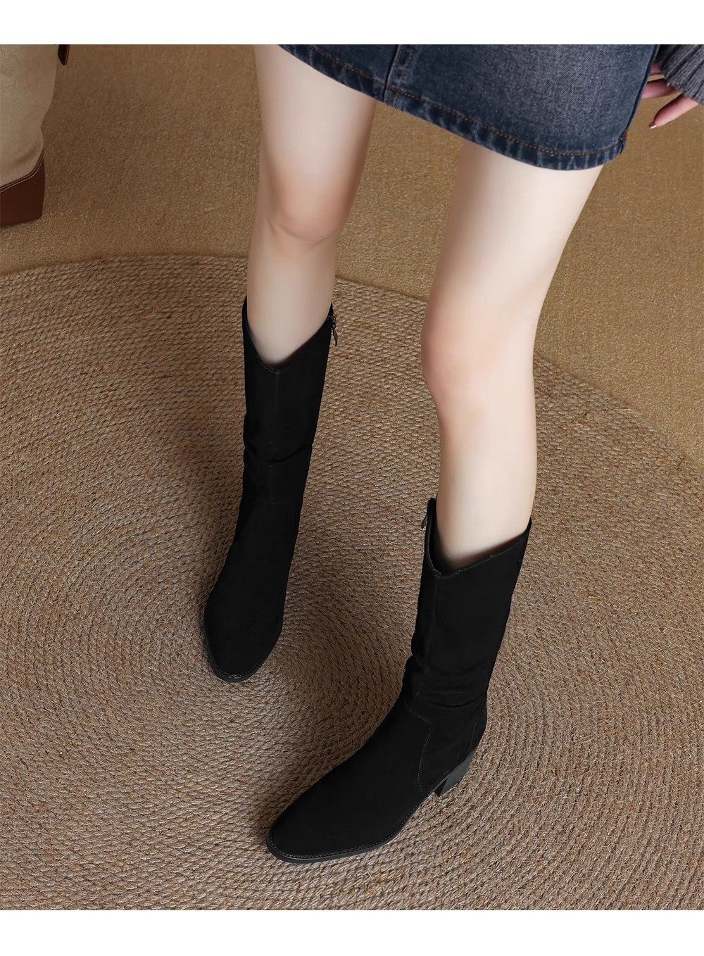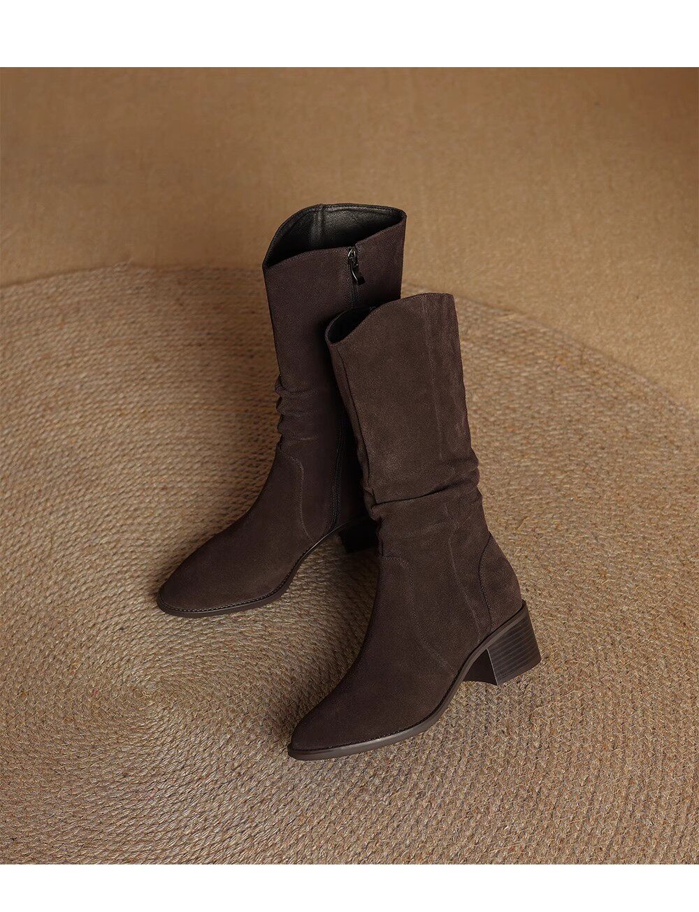 撤櫃品牌女鞋粗跟西部靴復古V口中筒靴女2025秋冬新款中跟堆堆靴