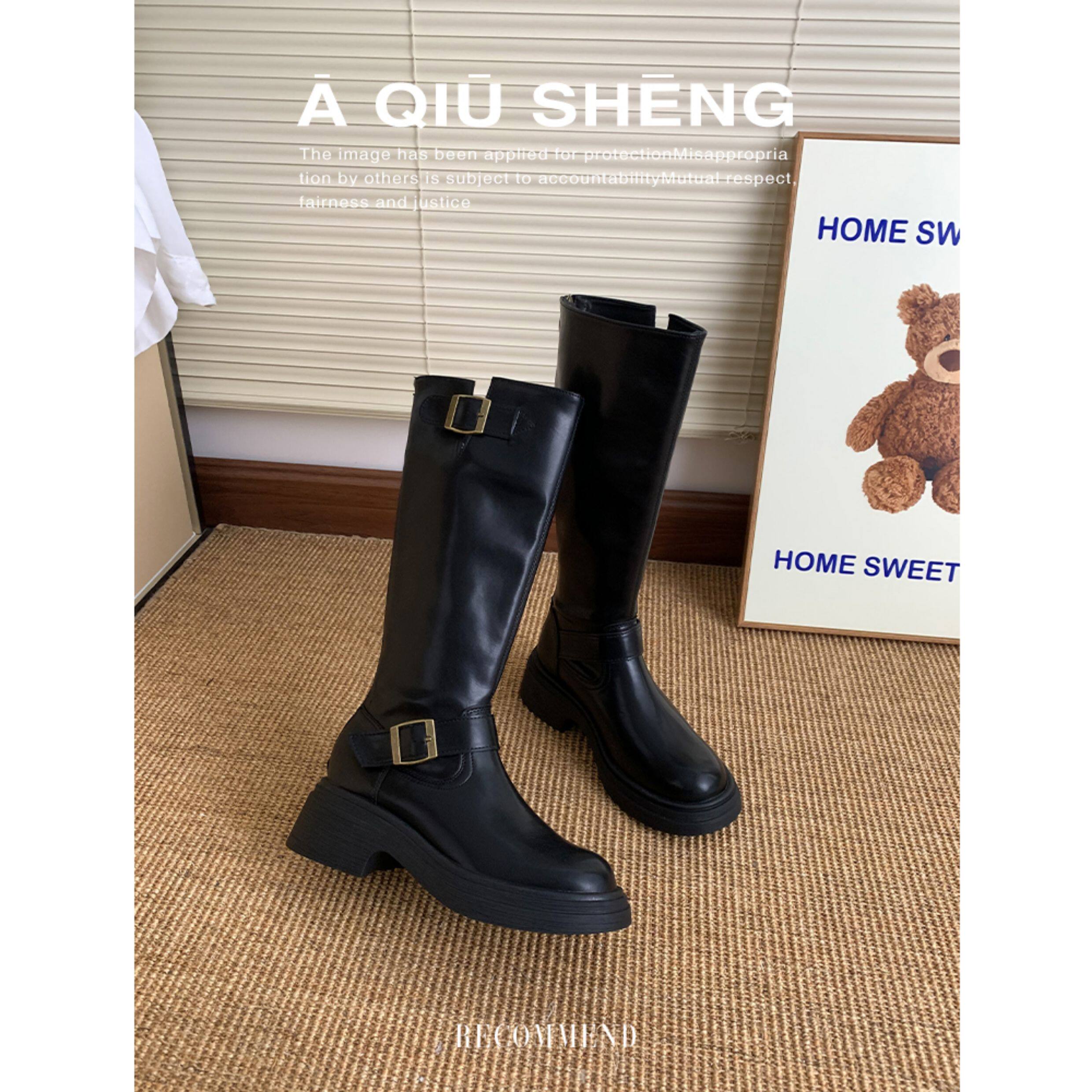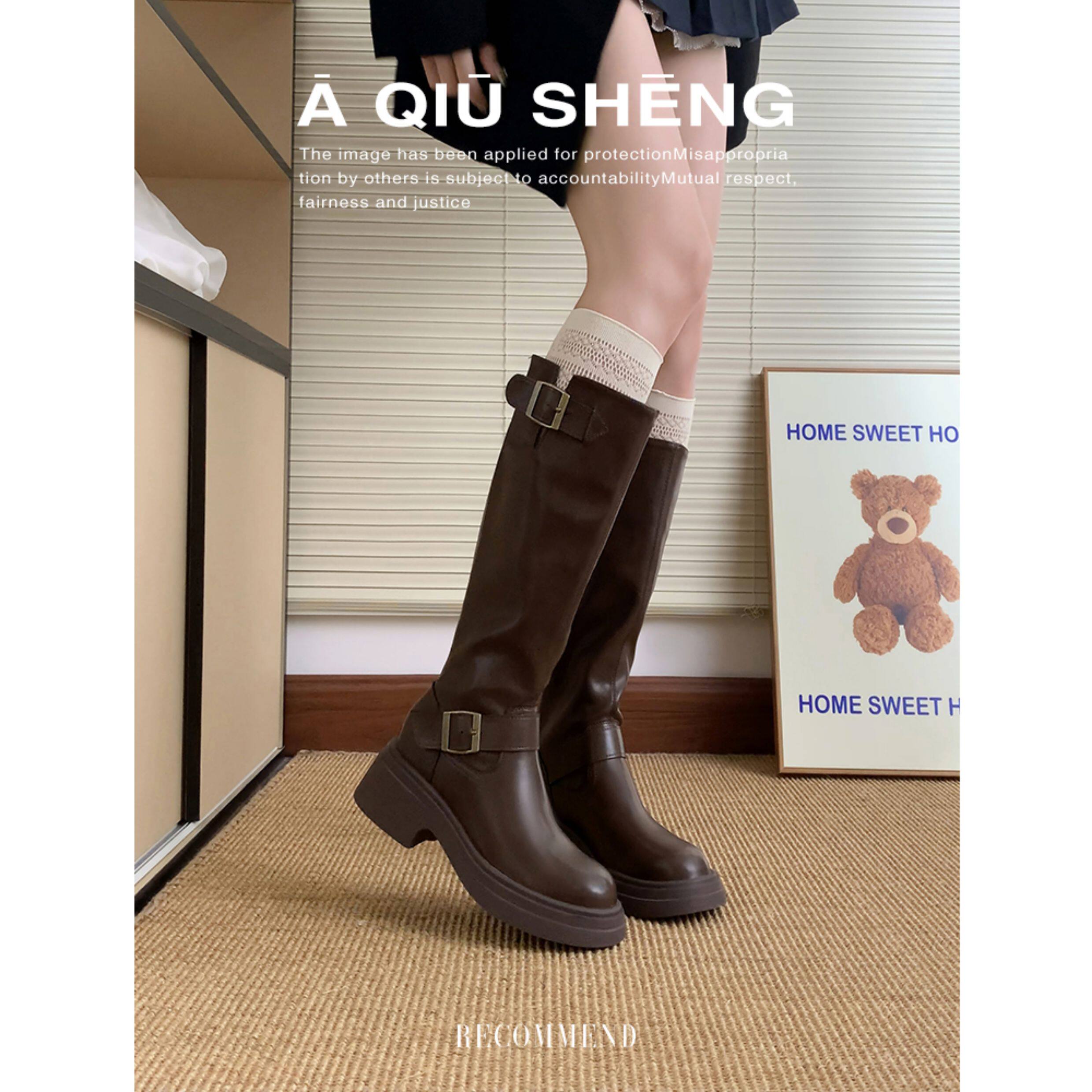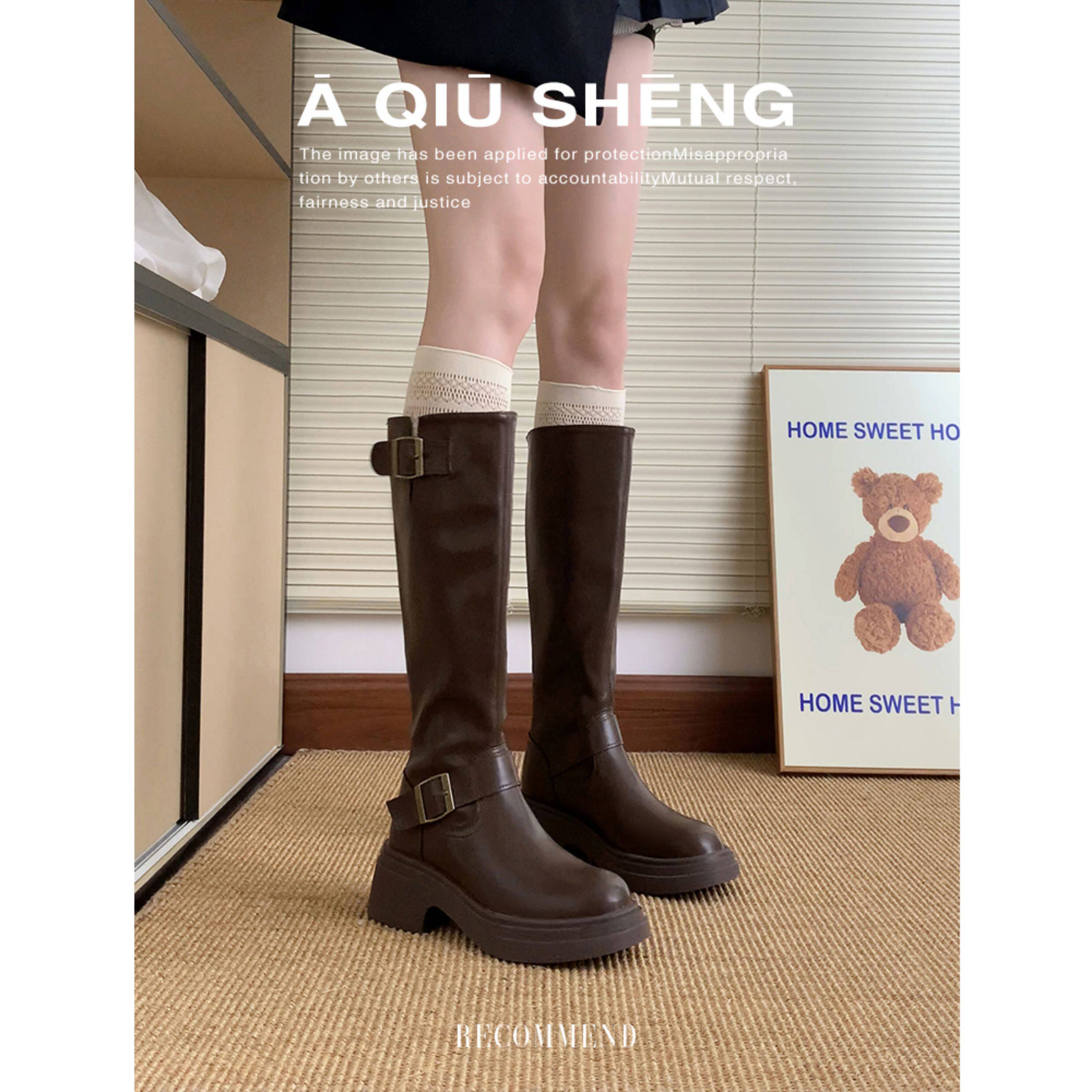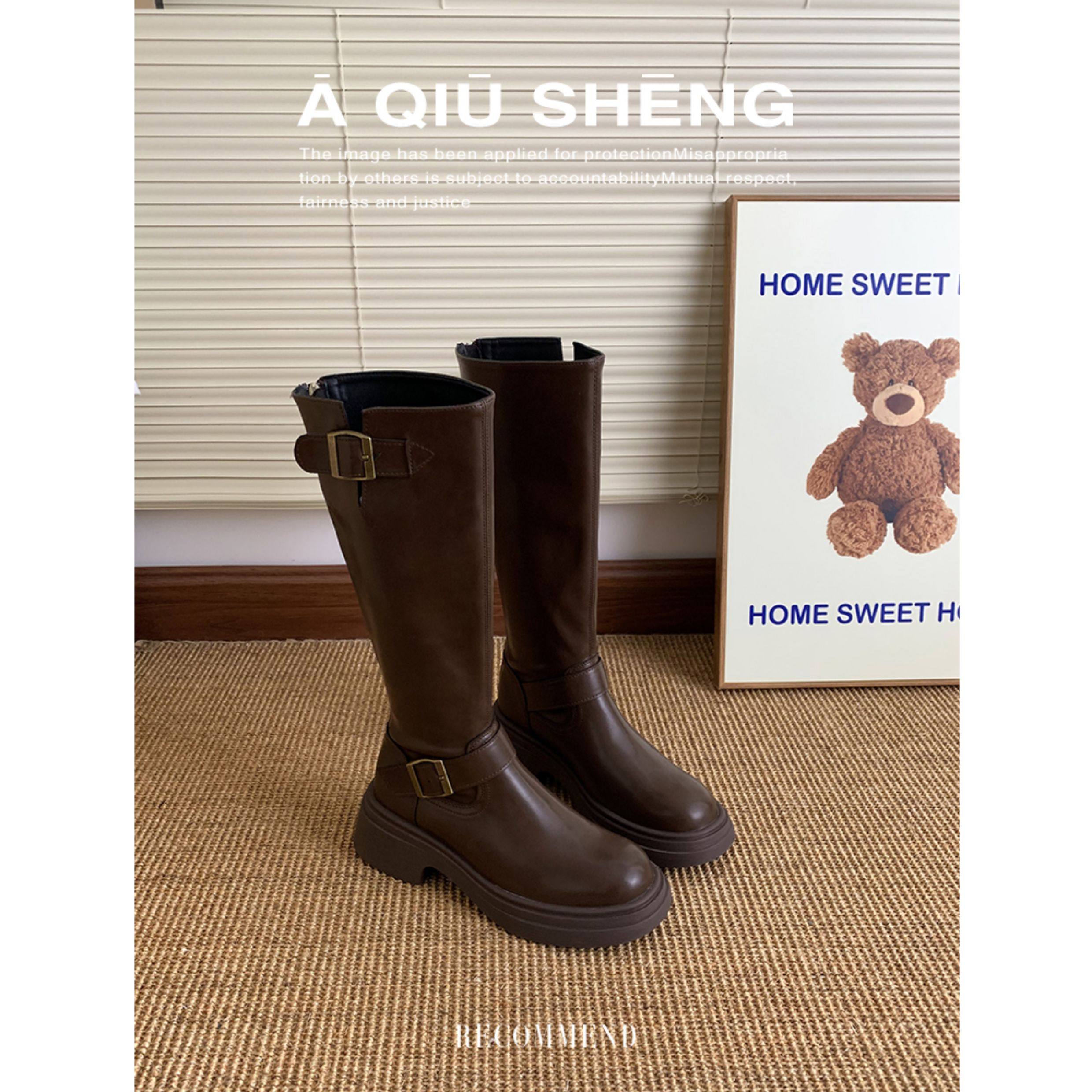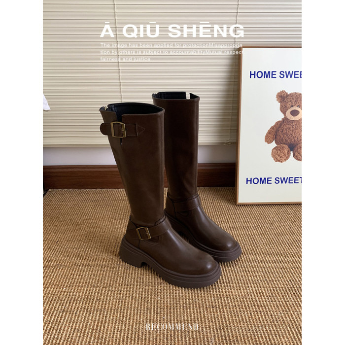 羊皮版~棕色長筒靴女2025年秋冬新款英倫風不過膝長靴厚底騎士靴
